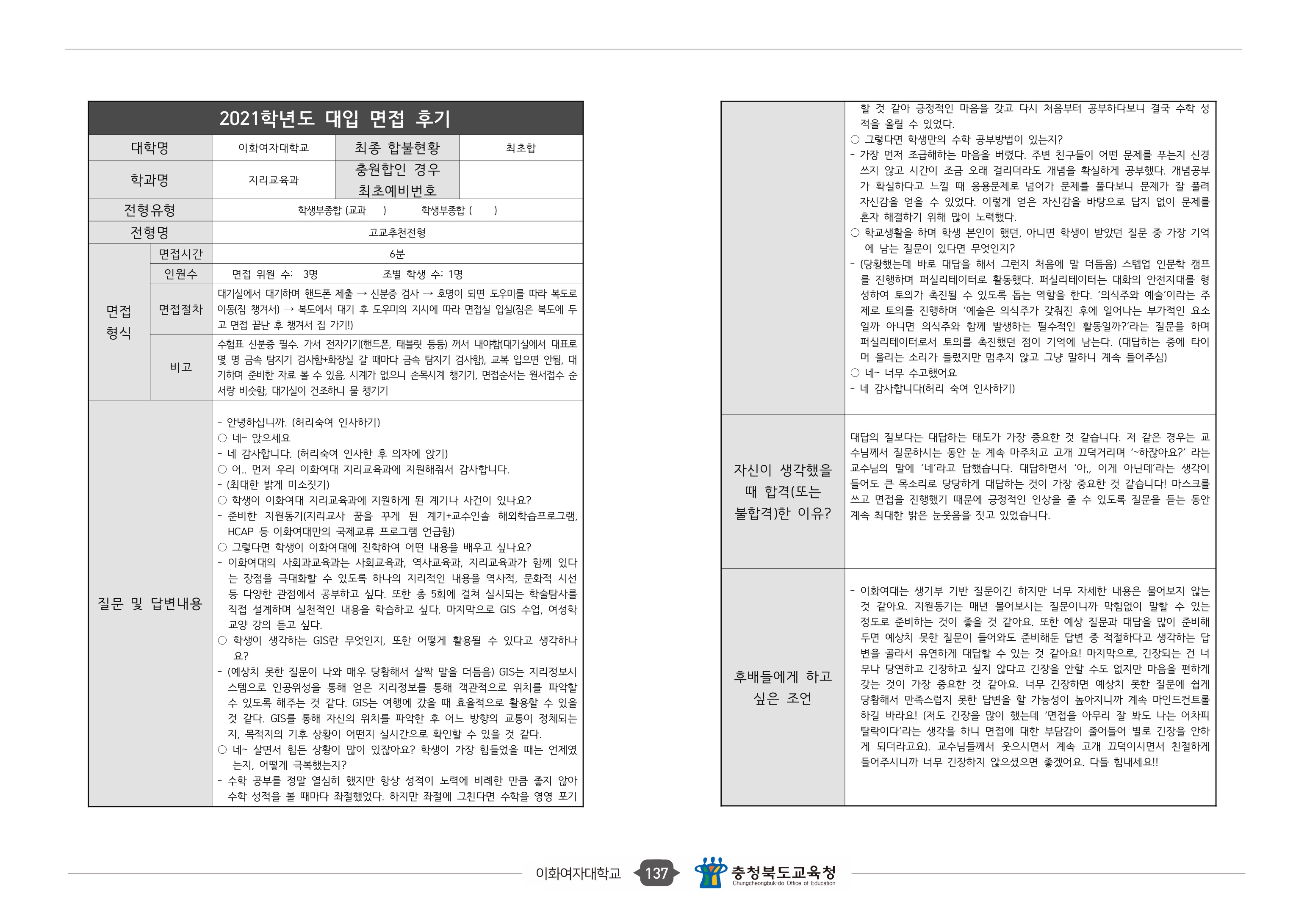 2021학년도 이화여자대학교 면접 후기28 - 지리교육과 2021학년도 이화여자대학교 면접 후기29 - 체육과학부