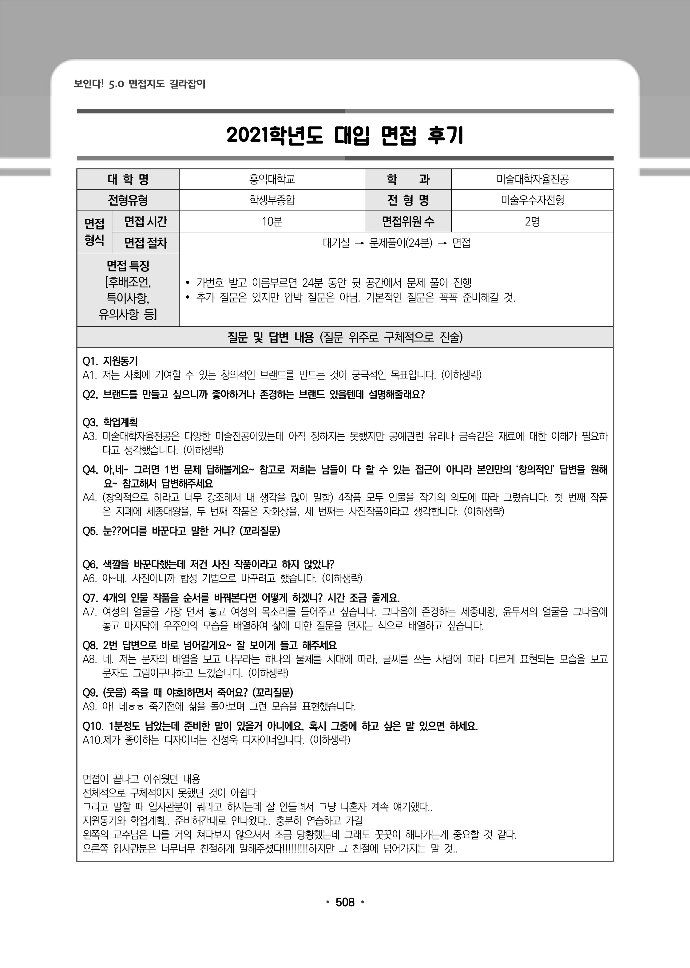 2022학년도 홍익대학교 면접 질문