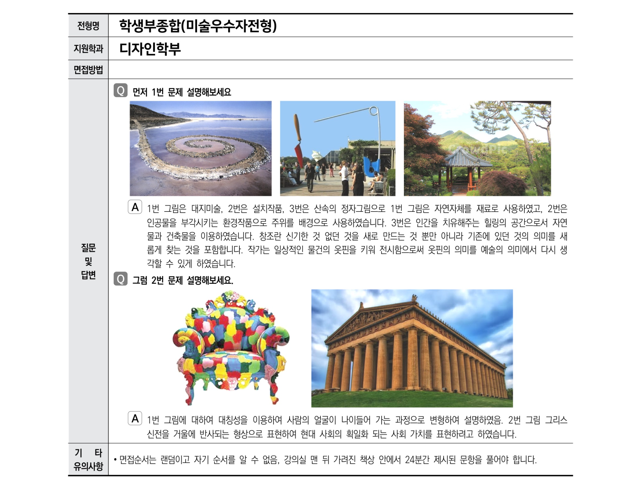 제시된 작품을 보고 주어진 문항에 대해 설명하며 작품에 대한 해석능력 및 관찰력, 논리적 사고력 등을 종합적으로 판단함.