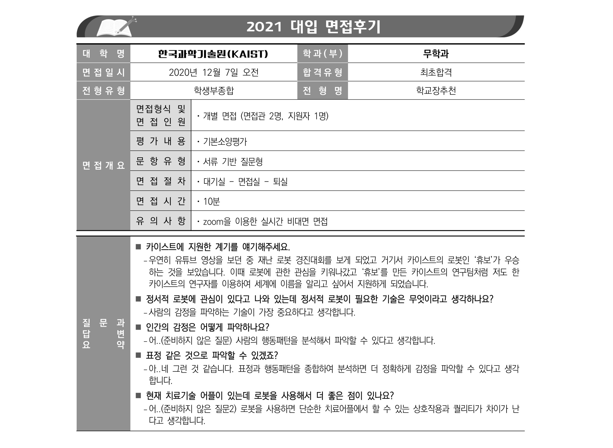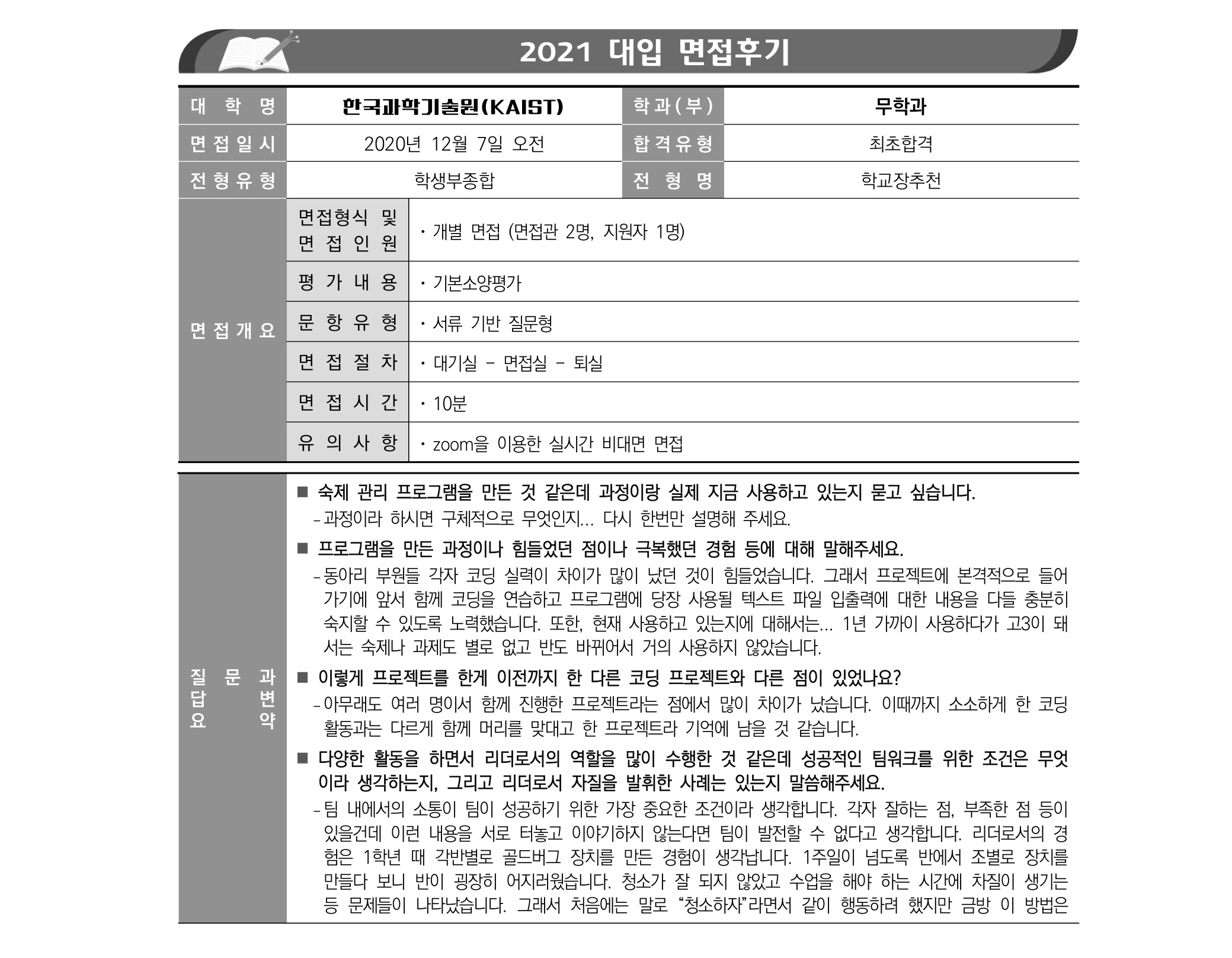2021학년도 KAIST 면접 후기10 2021학년도 KAIST 면접 후기11