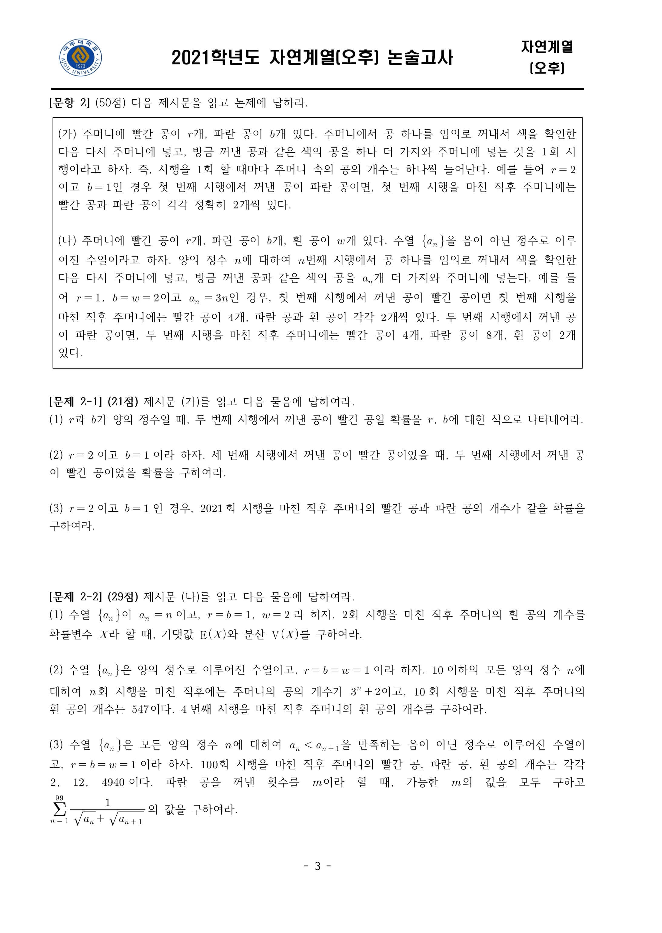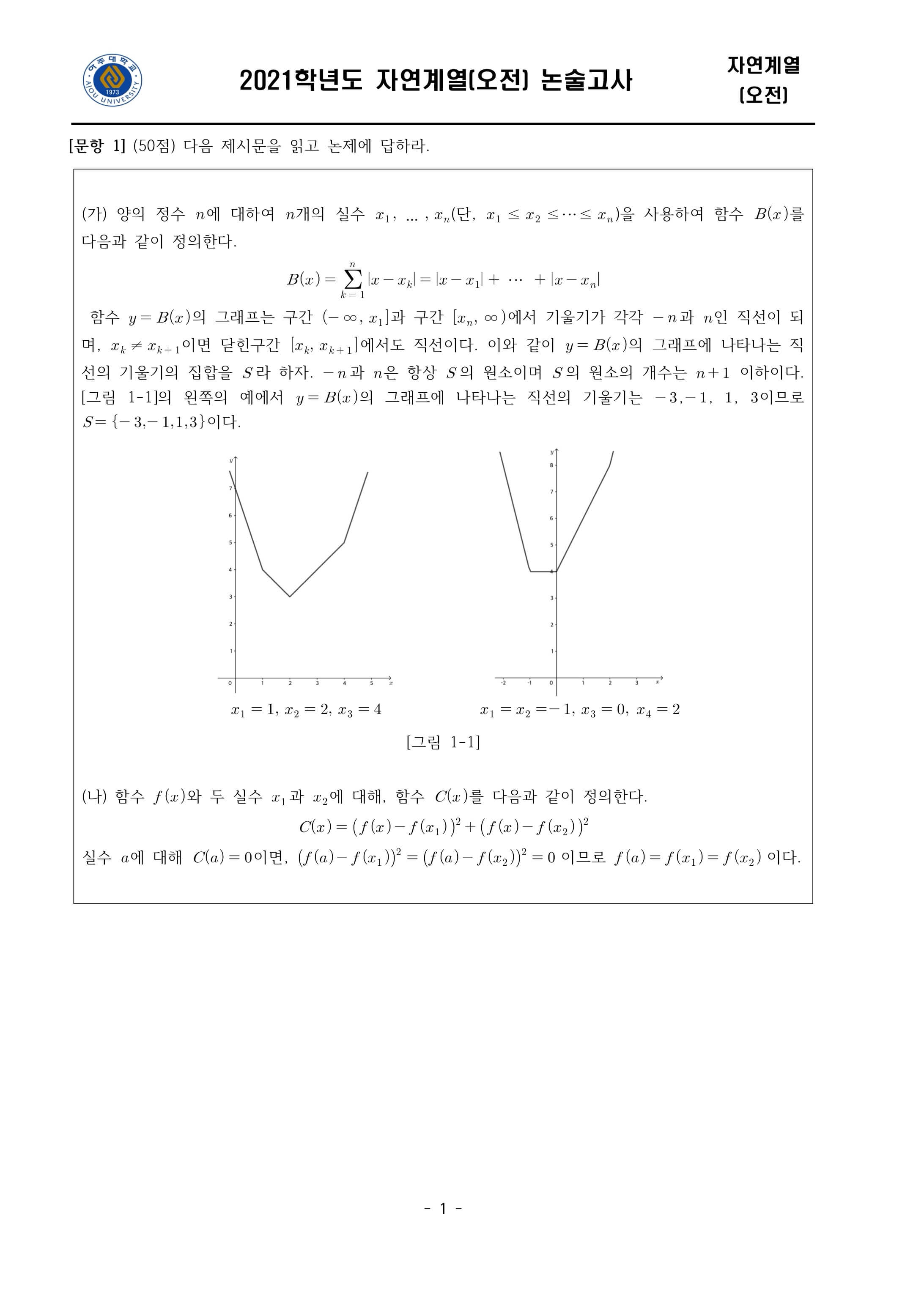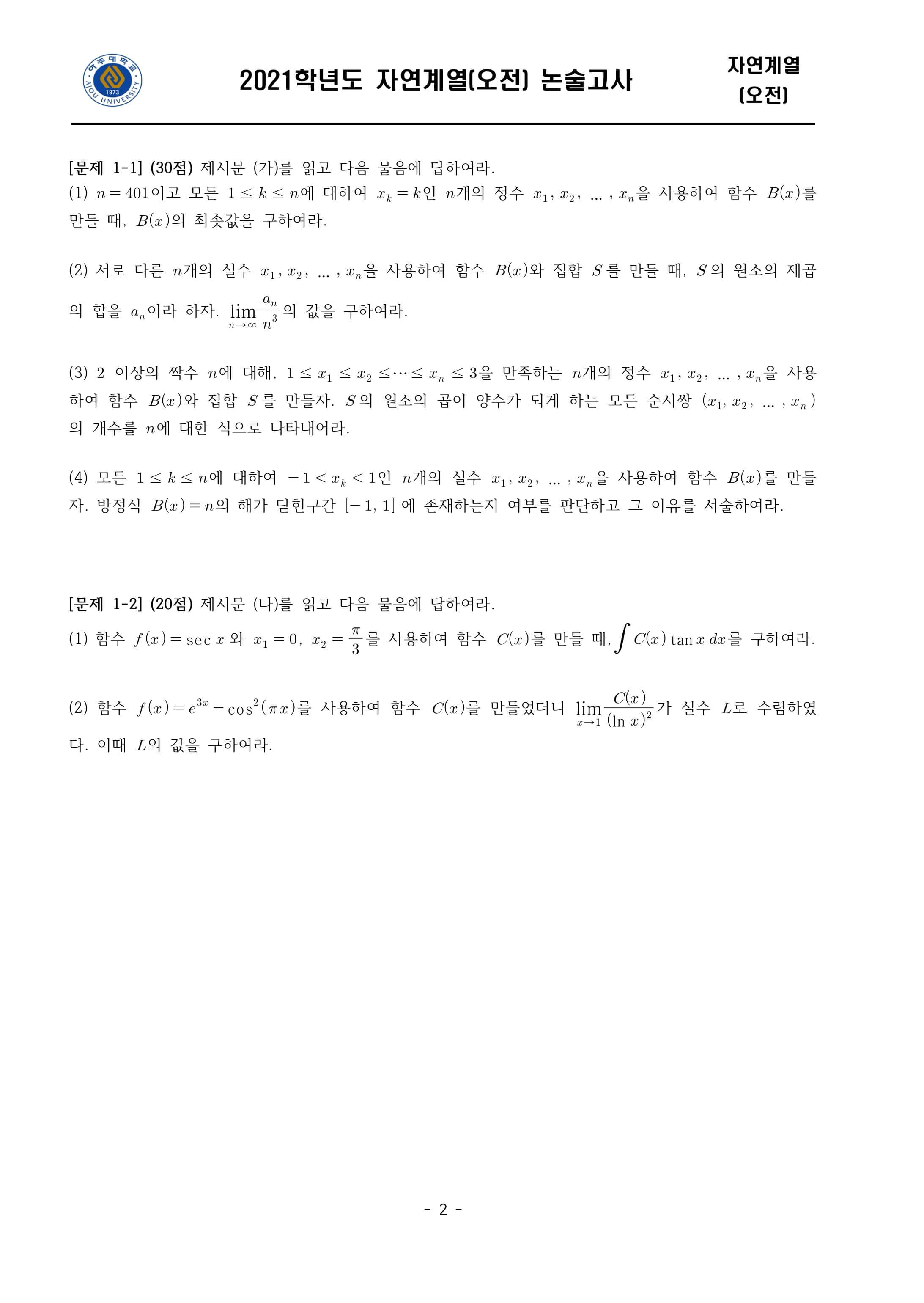 2021학년도 아주대학교 논술고사 기출문제 - 자연계열 (오전)