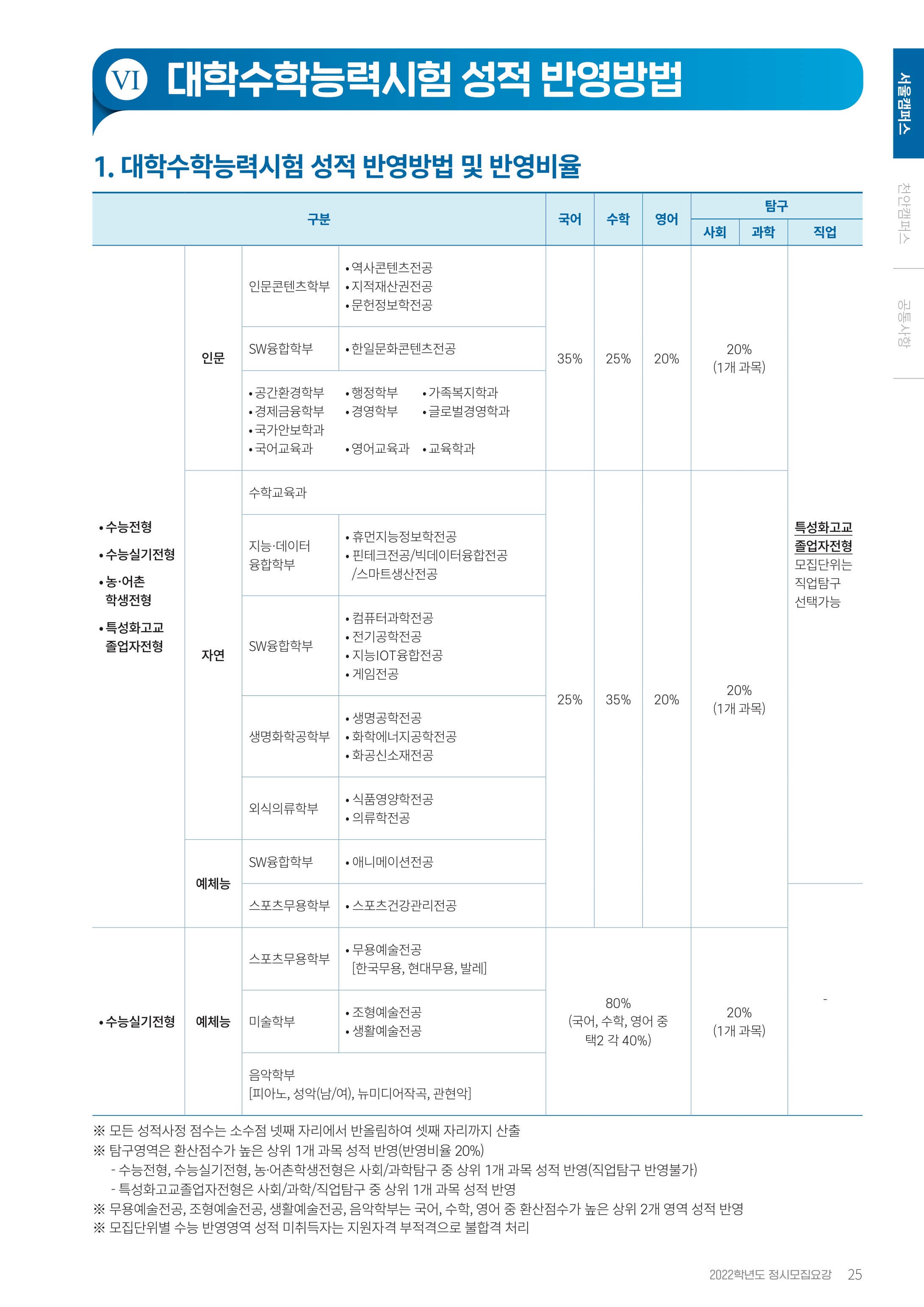 2) 모집단위별 반영영역 및 반영비율