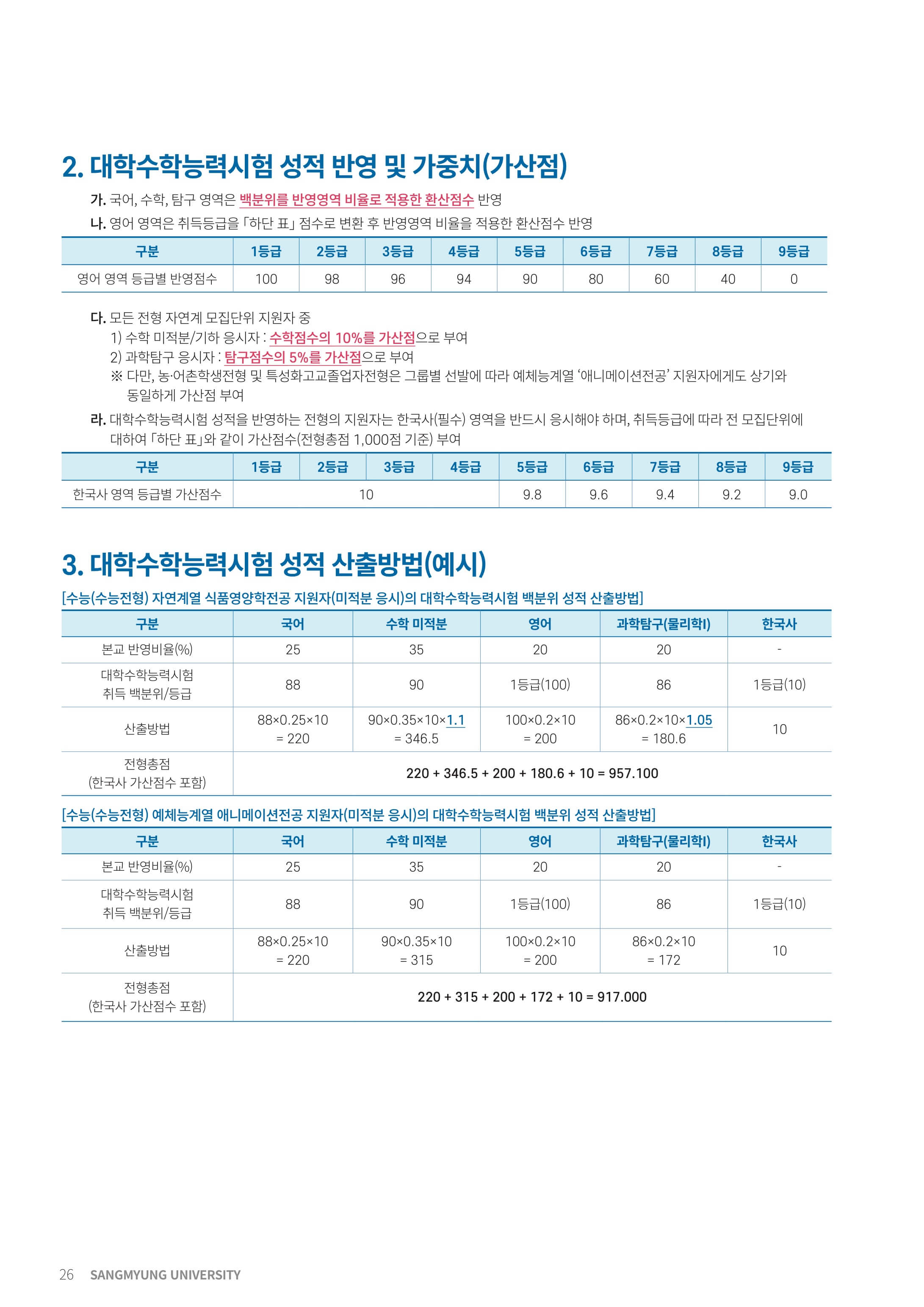 2022학년도 상명대학교 대학수학능력시험 성적 반영 기준
