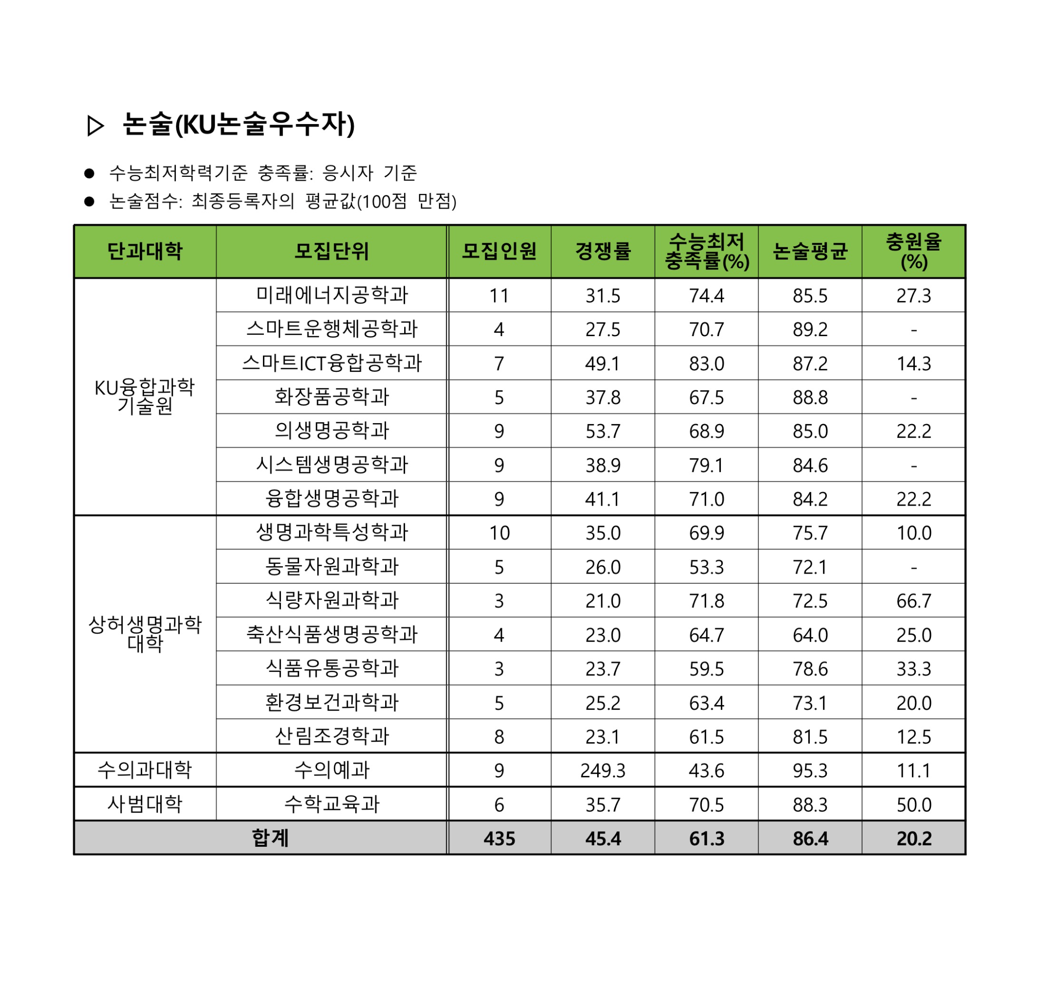 2022학년도 건국대학교 논술(KU논술우수자) 수시 등급 건국대학교 논술 전형입니다. 논술은 경쟁률이 매우 높아영. 논술 전형에는 재수생들도 여러 군데 지원을 하다 보니 대부분 30~50대 1 수준이네영. 뽑는 인원 수도 대부분의 과에서 10명이 안 되어서 경쟁이 치열하고영. 게다가 수능 최저 충족률이 60% 수준이어서 매우 낮음을 알 수 있네영. 논술을 준비하려는 횐님들은 수능 공부도 게을리 하면 안 되겠어영. 논술 점수의 평균은 86.4점인데영, 과별로 편차가 매우 크다보니 인기 있는 과를 지망하는 횐님들은 논술에 더욱 더 신경을 써야겠어영. 논술 전형은 합격이 어려운 만큼 충원율도 20%대로 매우 낮습니다.