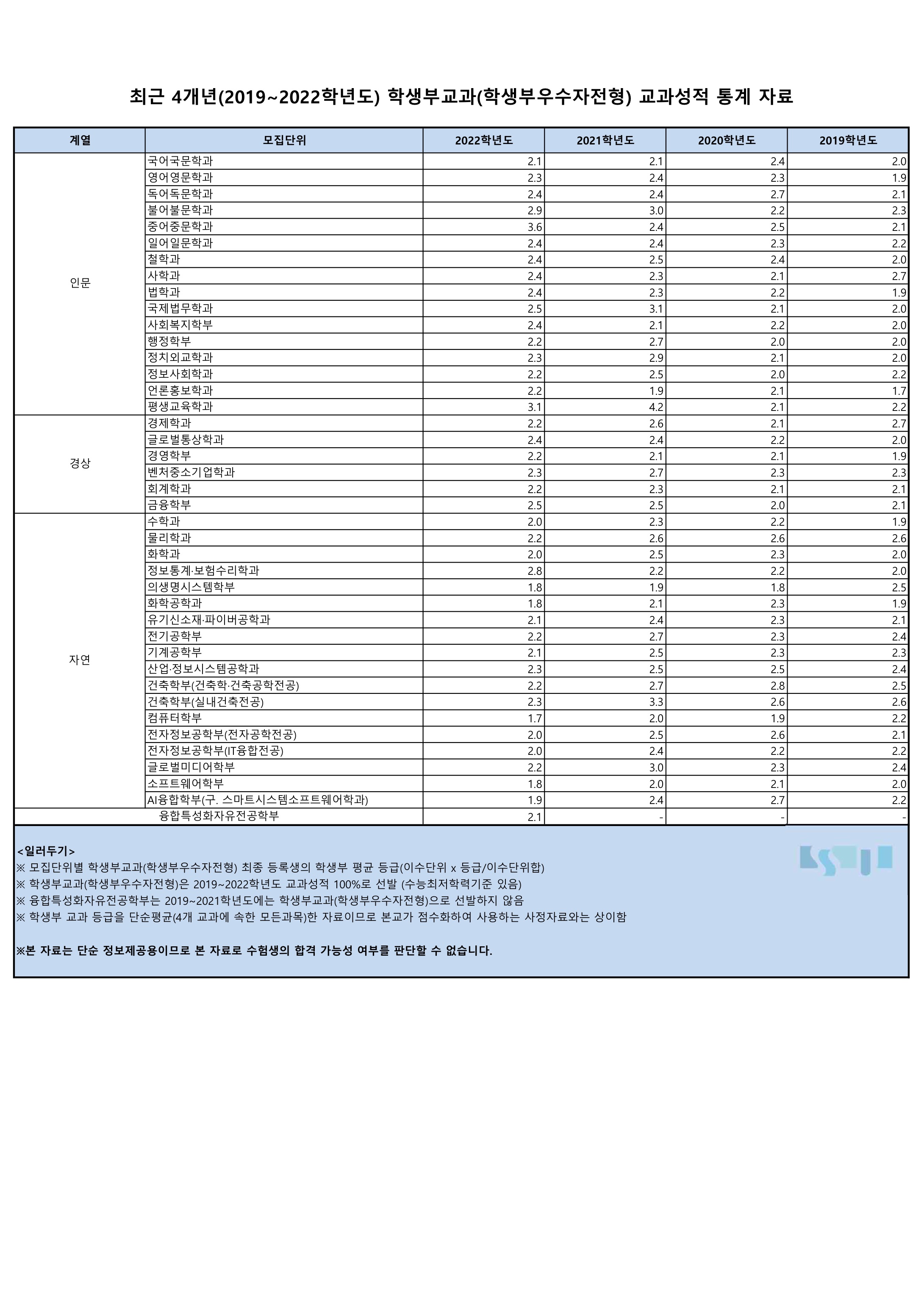 숭실대학교 최근 4개년(2019~2022학년도) 학생부교과(학생부우수자전형) 내신 등급 2022학년도