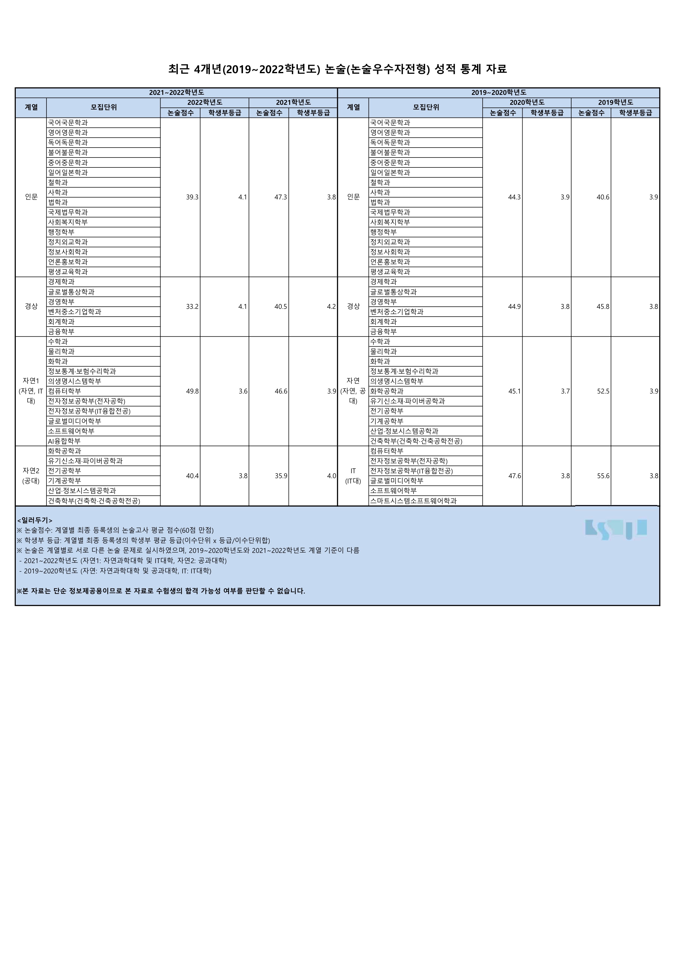 숭실대학교 최근 4개년(2019~2022학년도) 논술(논술우수자전형) 내신 등급 이번에는 논술 전형 최종 등록생의 내신 등급을 알아봅시다. 논술 점수는 60점 만점에 최종 등록생들의 논술고사 평균 점수를 기재한 것이에영. 논술은 2019~2020학년도와 2021~2022학년도의 계열 기준이 다르므로 2020학년도 이전의 자료를 참고하실 횐님들은 계열을 확인해 보세영.