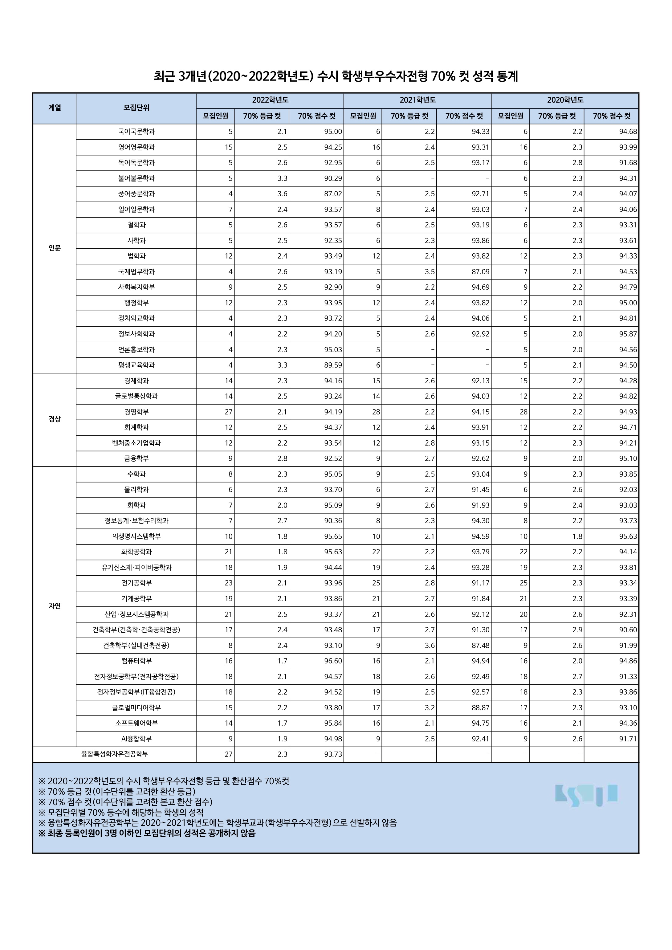 숭실대학교 최근 3개년(2020~2022학년도) 수시 학생부우수자전형 70% 컷