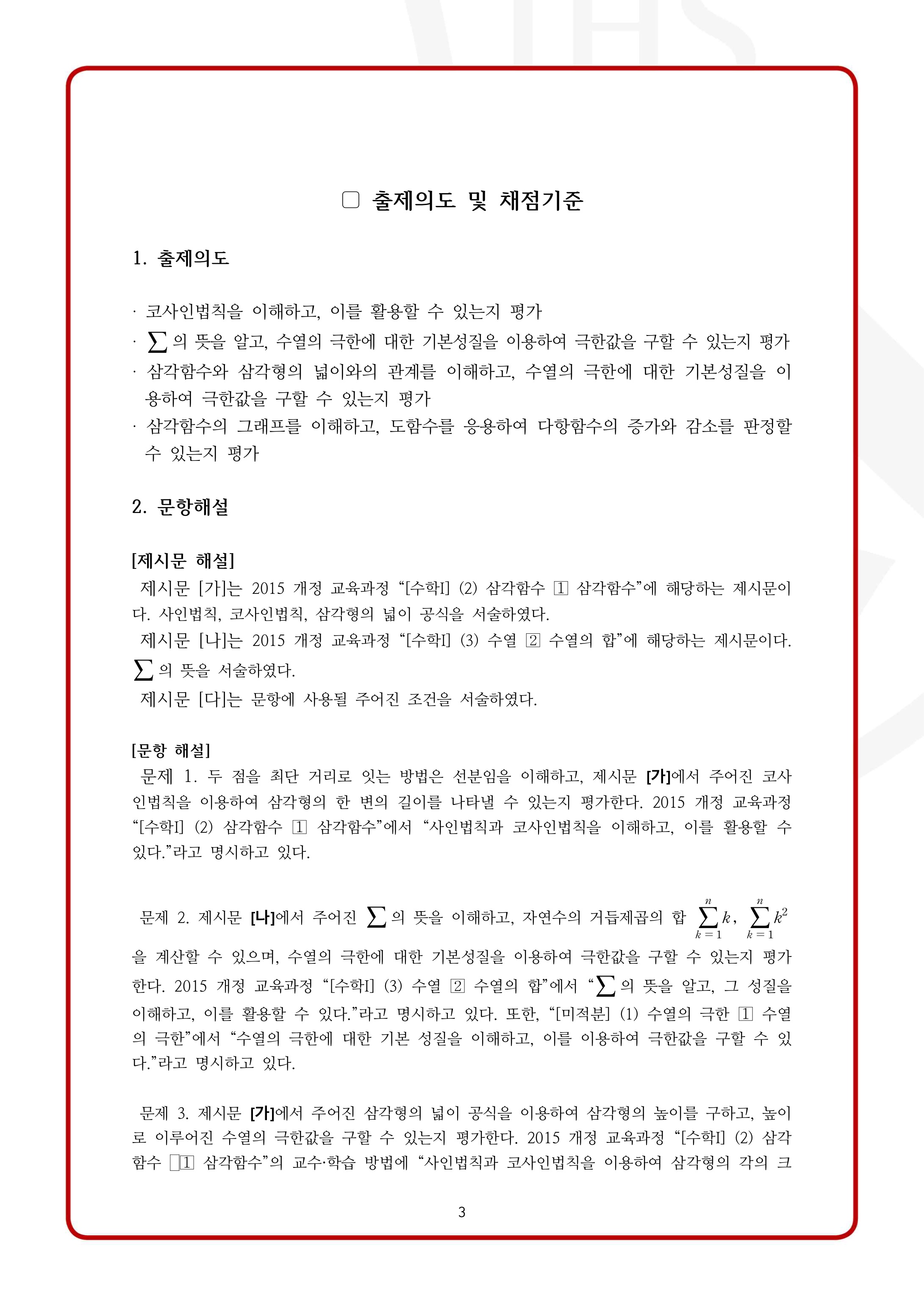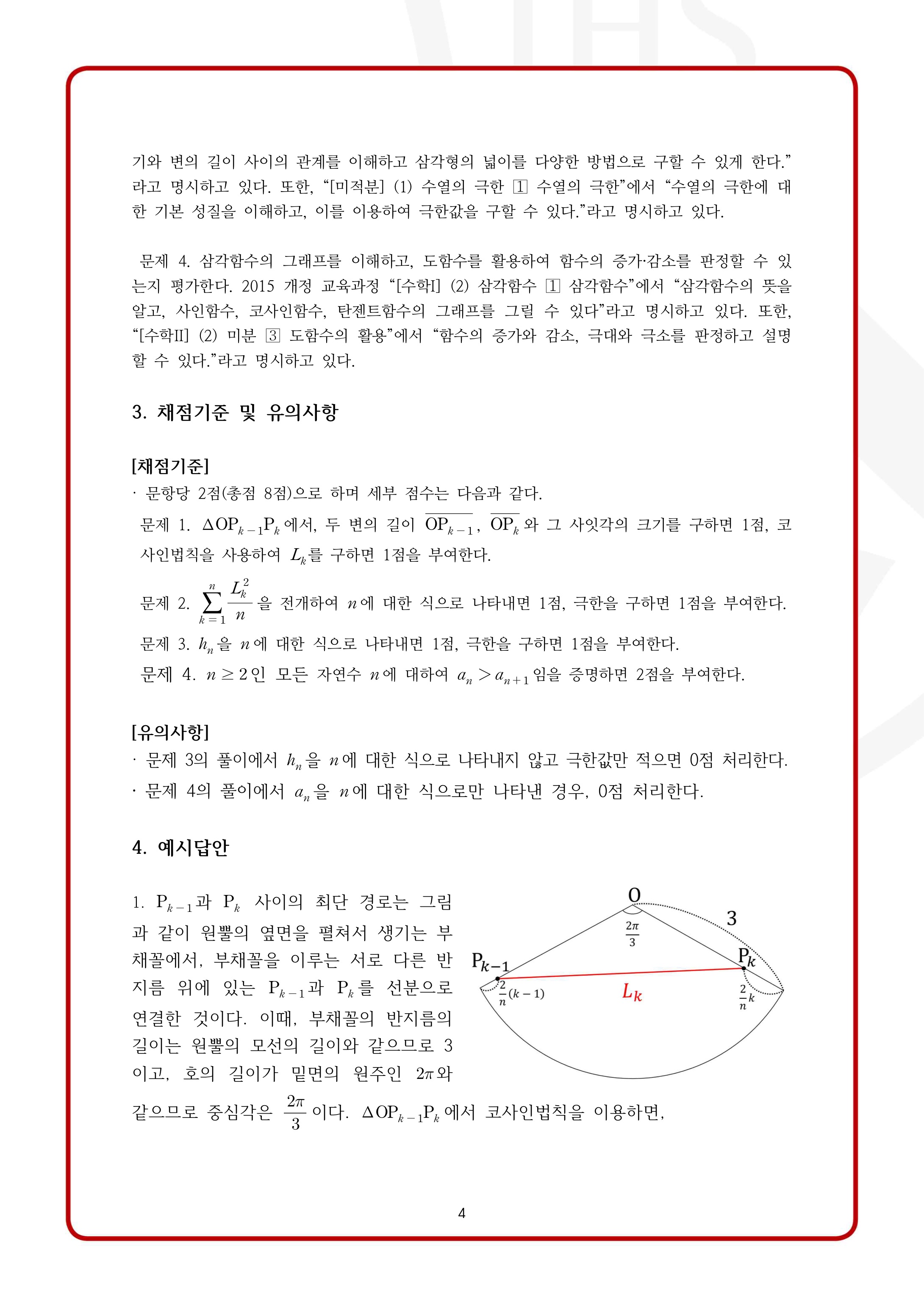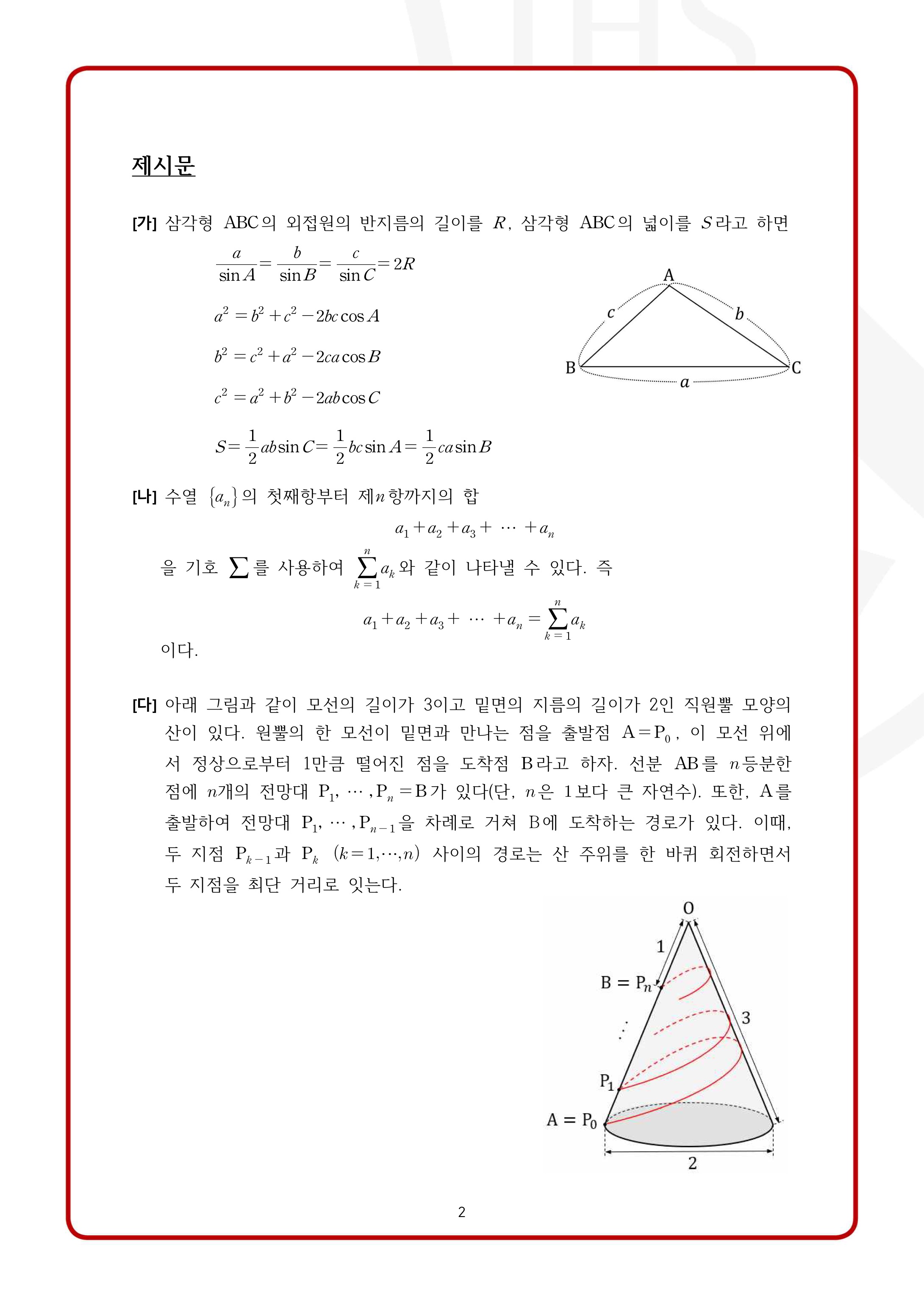 2022학년도 서강대학교 모의논술 1차 자연계열 제시문 출제 개념: 수열의 극한, 사인법칙, 코사인법칙, 삼각형의 넓이, 삼각함수의 그래프, 다항함수의 증가 감소, 수열의 합