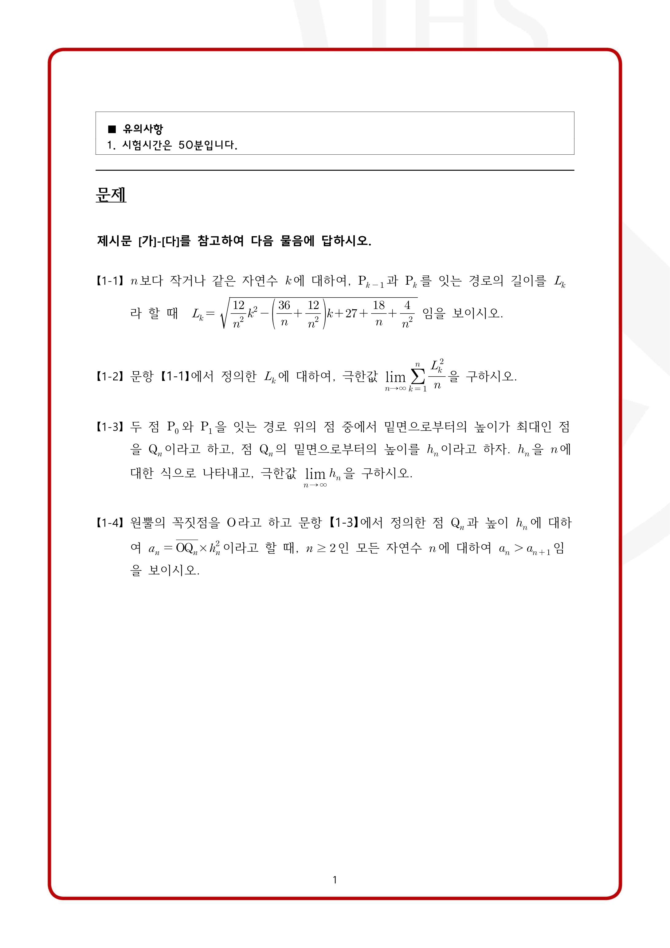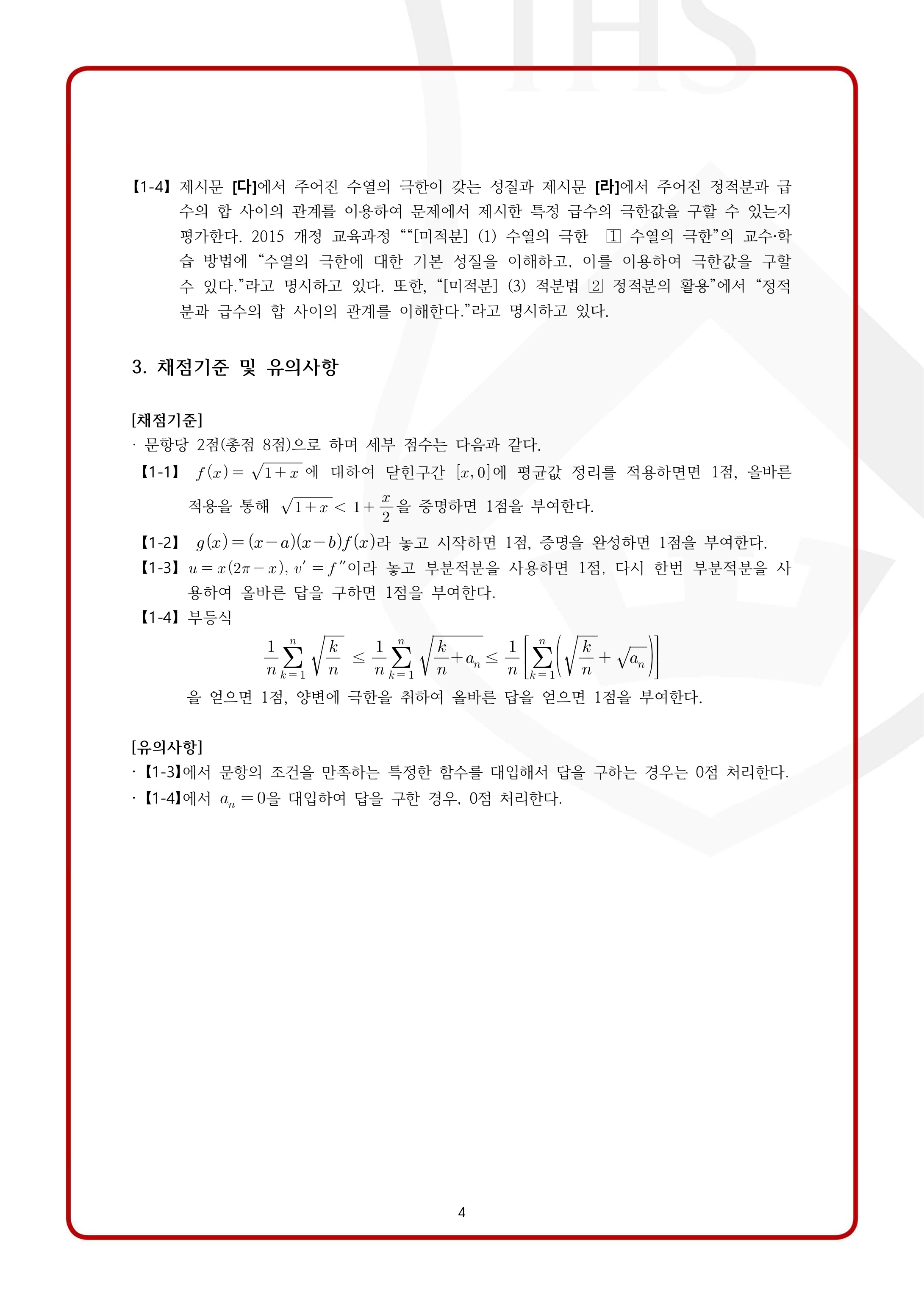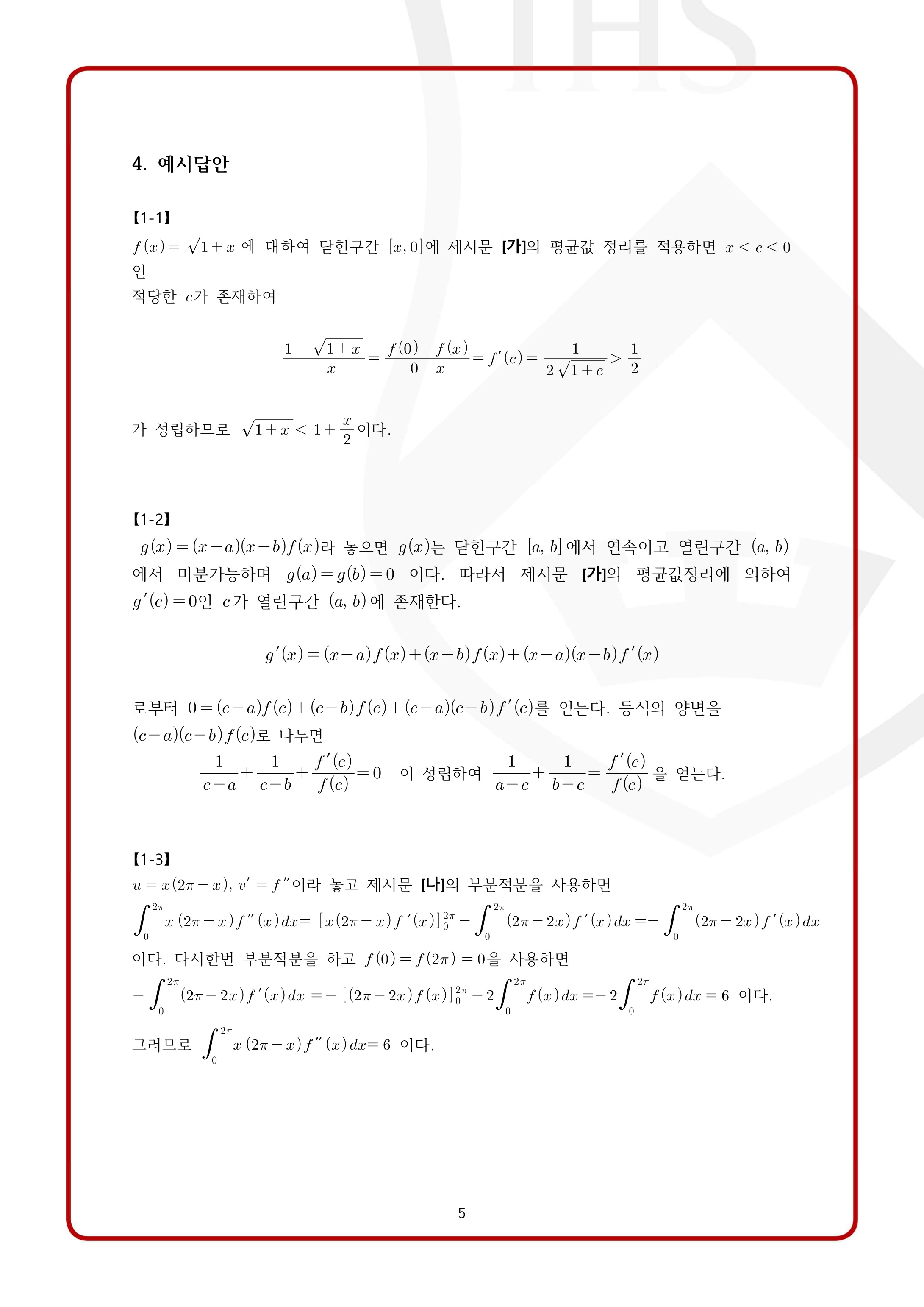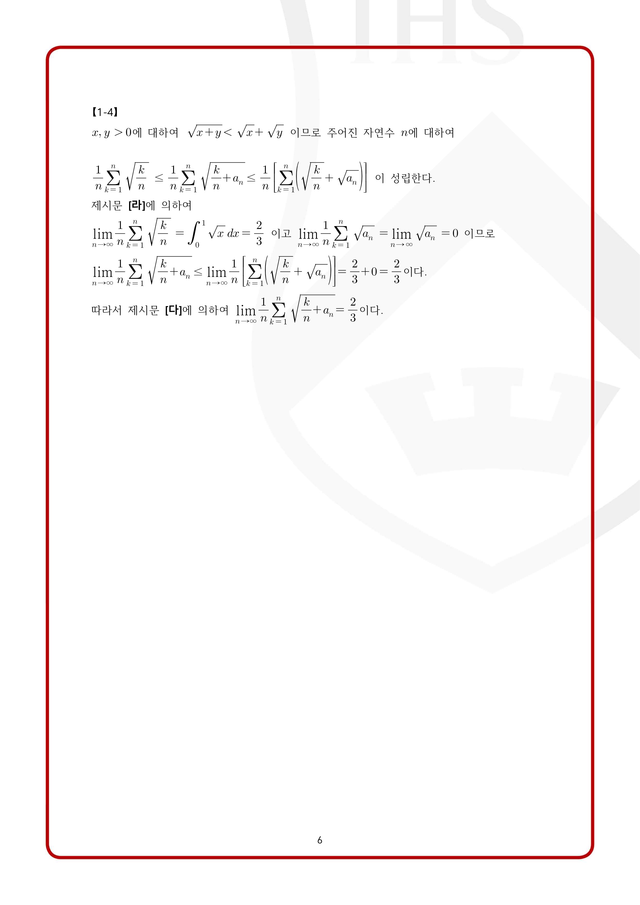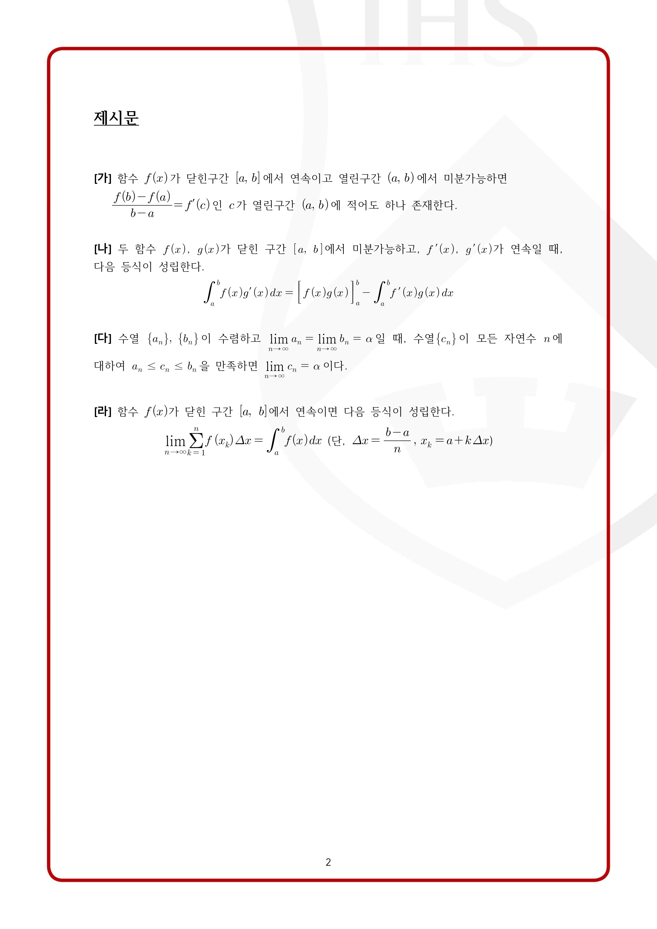 2022학년도 서강대학교 모의논술 2차 자연계열 제시문 출제 개념: 평균값 정리, 정적분과 급수, 급수의 극한, 부분적분, 수열의 수렴, 부등식의 증명