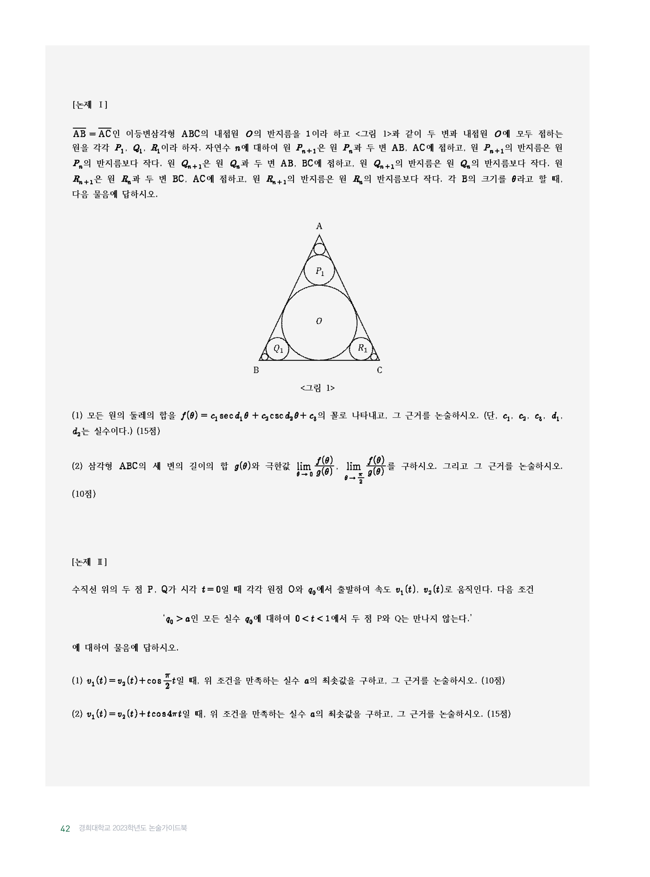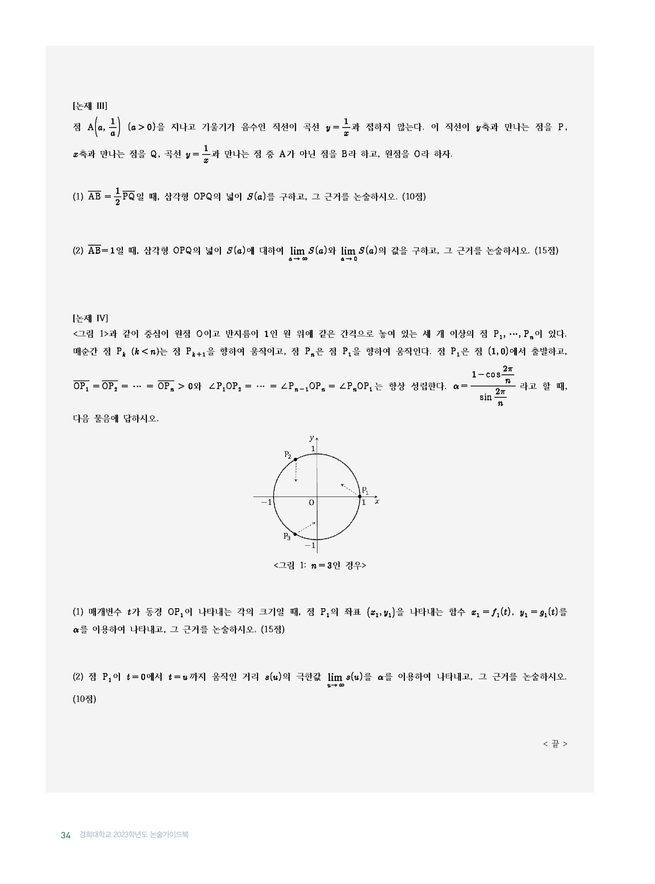 2022학년도 경희대학교 논술 문제 및 해설 횐님들 안녕하세영! 오늘은 2022학년도 경희대학교 논술 기출문제를 확인하고 예시 답안과 채점 기준을 살펴볼 거예영.😎 경희대학교 논술은 인문·체육계열(인문·체육계, 사회계), 자연계열(자연계, 의·약학계)로 구분이 되고영, 인문·체육계는 1000자 내외의 논술 답안을 쓰는 문제가 출제되고 사회계와 자연계는 수리논술, 의·약학계는 수리논술과 과학논술이 출제됩니다. 이 글에서는 자연계와 의약학계에서 출제된 수리논술을 살펴볼 거예영. 전 계열 모두 120분의 시간이 주어지니 그 안에 핵심적인 답을 쓰는 게 중요하겠지영? 아래에서 작년에 출제된 문제와 해설, 예시답안을 꼼꼼히 살펴보도록 해영.🙋♀️