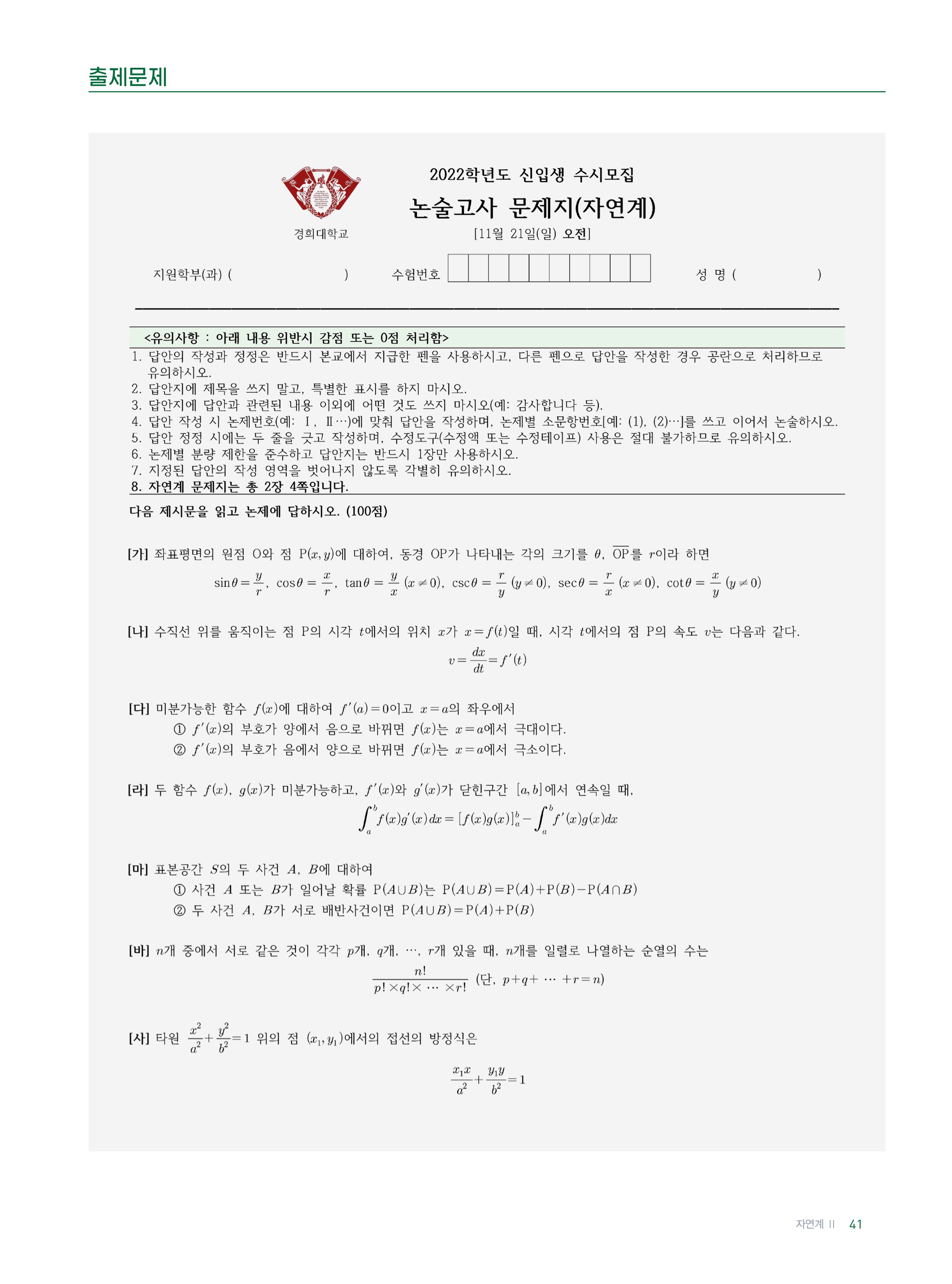 2022학년도 경희대학교 논술고사 문제지(자연계 11월 21일)