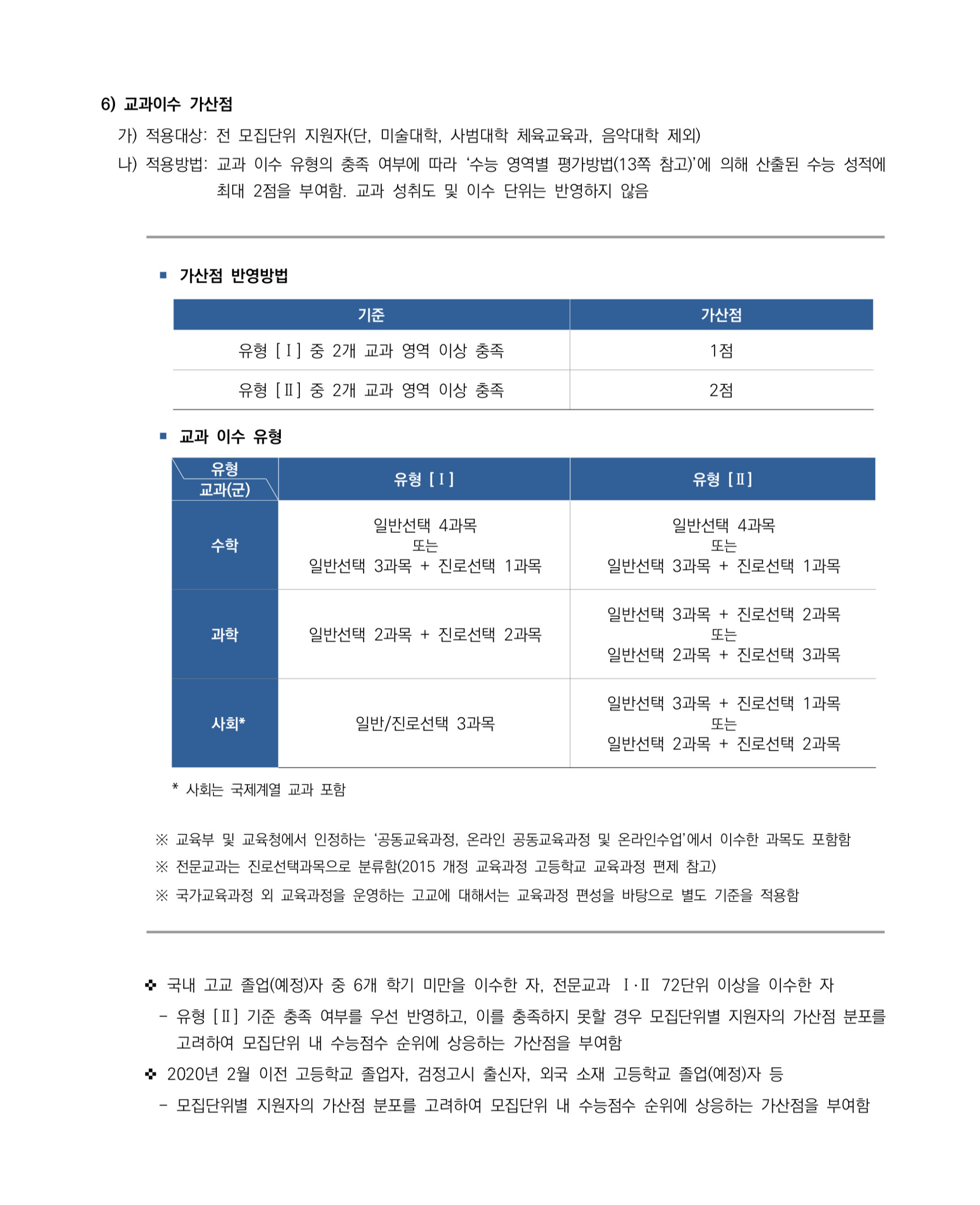 ※ 전 모집단위(미술대학, 사범대학 체육교육과, 음악대학 제외) 지원자를 대상으로 교과이수 가산점을 반영함・ 전 모집단위(미술대학, 사범대학 체육교육과, 음악대학 제외)