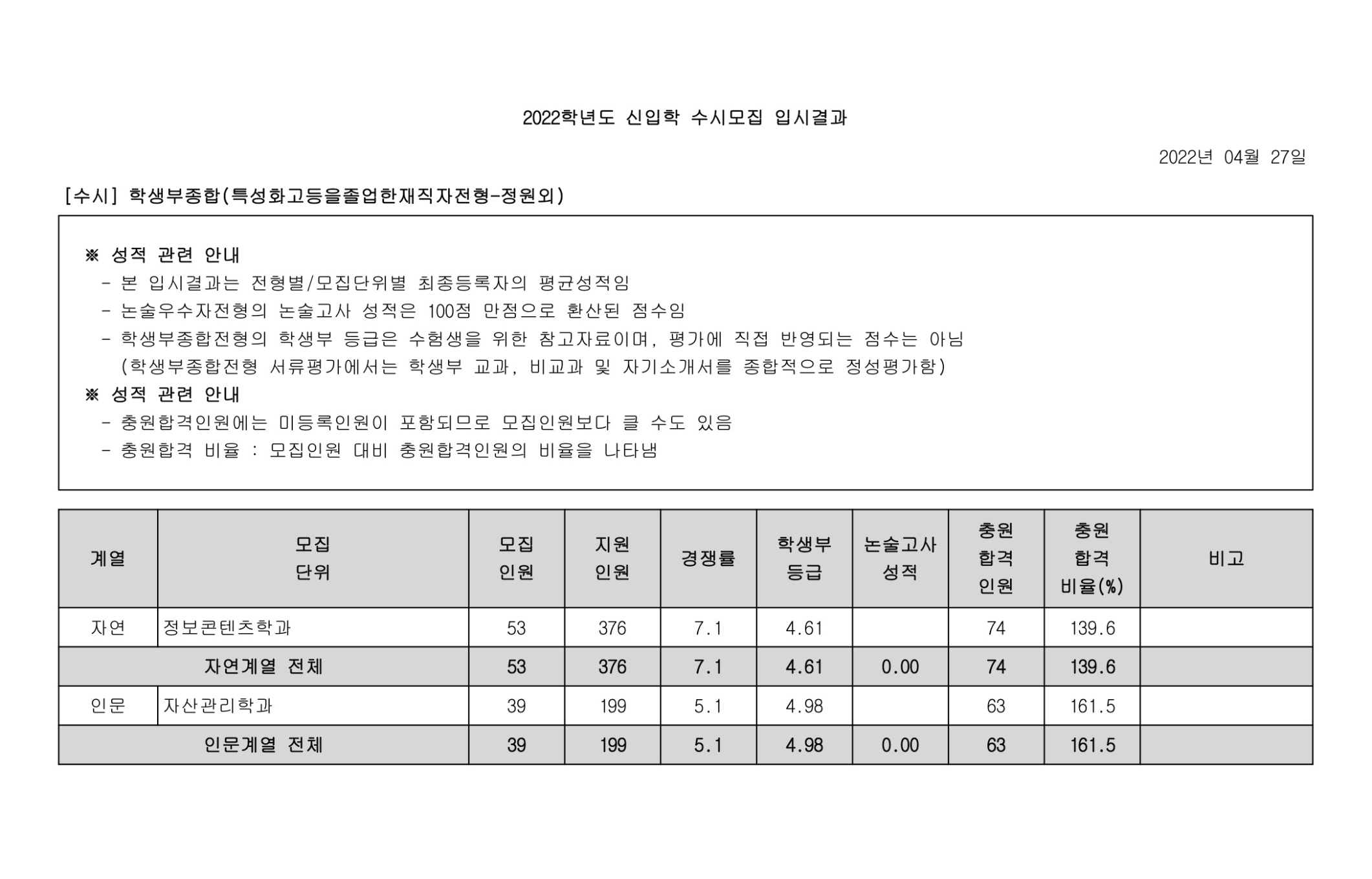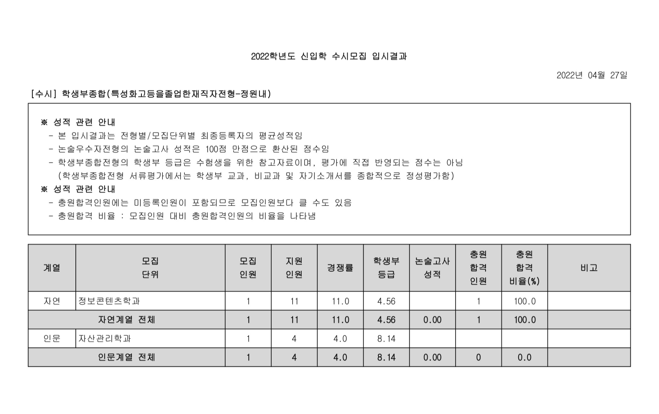 2022학년도 광운대학교 학생부종합(특성화고등을졸업한재직자전형-정원내) 수시등급 2022학년도 광운대학교 학생부종합(특성화고등을졸업한재직자전형-정원외) 수시등급