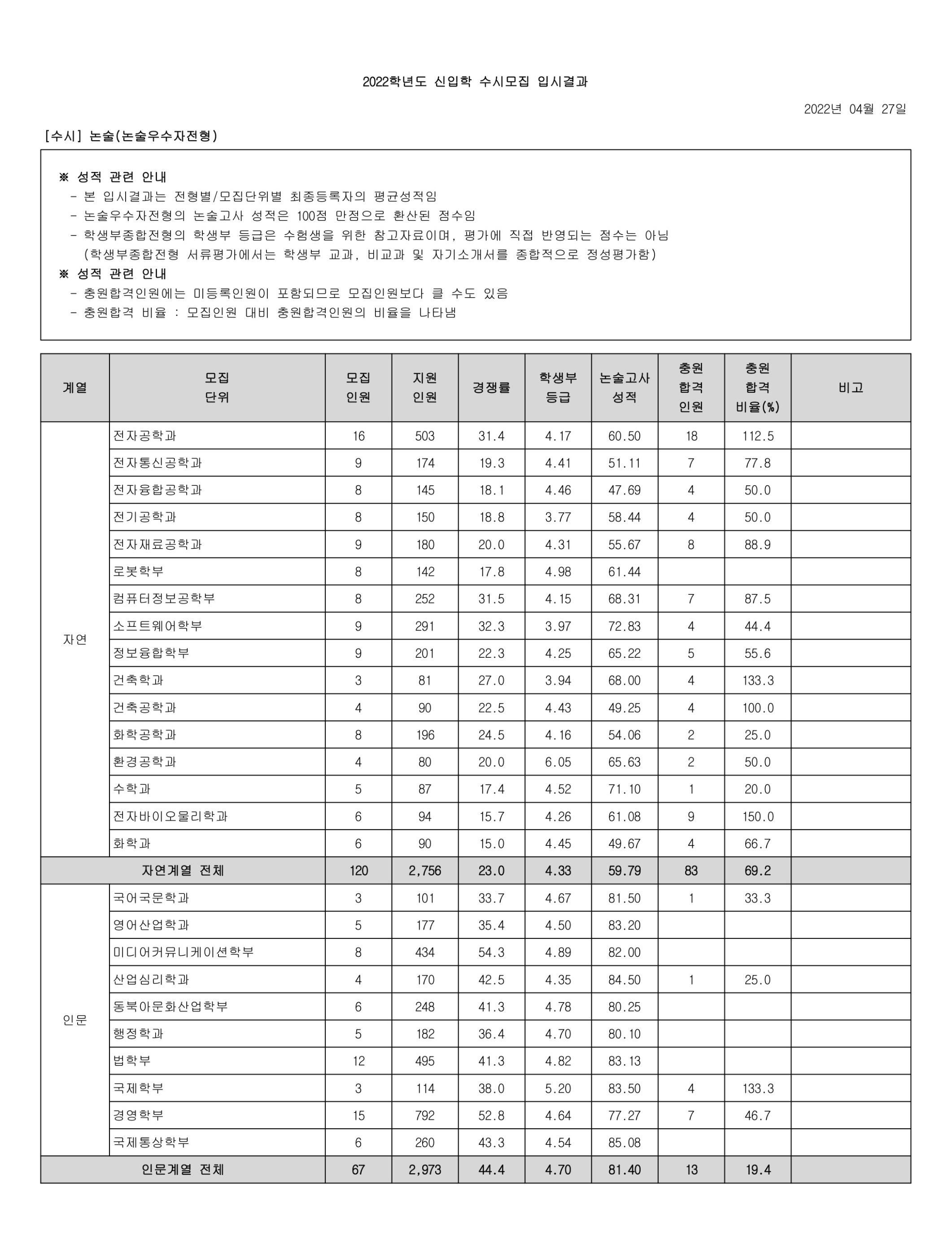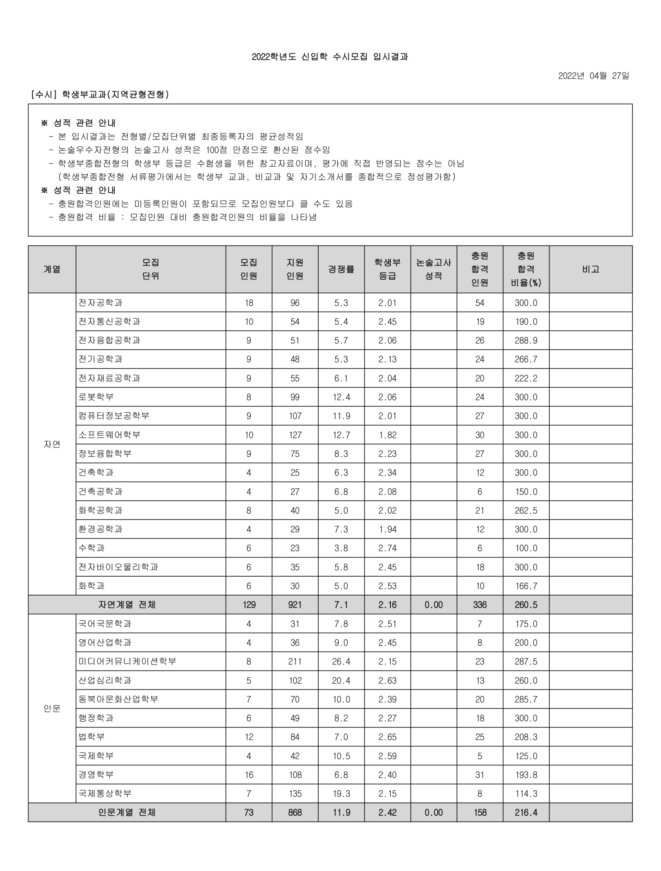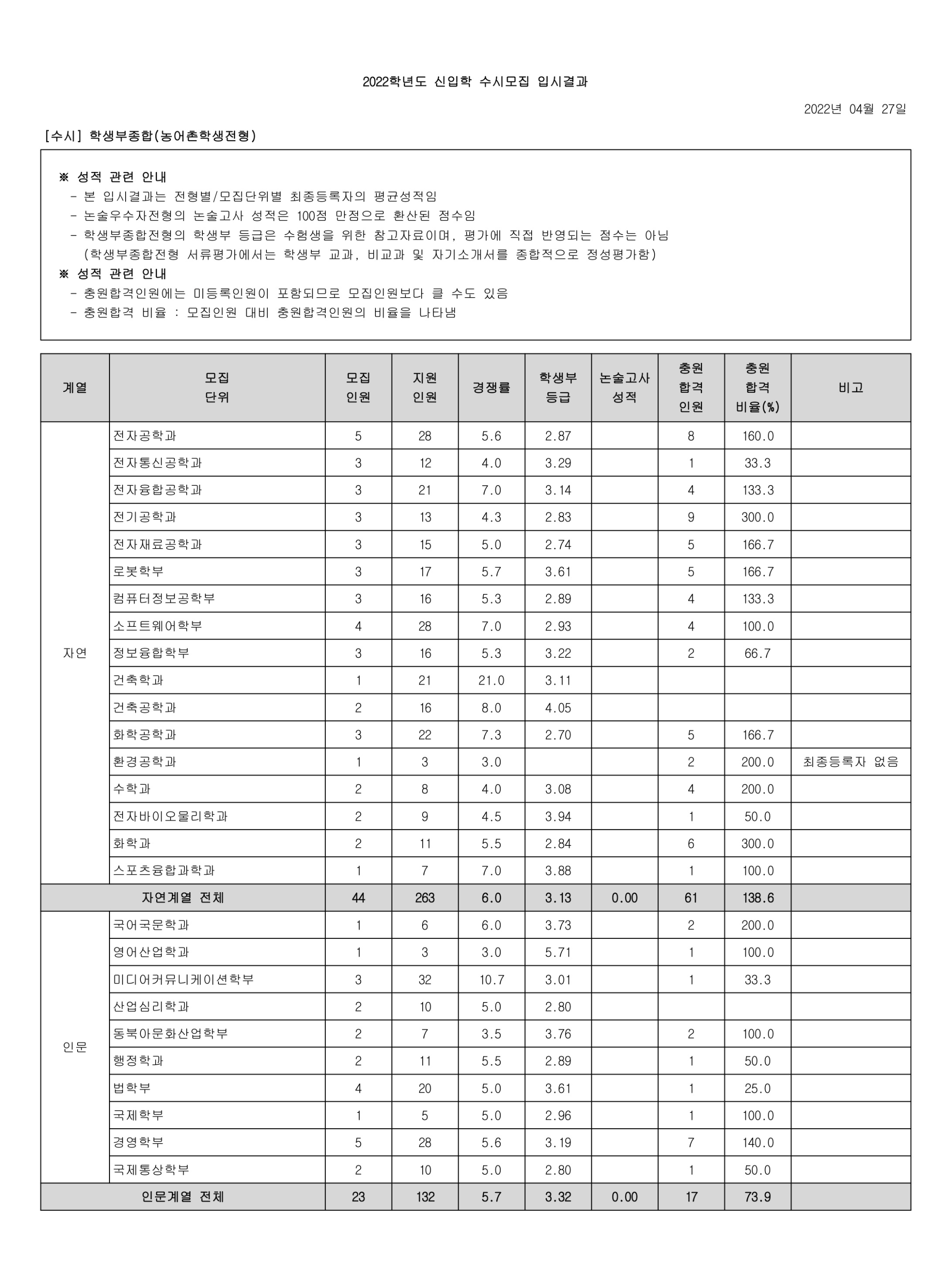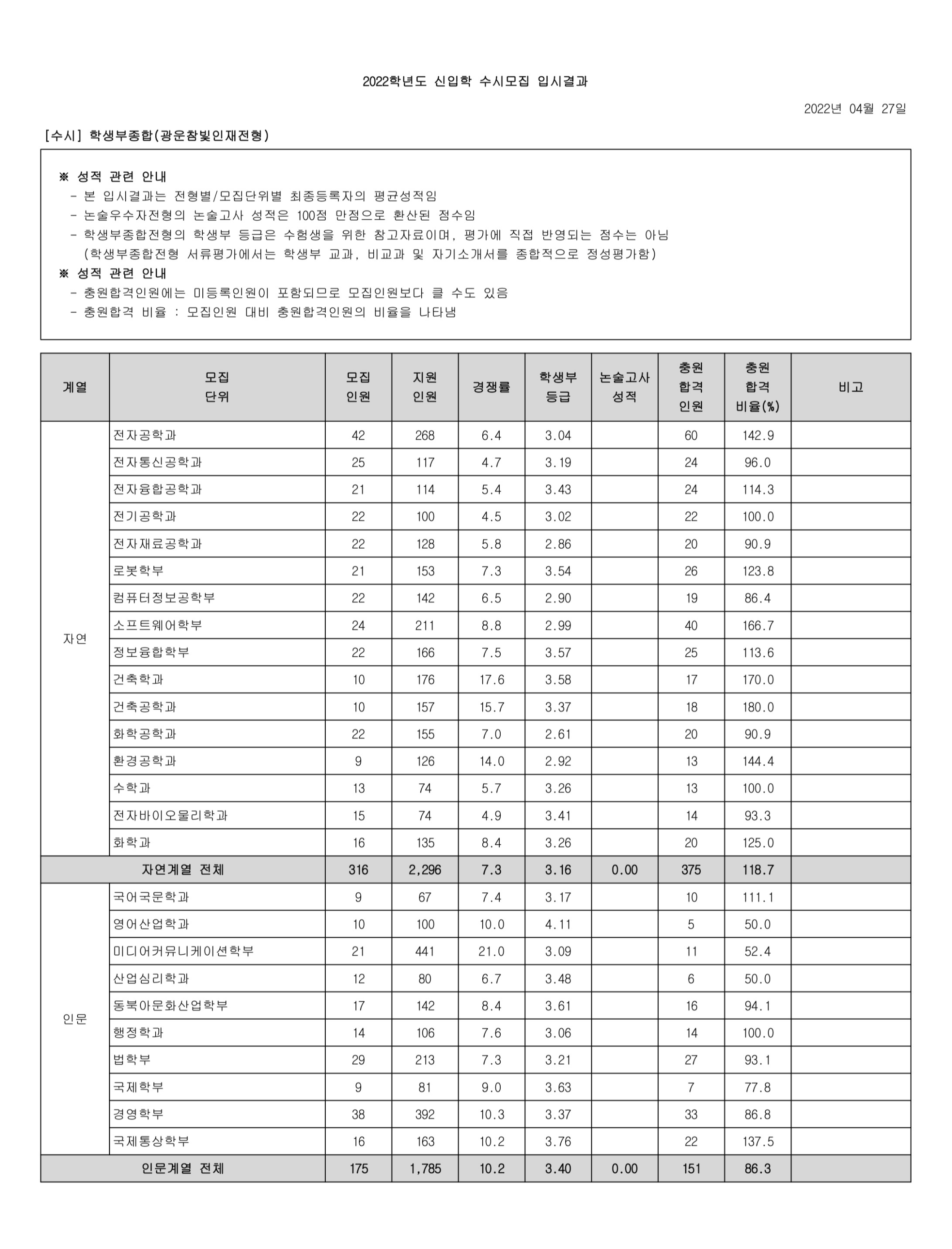 2022학년도 광운대학교 학생부종합(고른기회전형) 수시등급 2022학년도 광운대학교 학생부종합(농어촌학생전형) 수시등급