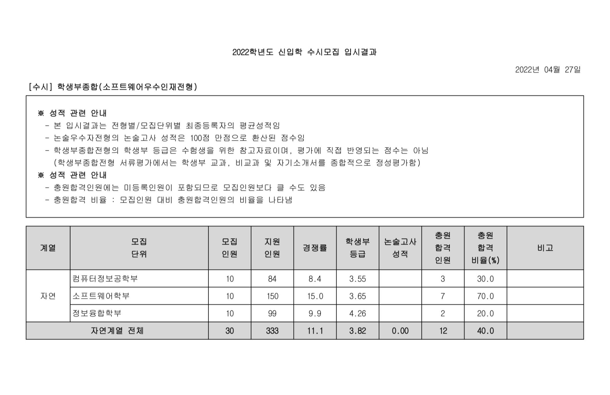 2022학년도 광운대학교 학생부종합(소프트웨어우수인재전형) 수시등급