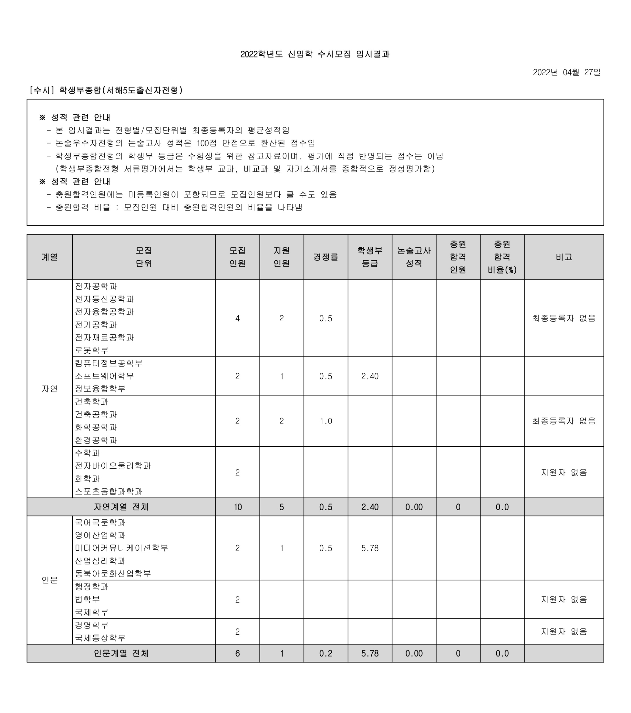 2022학년도 광운대학교 학생부종합(특성화고졸업자전형) 수시등급 2022학년도 광운대학교 학생부종합(서해5도출신자전형) 수시등급