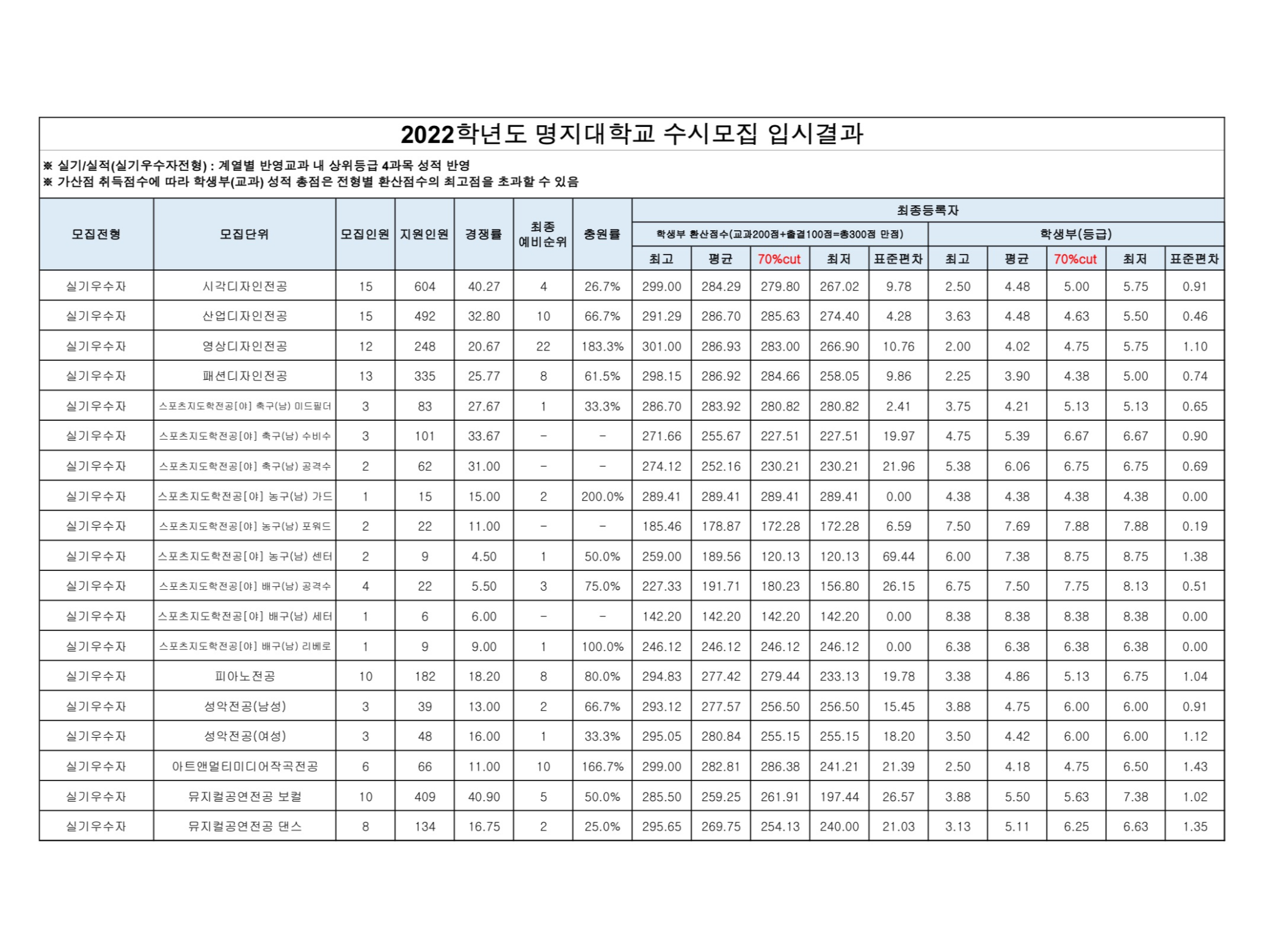 2022학년도 명지대학교 실기/실적(특기자전형) 수시등급