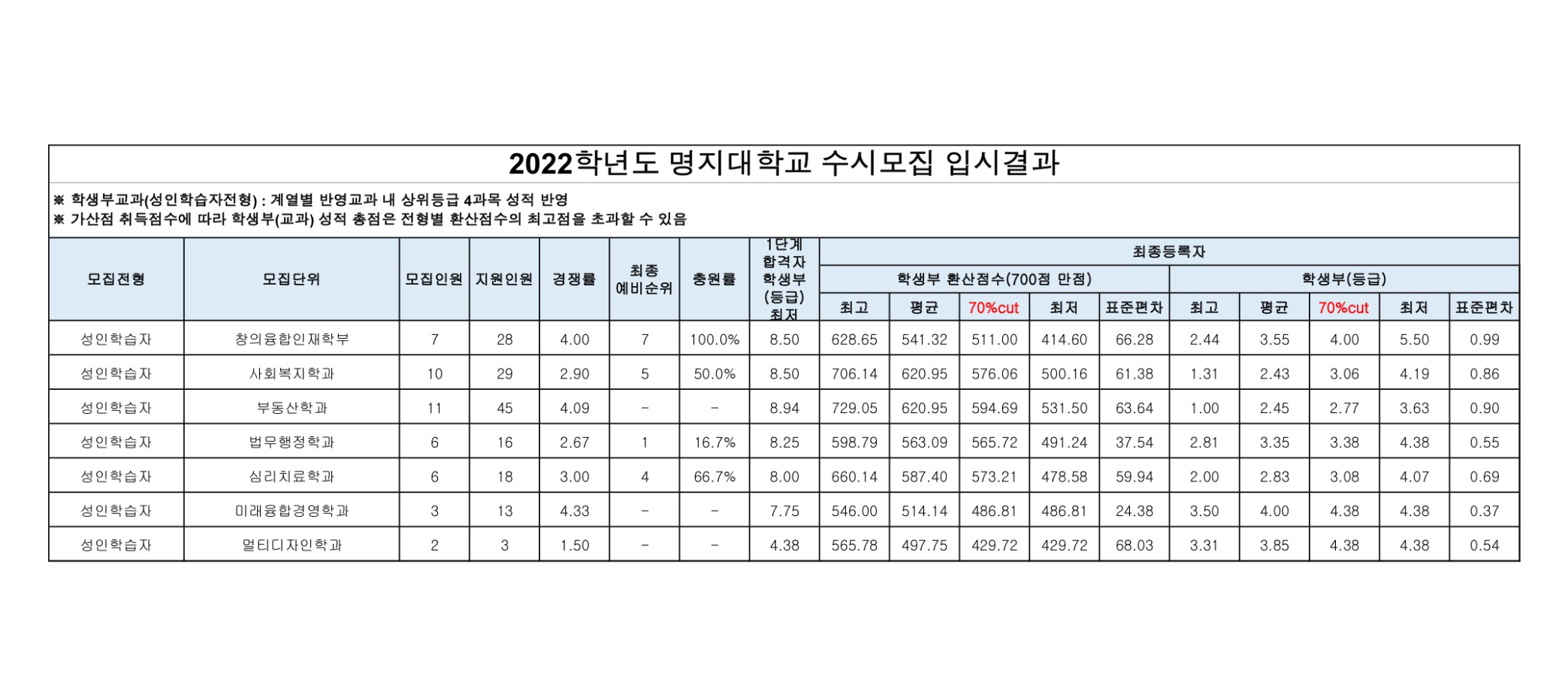 2022학년도 명지대학교 학생부교과(성인학습자전형) 수시등급