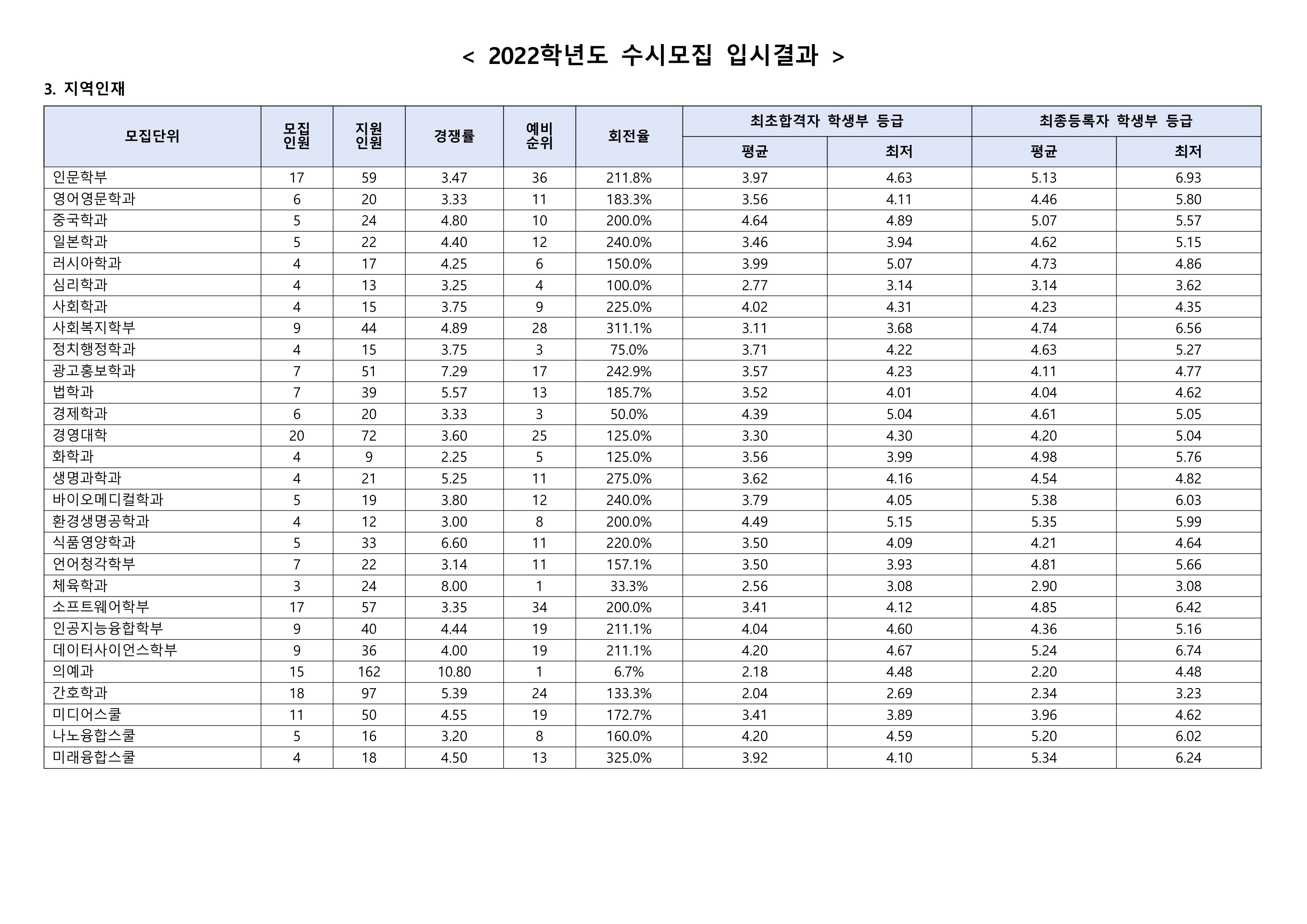 2022학년도 한림대학교 학교생활우수자(학생부종합) 내신 등급 2022학년도 한림대학교 지역인재 내신 등급