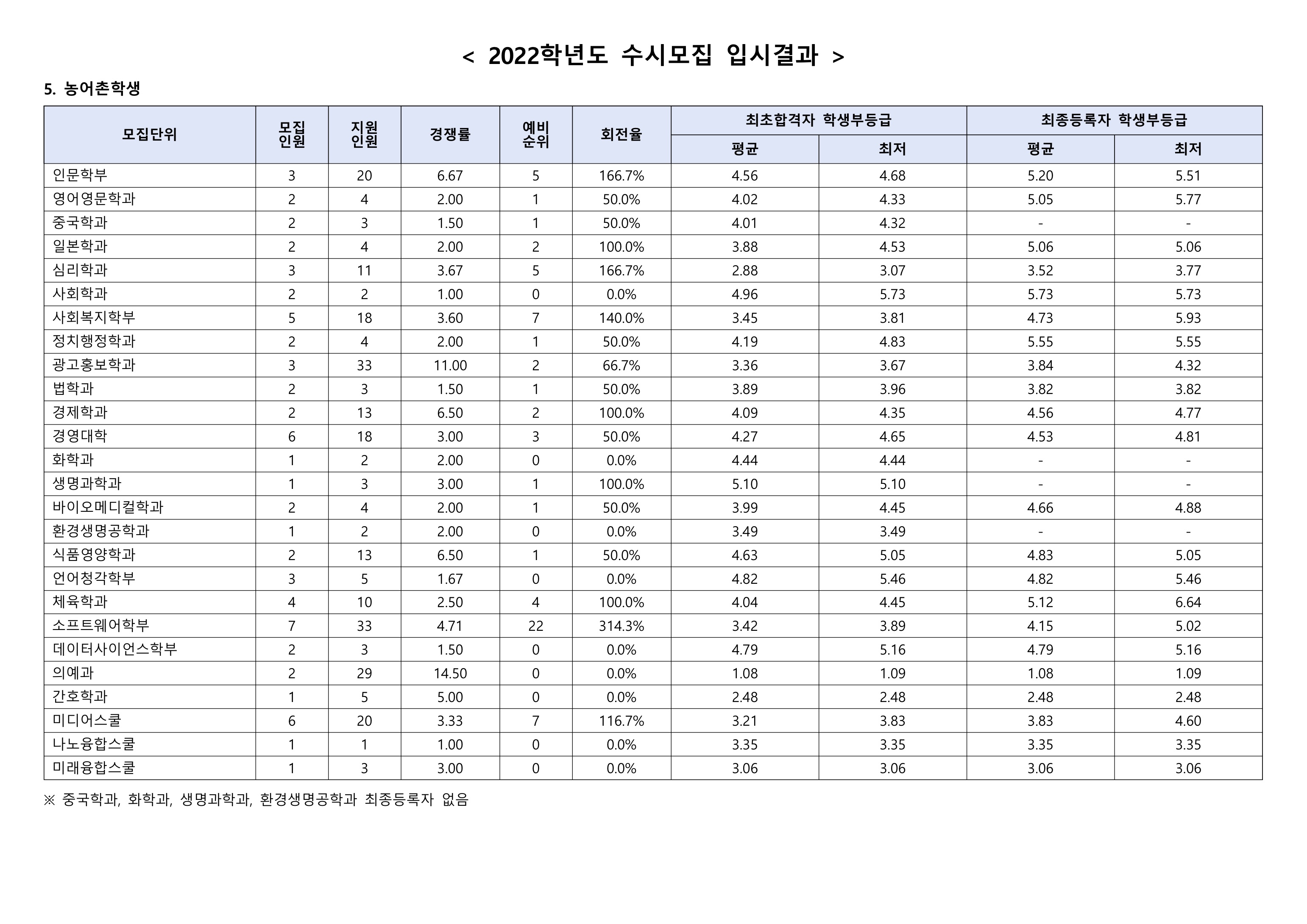 2022학년도 한림대학교 농어촌학생 내신 등급 2022학년도 한림대학교 한림SW인재 내신 등급
