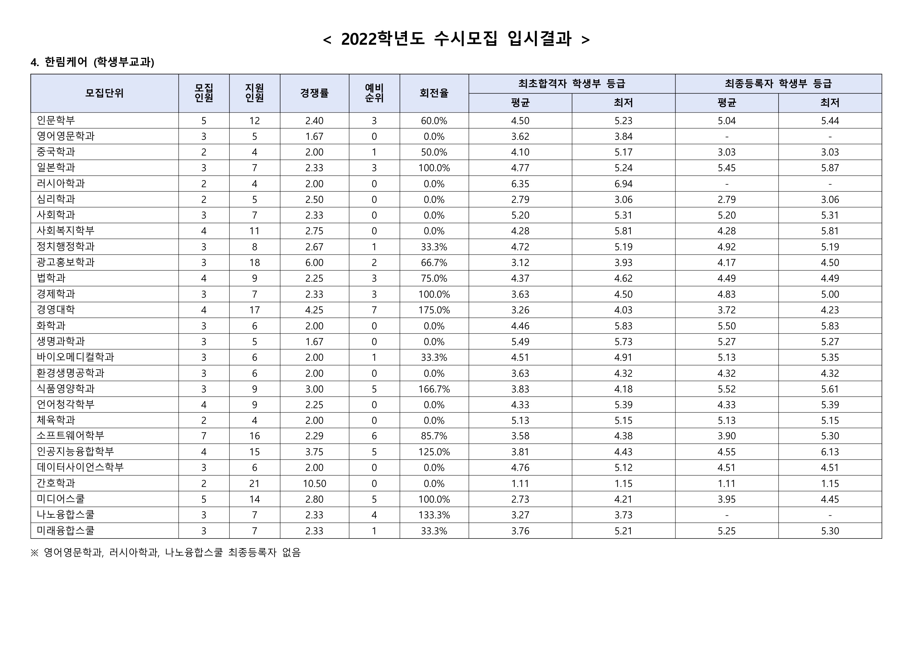 2022학년도 한림대학교 한림케어(학생부교과) 내신 등급 2022학년도 한림대학교 농어촌학생 내신 등급