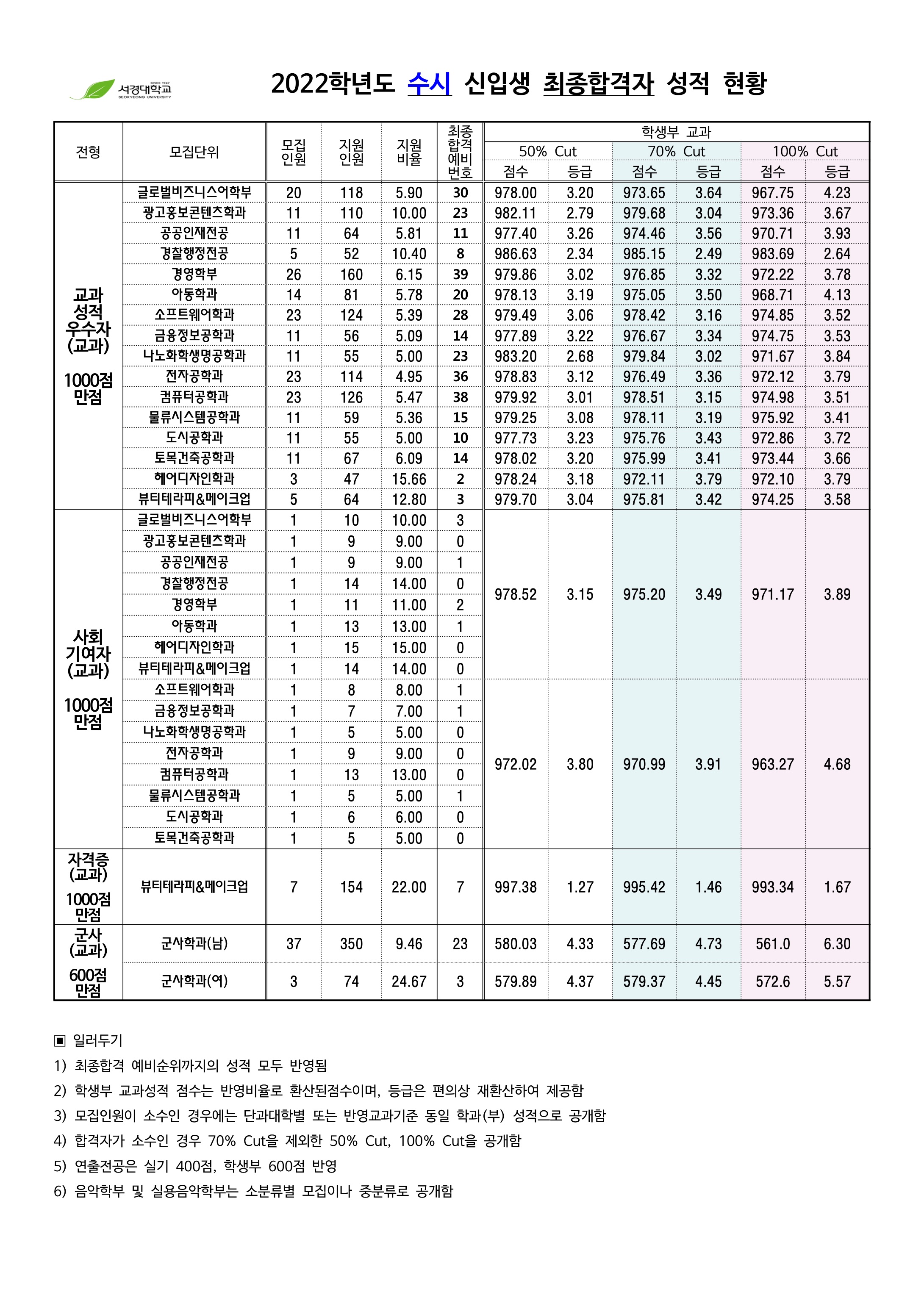 2022학년도 서경대학교 교과성적우수자(교과), 사회기여자(교과), 자격증(교과), 군사(교과) 수시등급 교과성적우수자(교과)