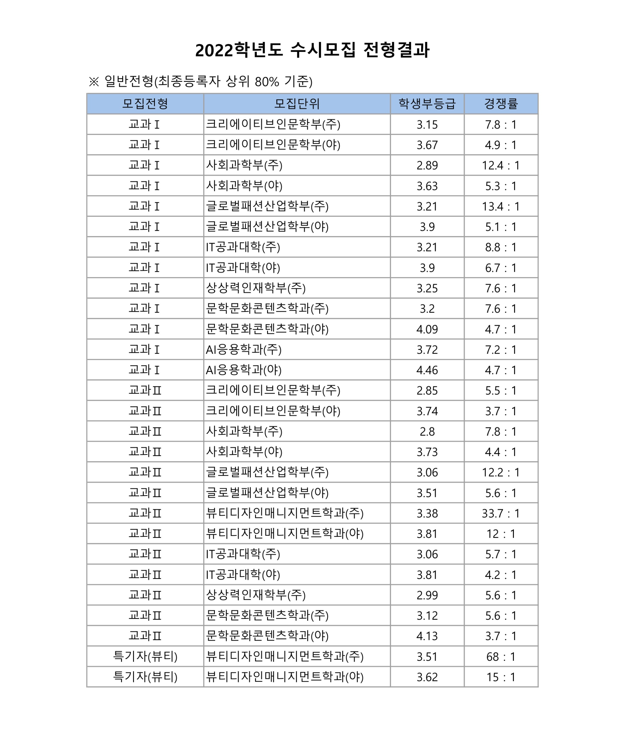 2022학년도 한성대학교 수시모집 전형결과 교과Ⅰ
