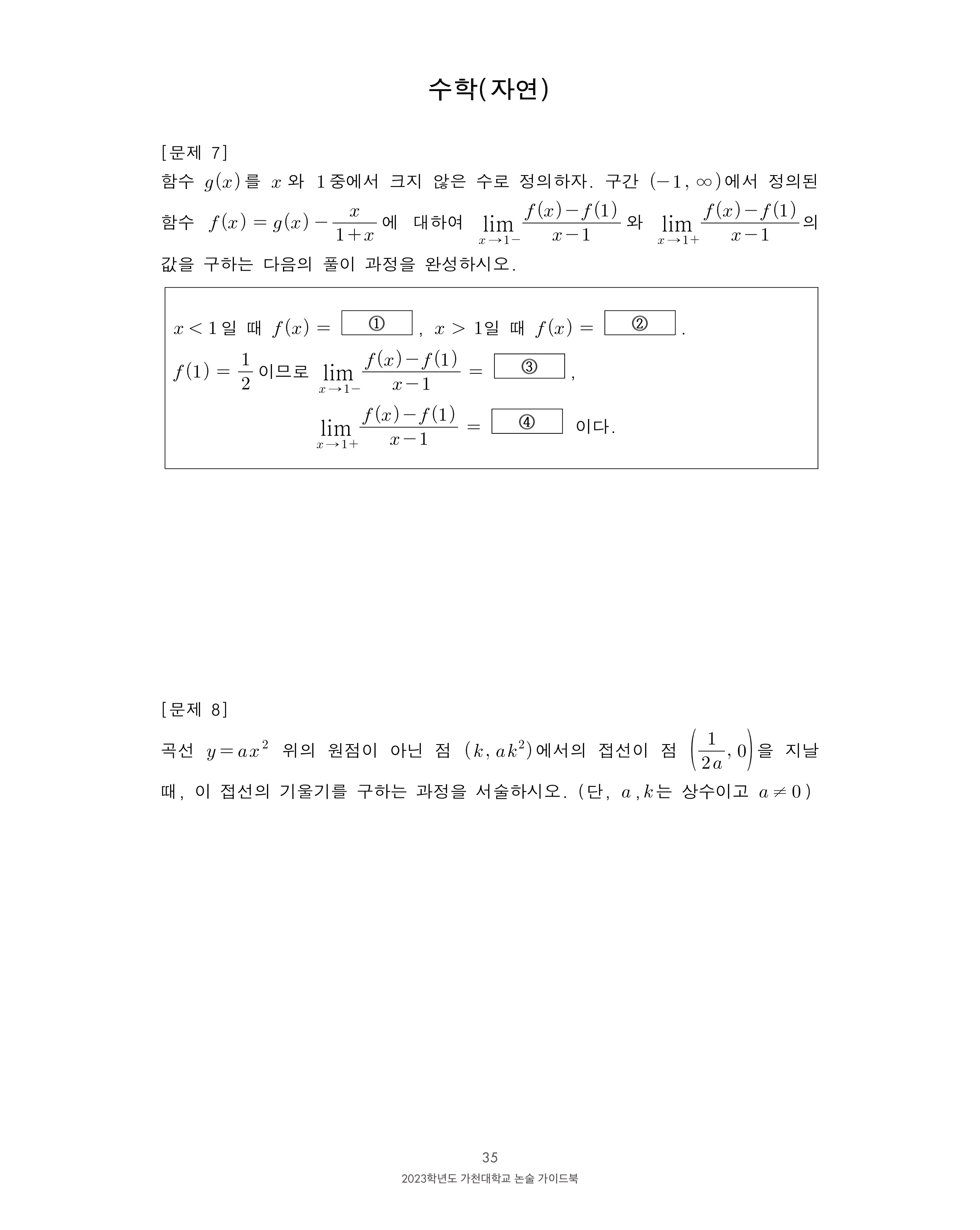 2022학년도 가천대학교 논술 수학(자연) 문제 7, 8