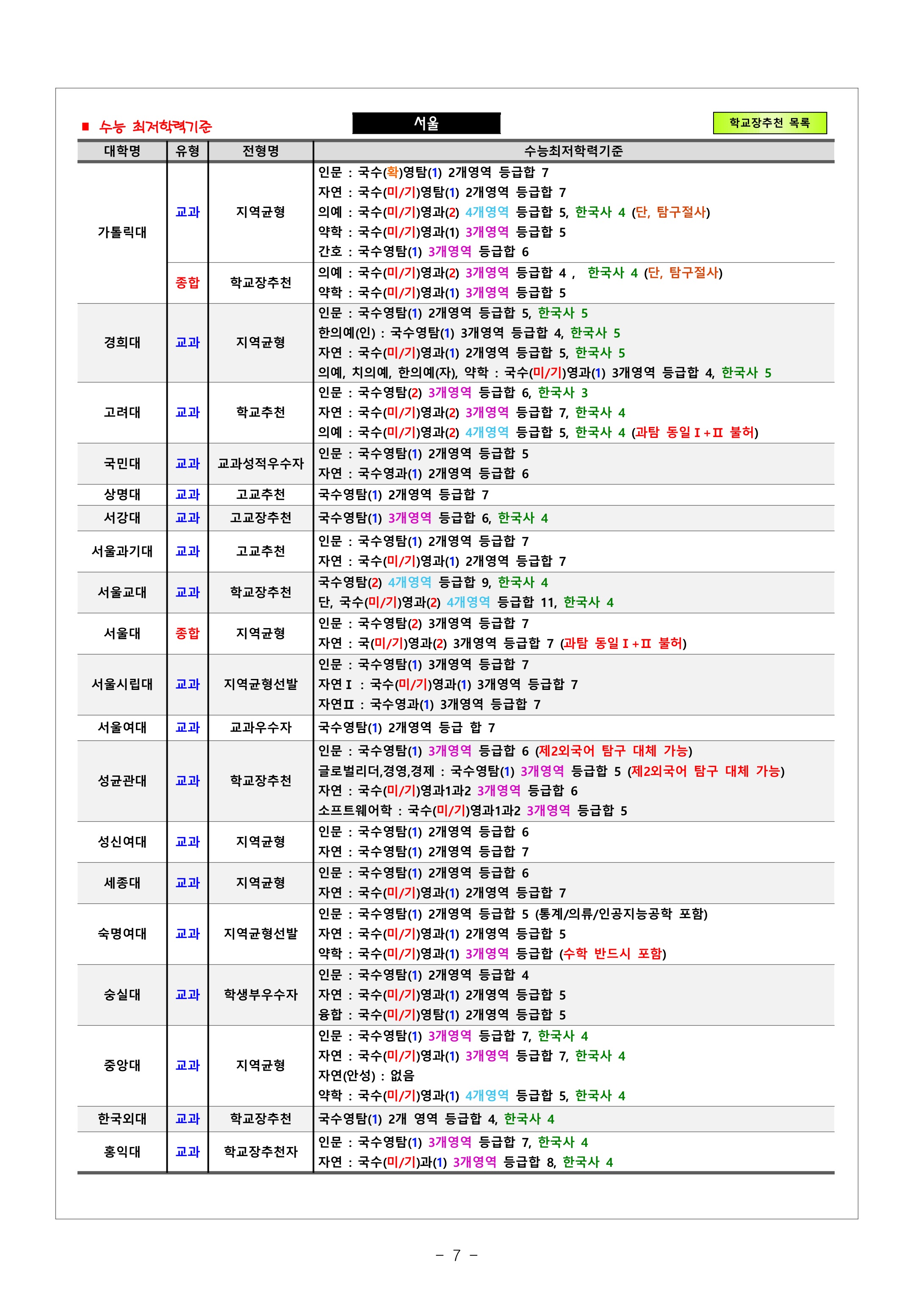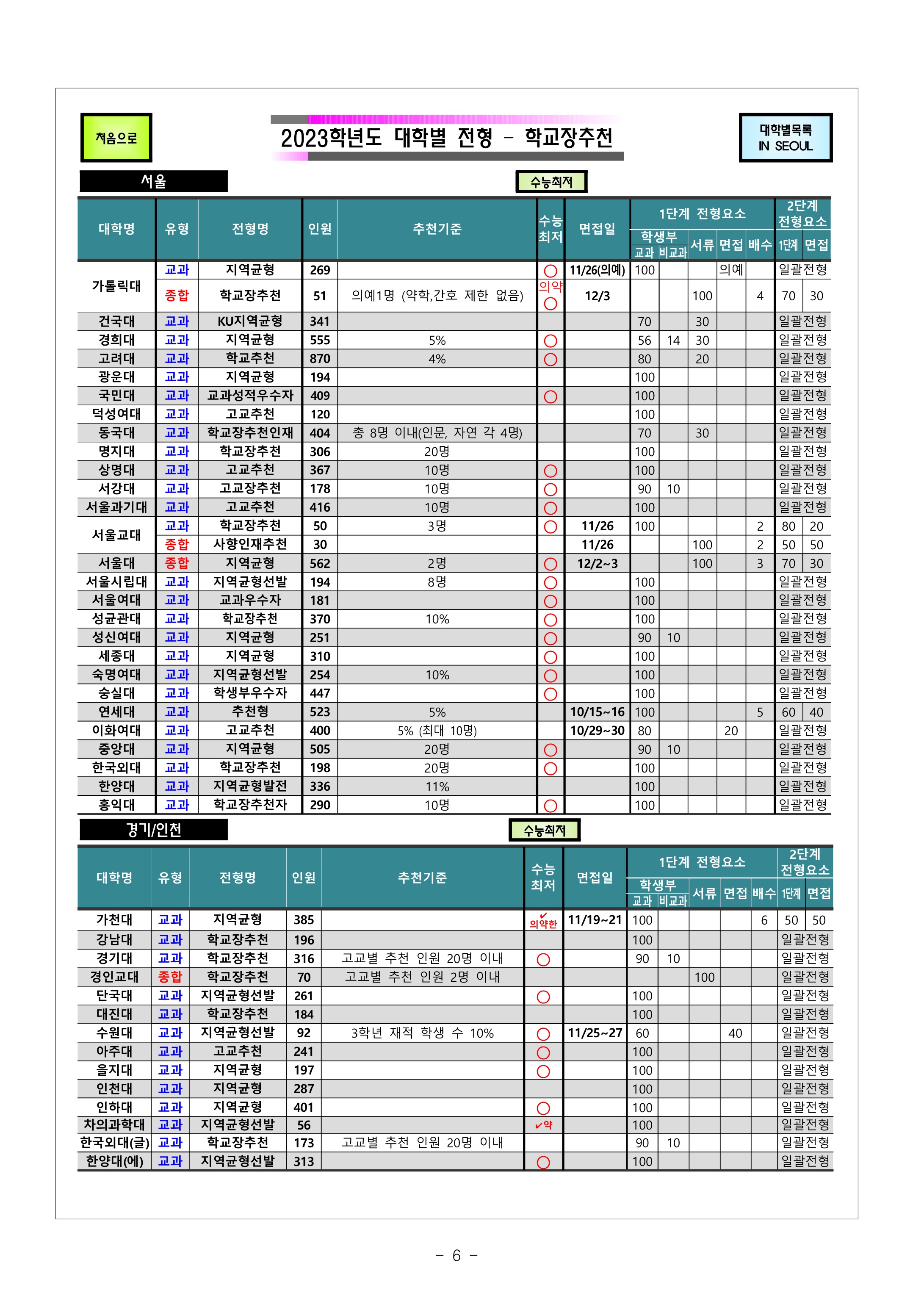 2023학년도 서울 및 경기/인천 학생부교과 전형 수능 최저학력기준 2023학년도 서울 및 경기/인천 학생부교과 전형 수능 최저학력기준 상세