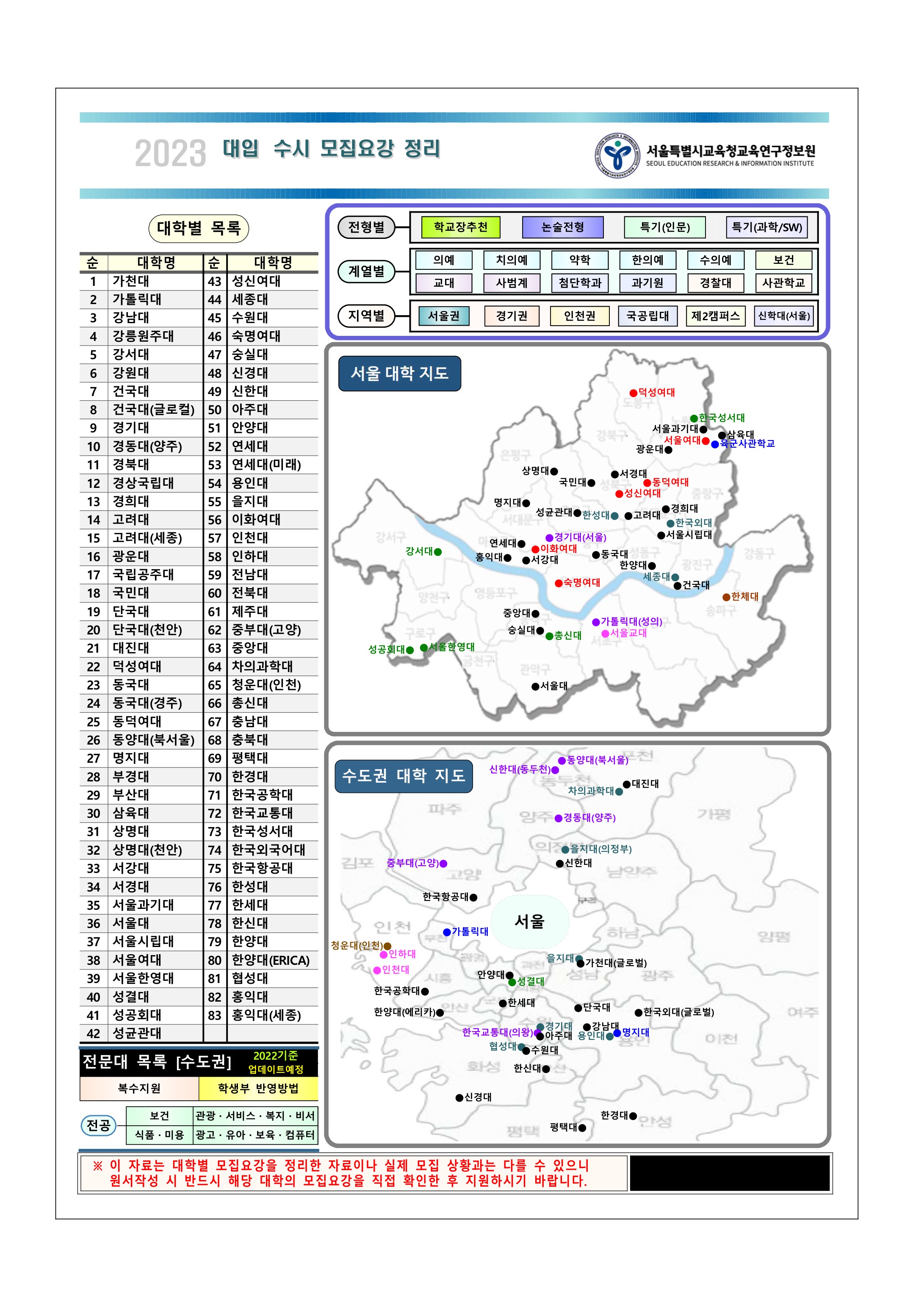 서울 및 수도권 대학 지도 2023학년도 서울권 대학 수능 최저학력기준