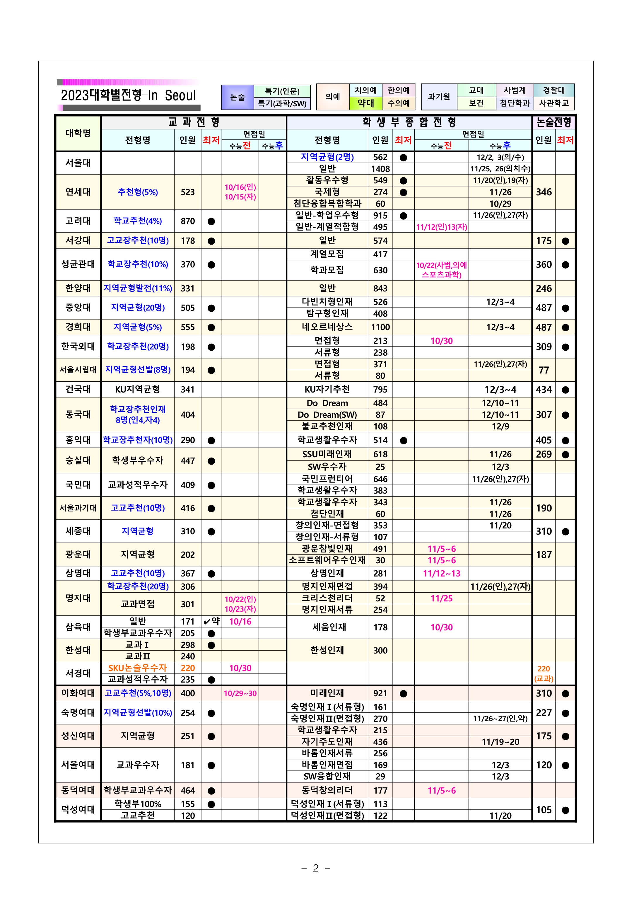 · 학생부종합 전형: 서울대 일부, 연세대 일부, 고려대 일부, 서강대, 성균관대, 한양대, 중앙대, 경희대, 한국외대, 서울시립대, 건국대, 동국대, 숭실대, 국민대, 서울과기대, 세종대, 광운대, 상명대, 명지대, 삼육대, 한성대, 서경대, 숙명여대, 성신여대, 서울여대, 동덕여대, 덕성여대