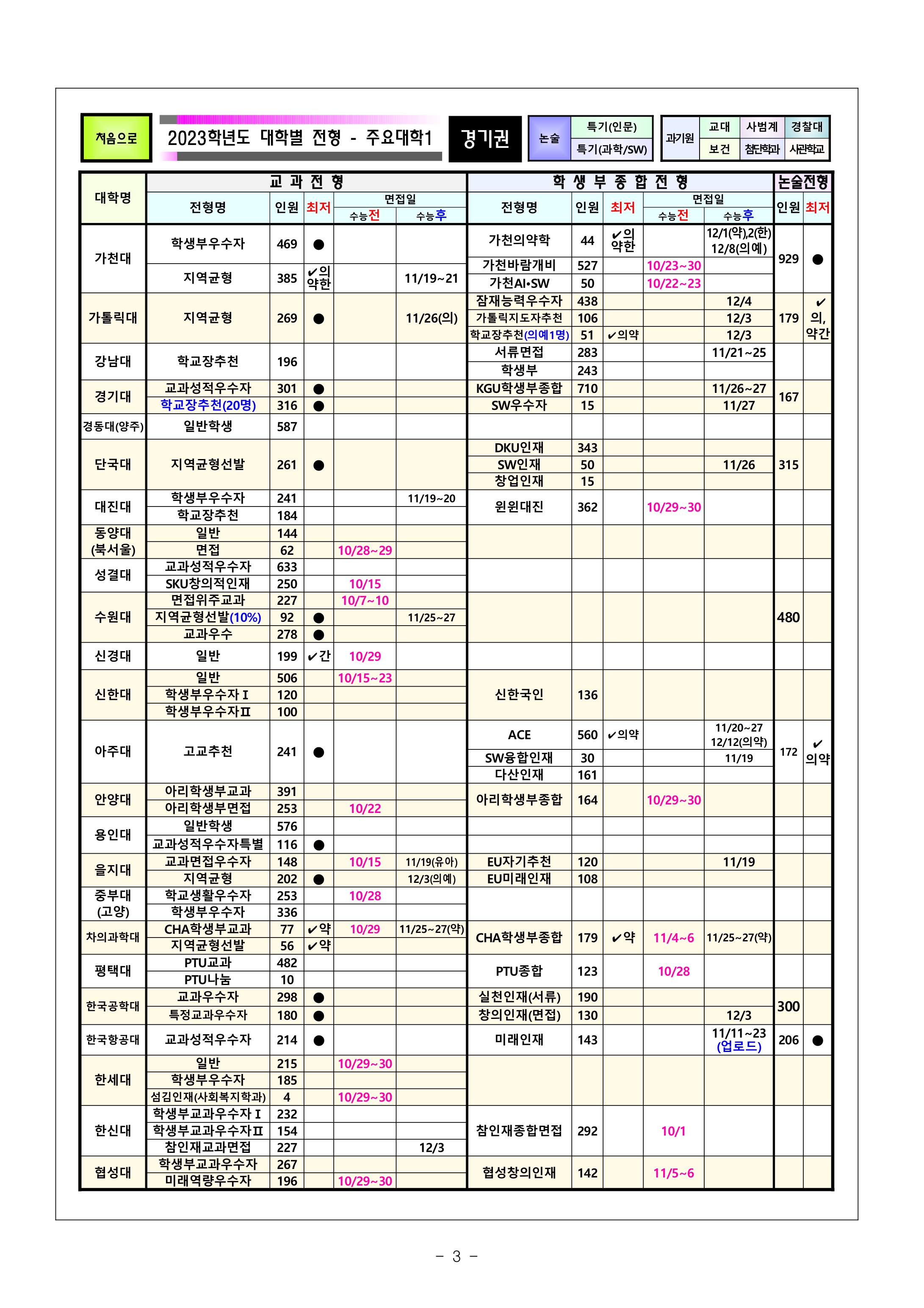 2023학년도 경기권 대학 수능 최저학력기준 2023학년도 경기권 수능 최저 없는 대학