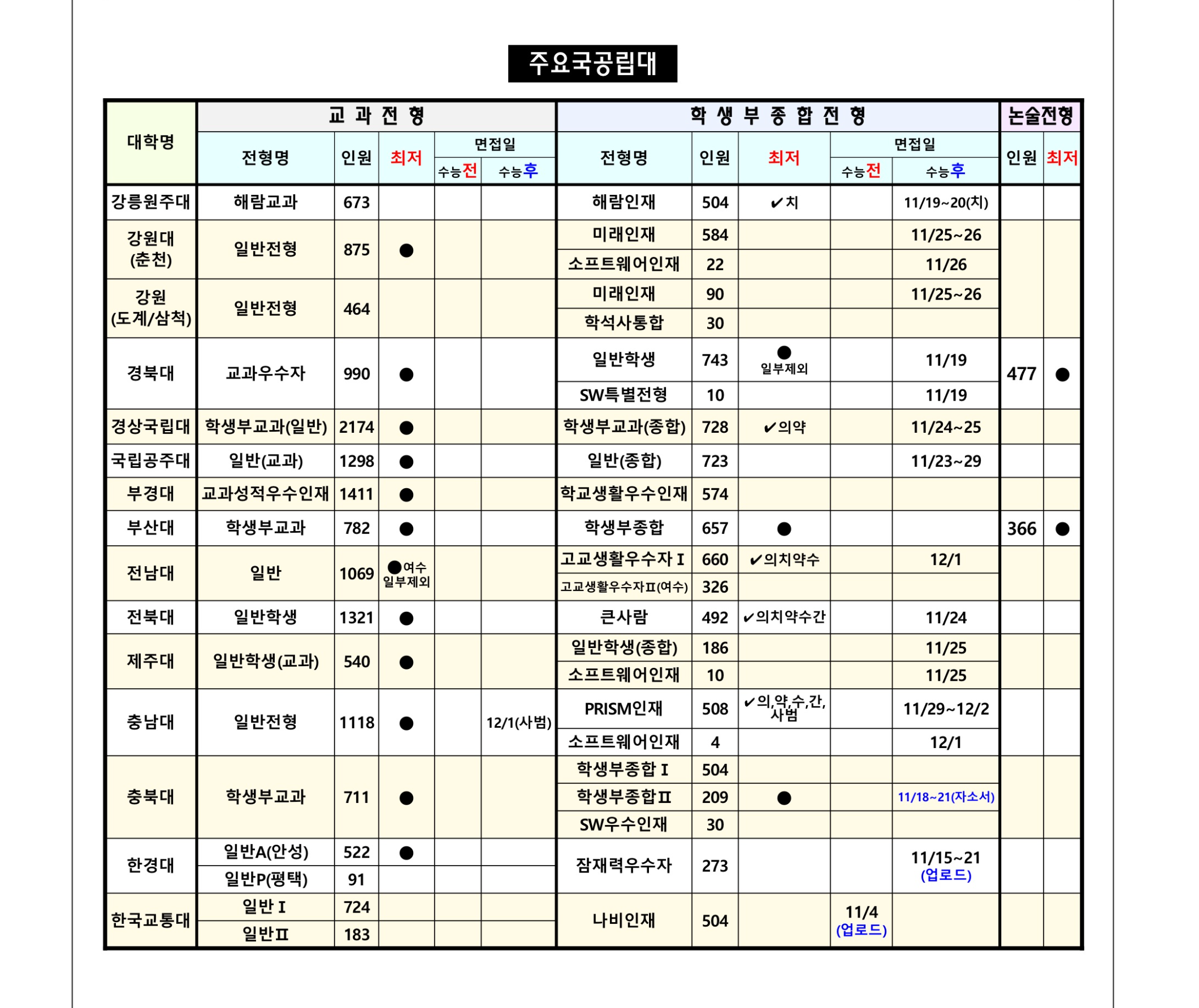 · 학생부교과 전형: 강릉원주대, 강원대, 한경대 일부, 한국교통대
