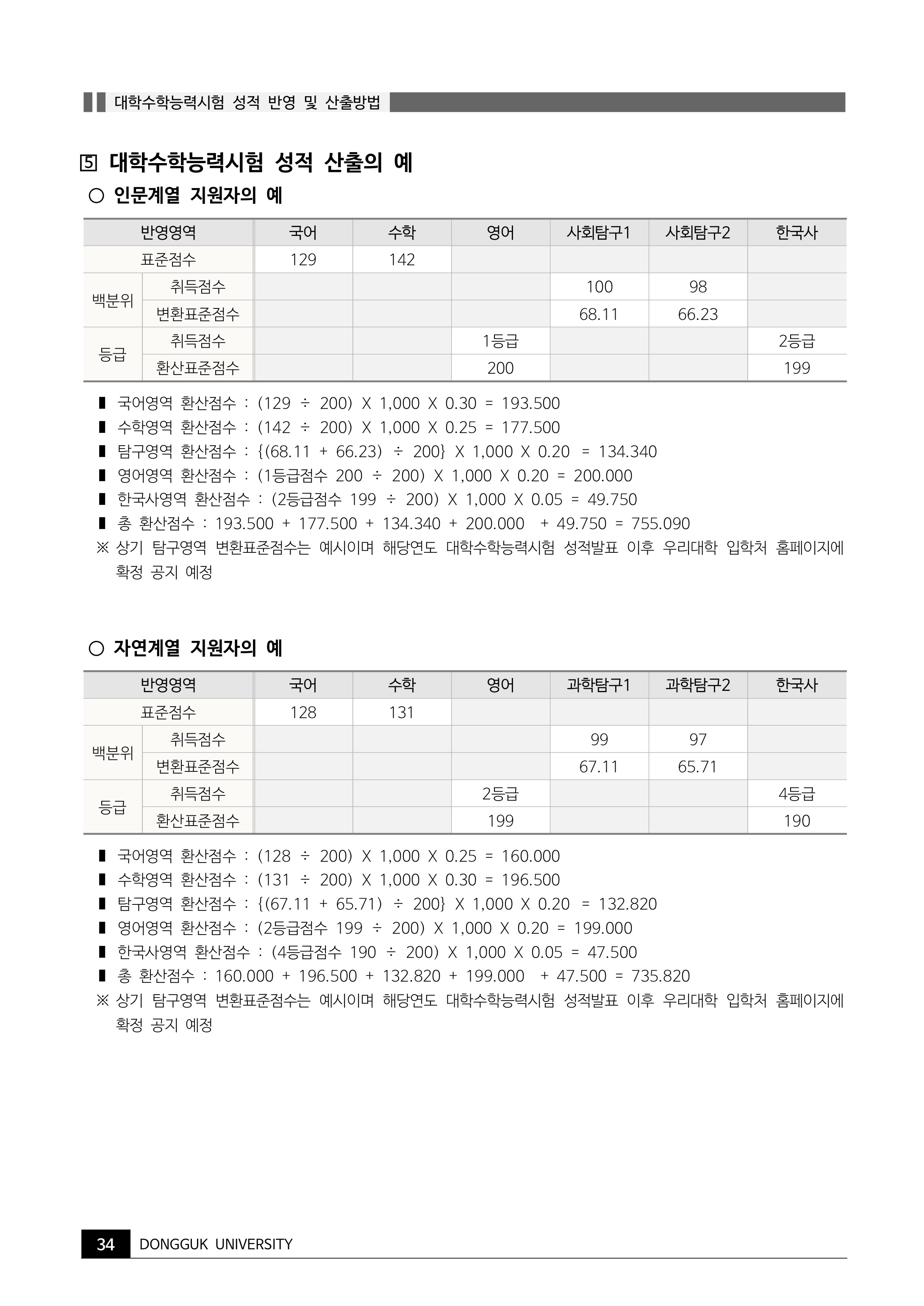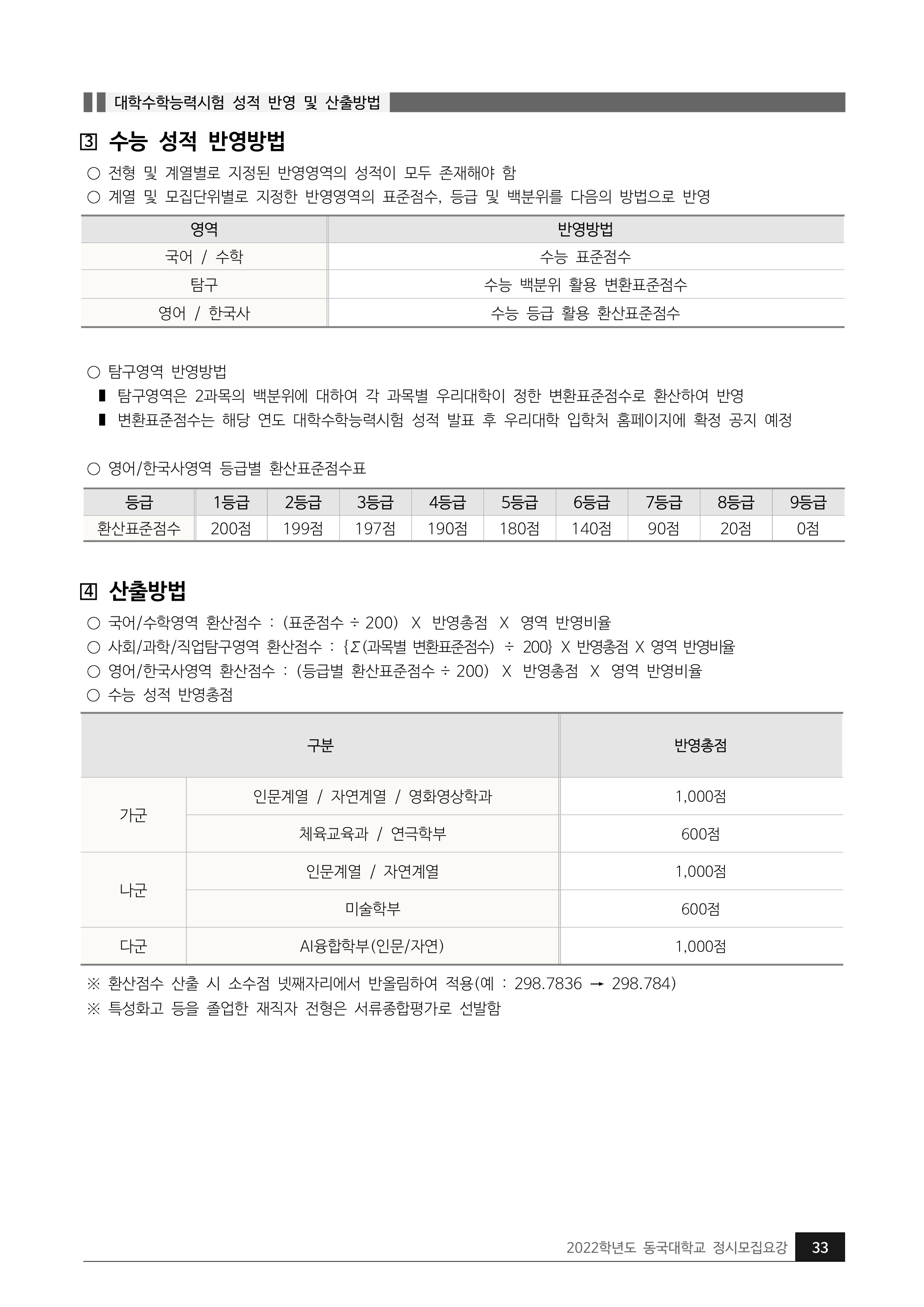 2022학년도 동국대학교 대학수학능력시험 성적 반영 및 산출방법