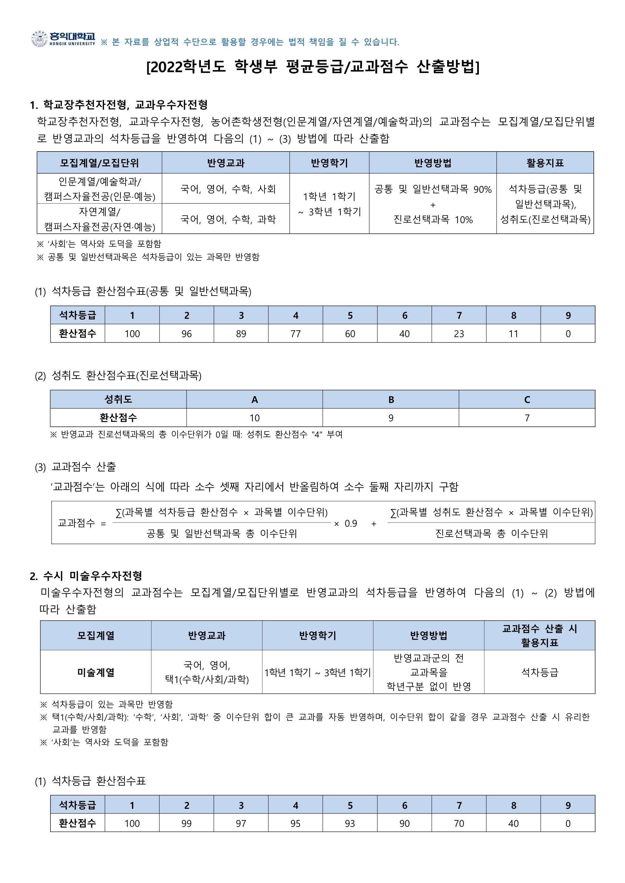 2022학년도 홍익대학교 학생부 평균등급/교과점수 산출방법