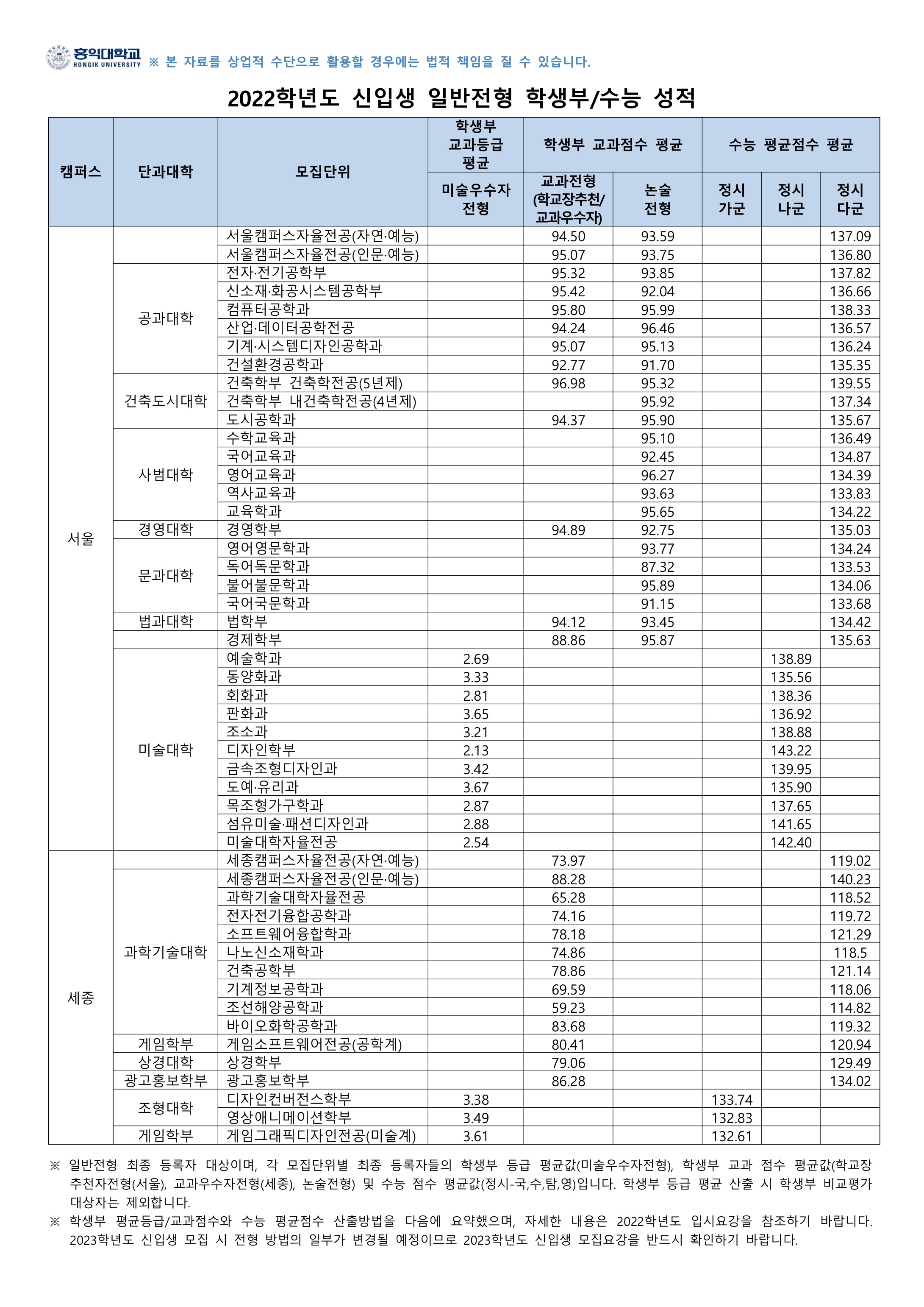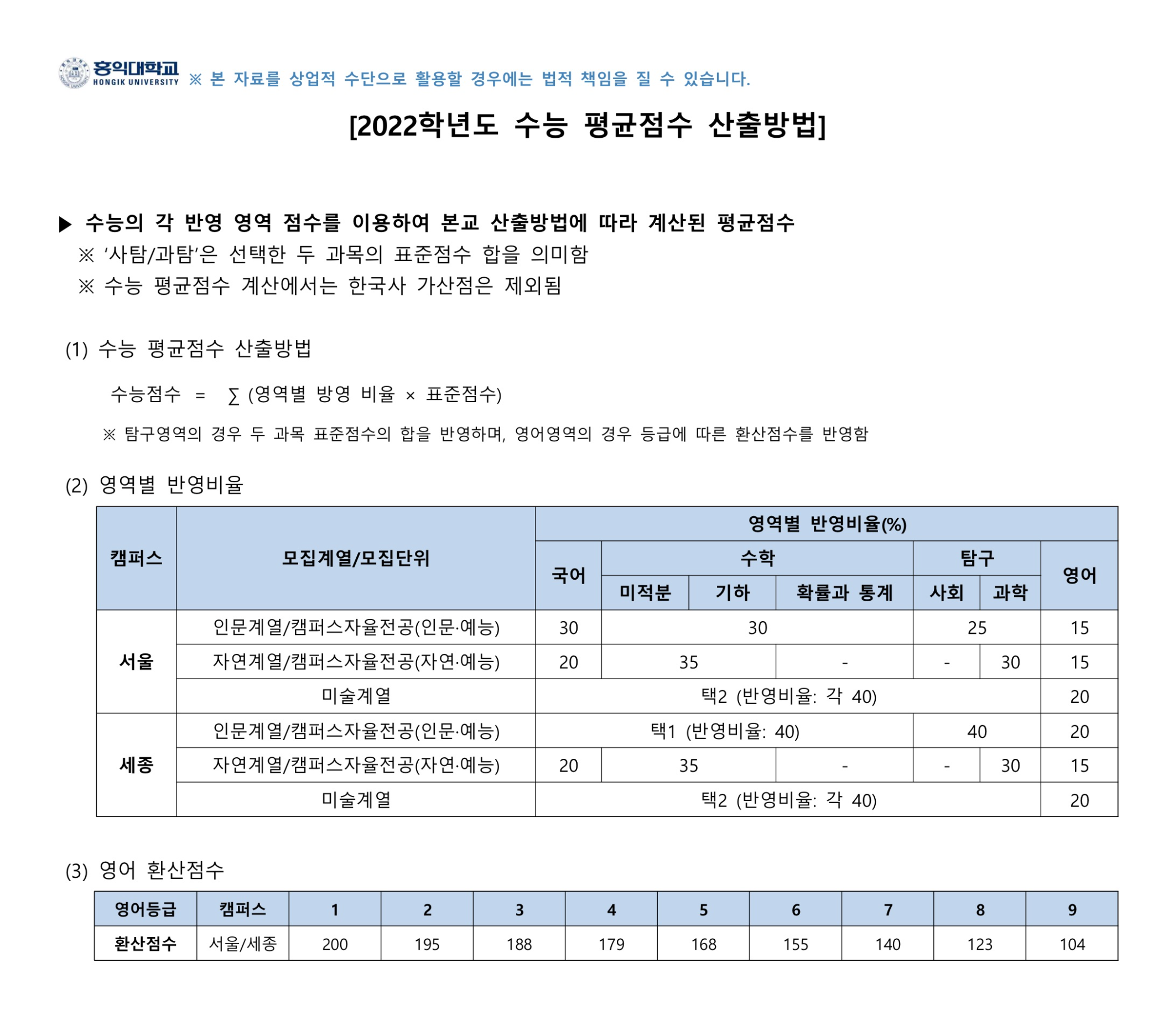 구분 2022학년도 2023학년도 비고 정시모집 모든 전형 영어영역 만점 200점 영어영역 만점 100점 영어 환산점수 만점 조정 2022학년도 홍익대학교 학생부 평균등급/교과점수 산출방법