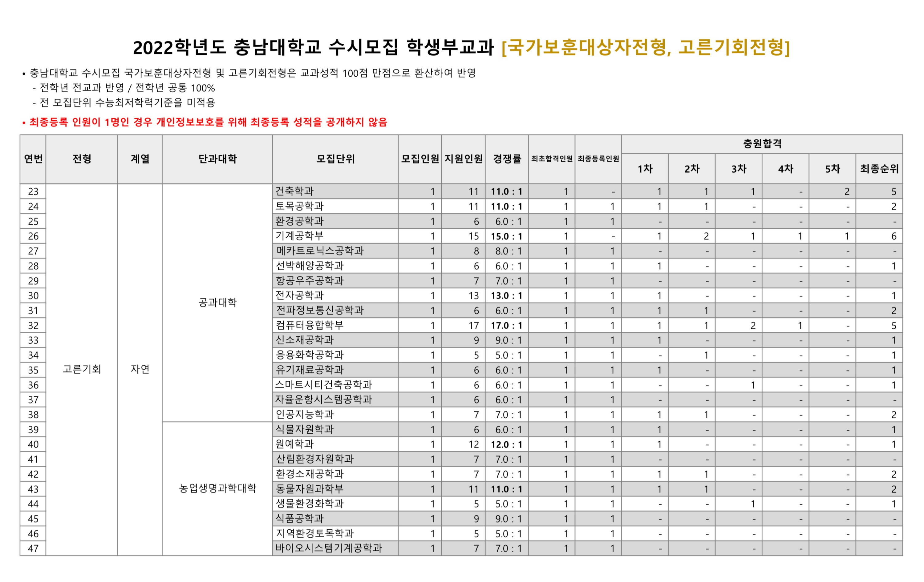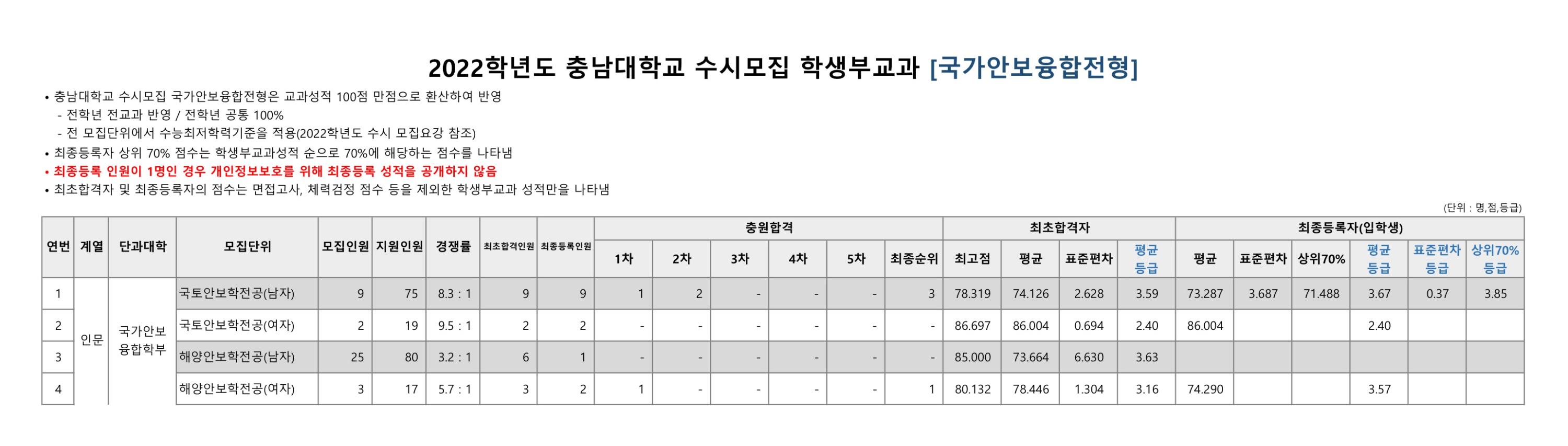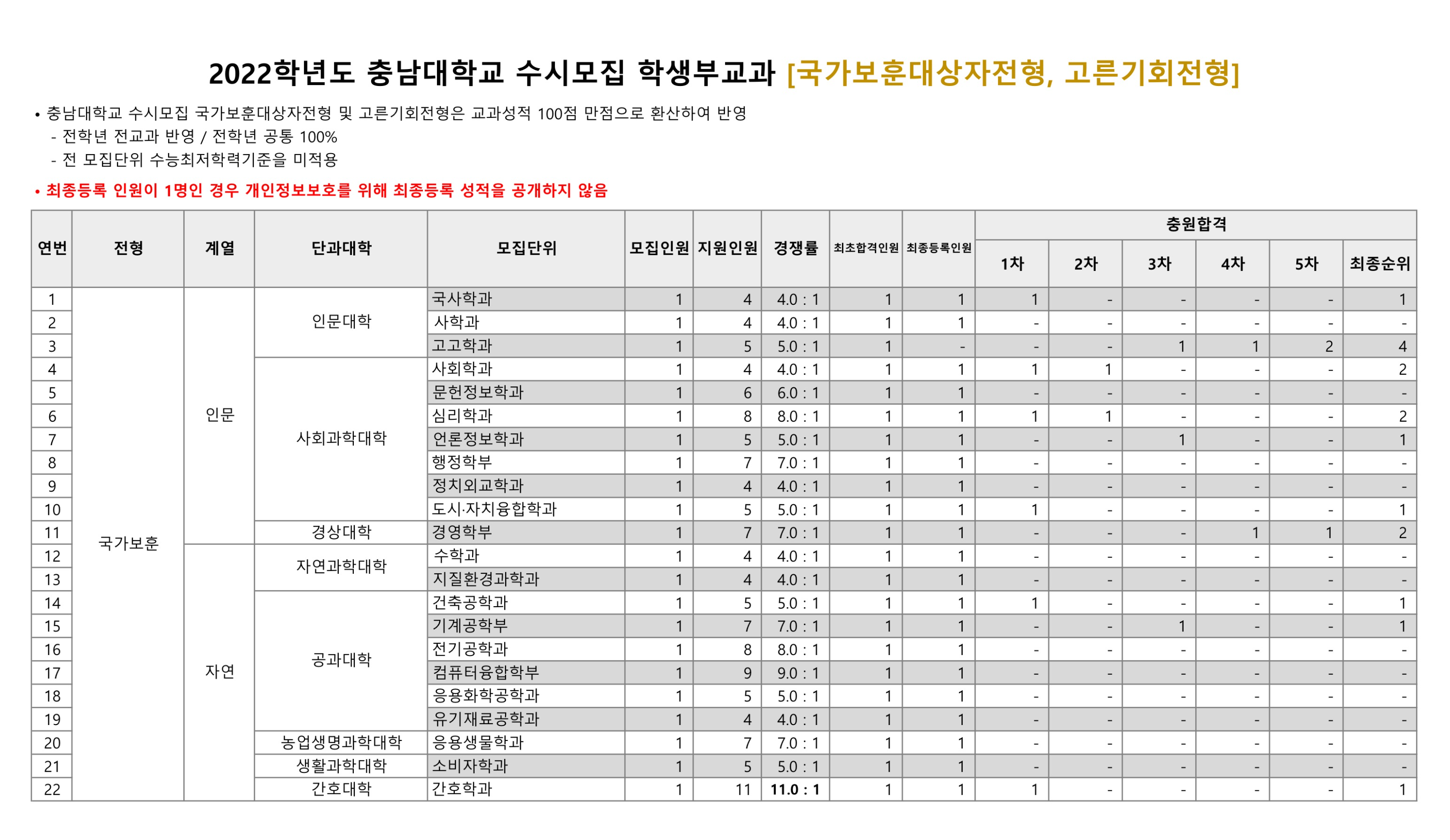 2022학년도 충남대학교 학생부교과 국가보훈대상자전형, 고른기회전형 수시등급 2022학년도 충남대학교 학생부교과 국가안보융합전형 수시등급