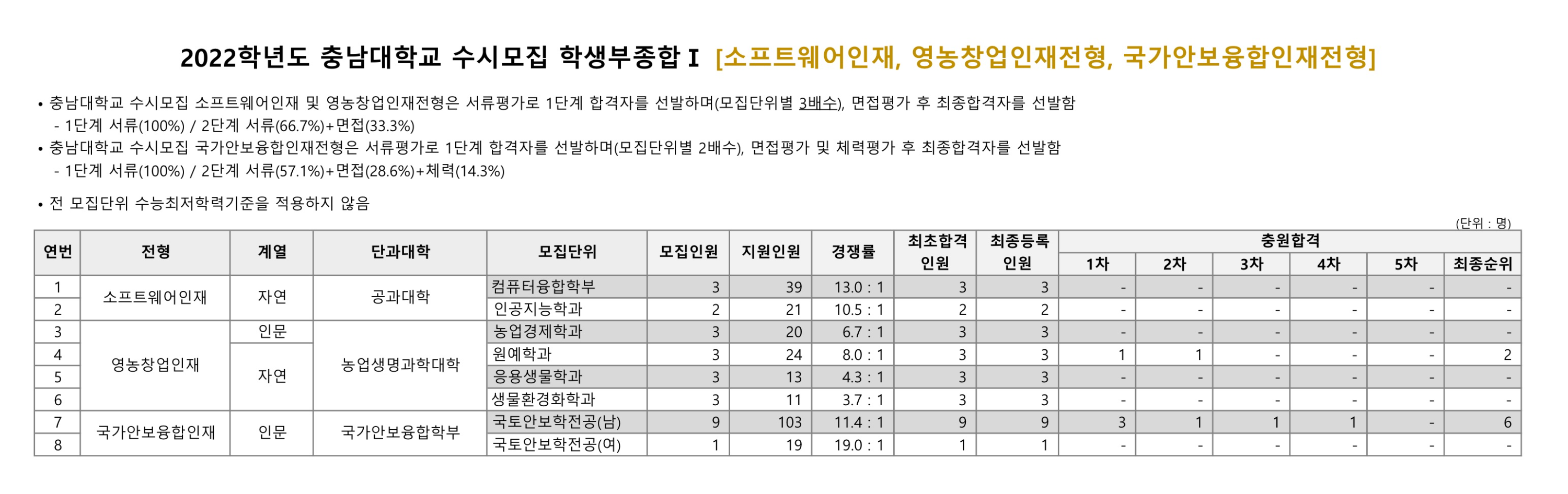 2022학년도 충남대학교 학생부종합Ⅰ 소프트웨어인재, 영농창업인재전형, 국가안보융합인재전형 수시등급 2022학년도 충남대학교 학생부종합Ⅱ 농어촌 수시등급