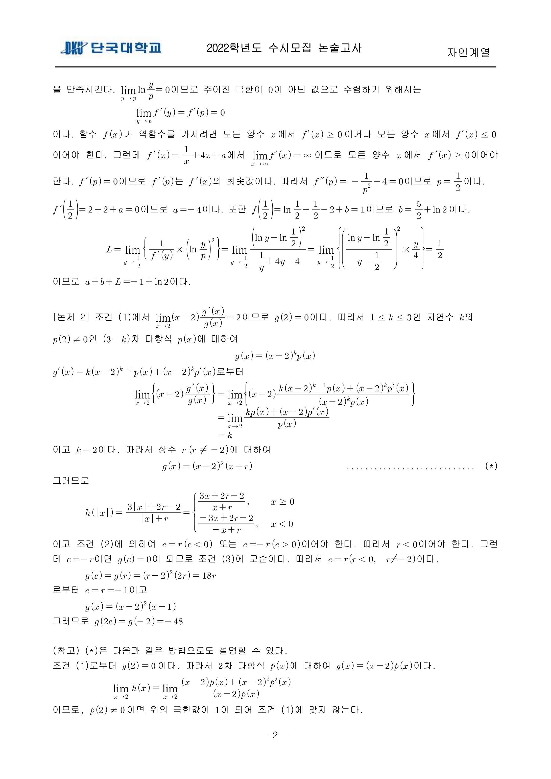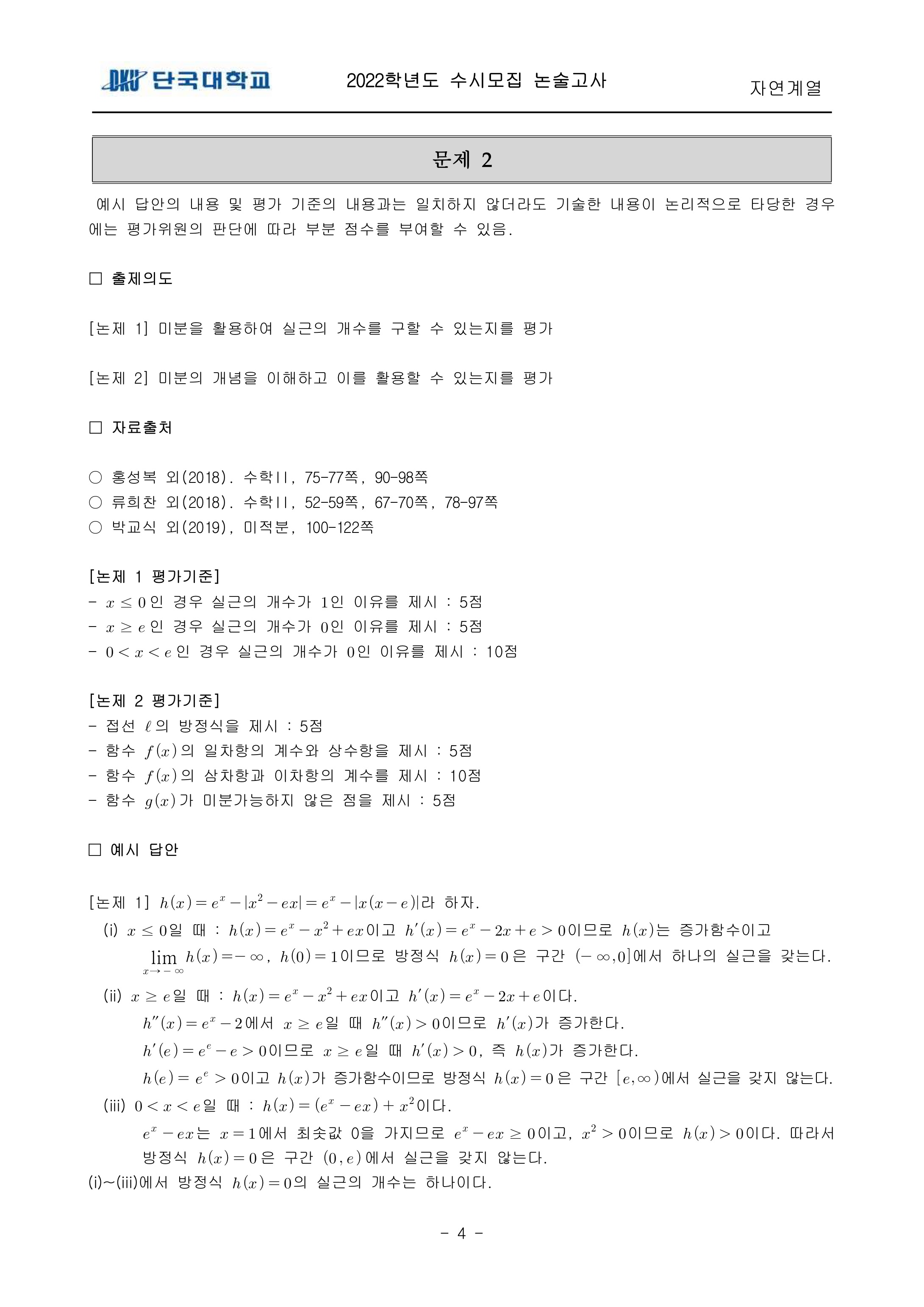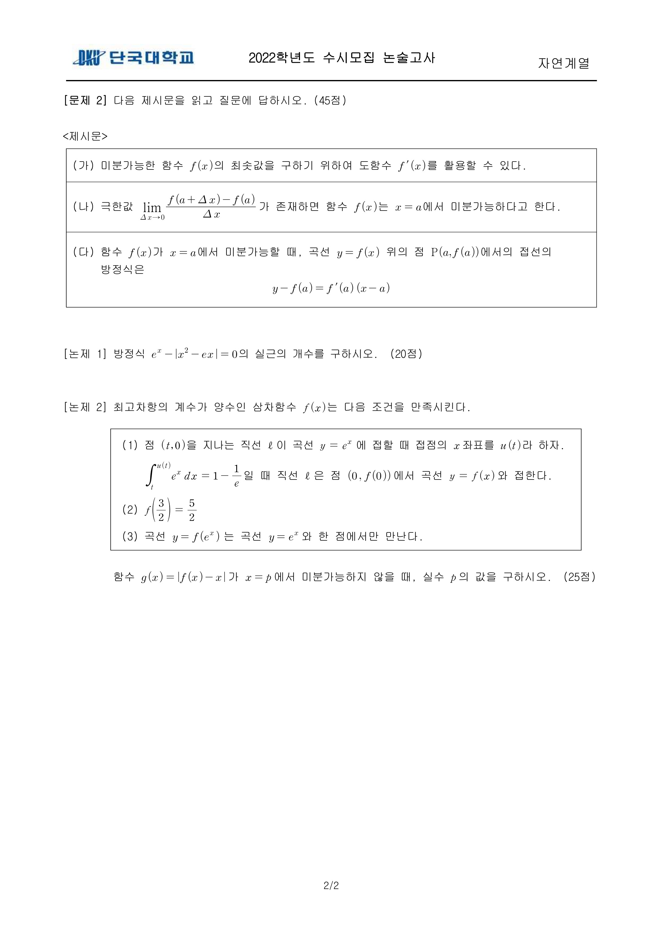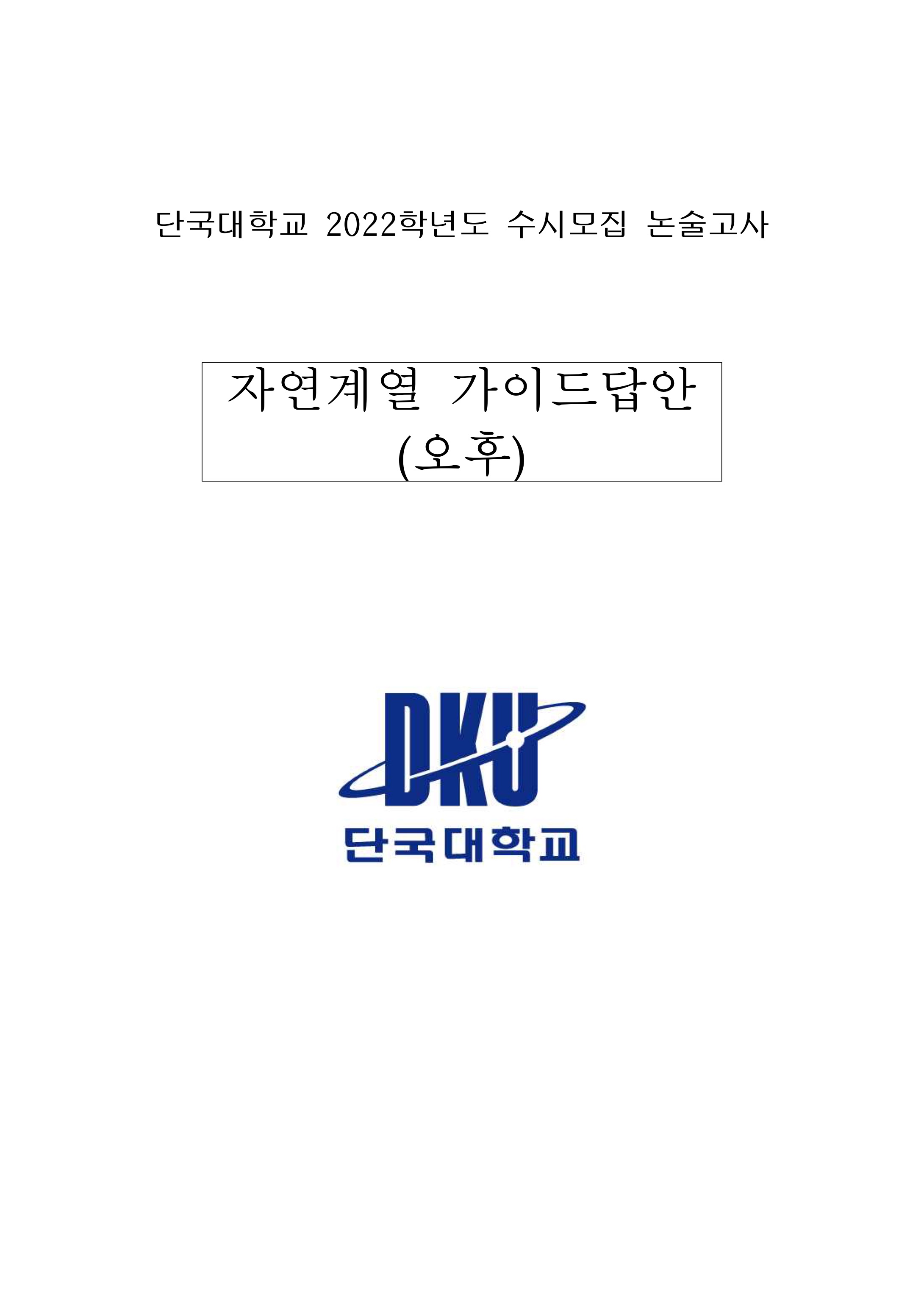 2022학년도 단국대학교 논술고사 문제 및 답안