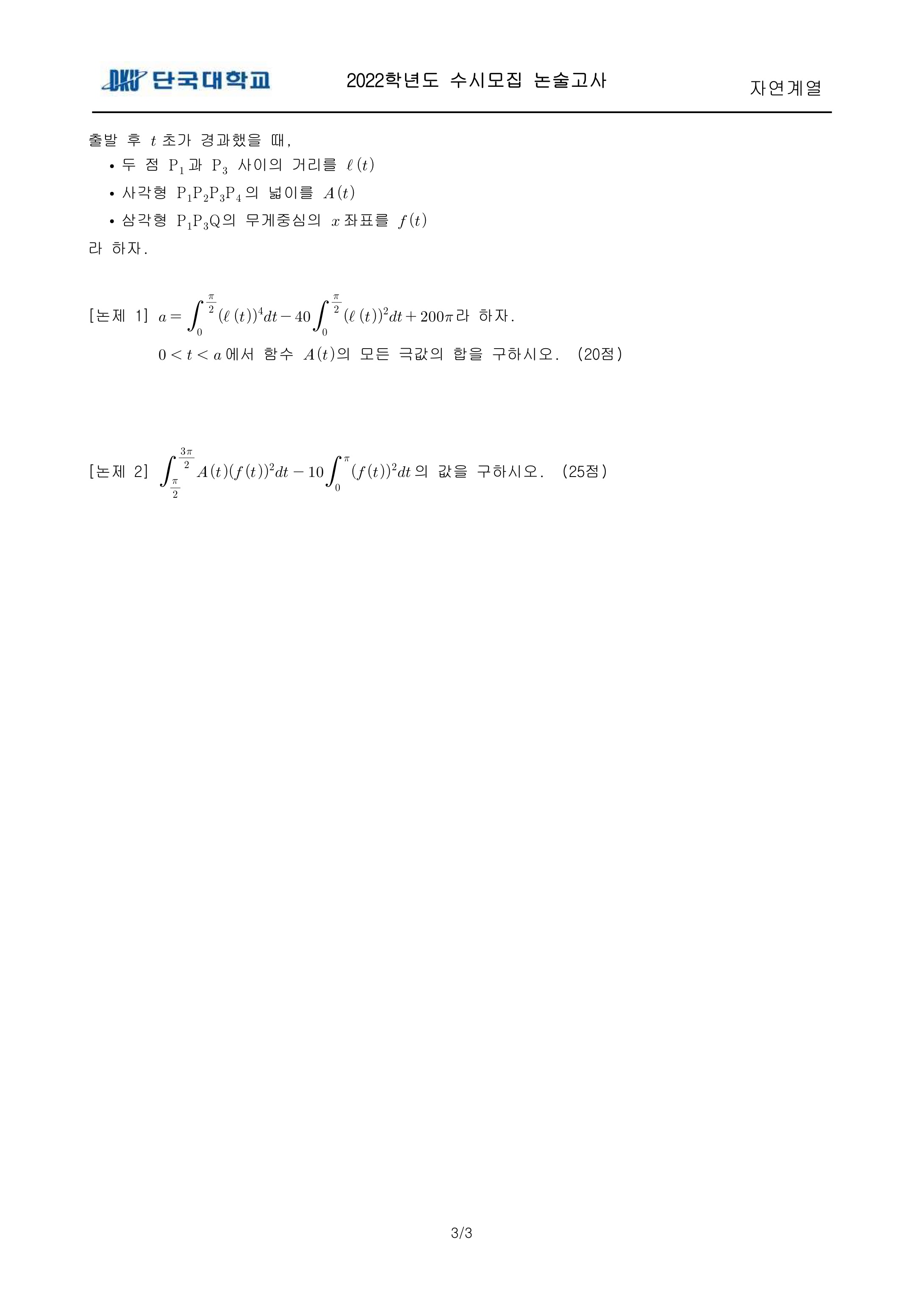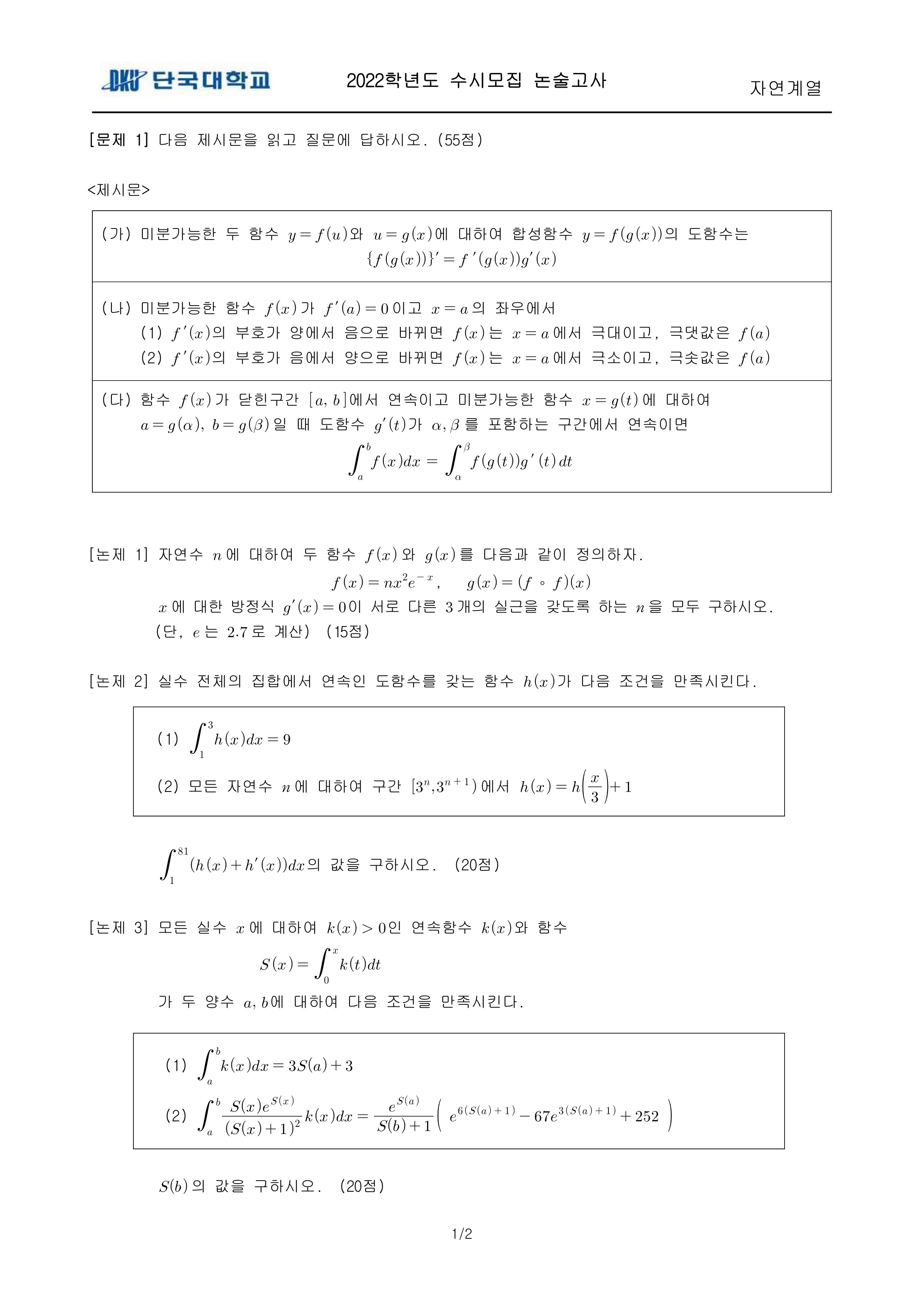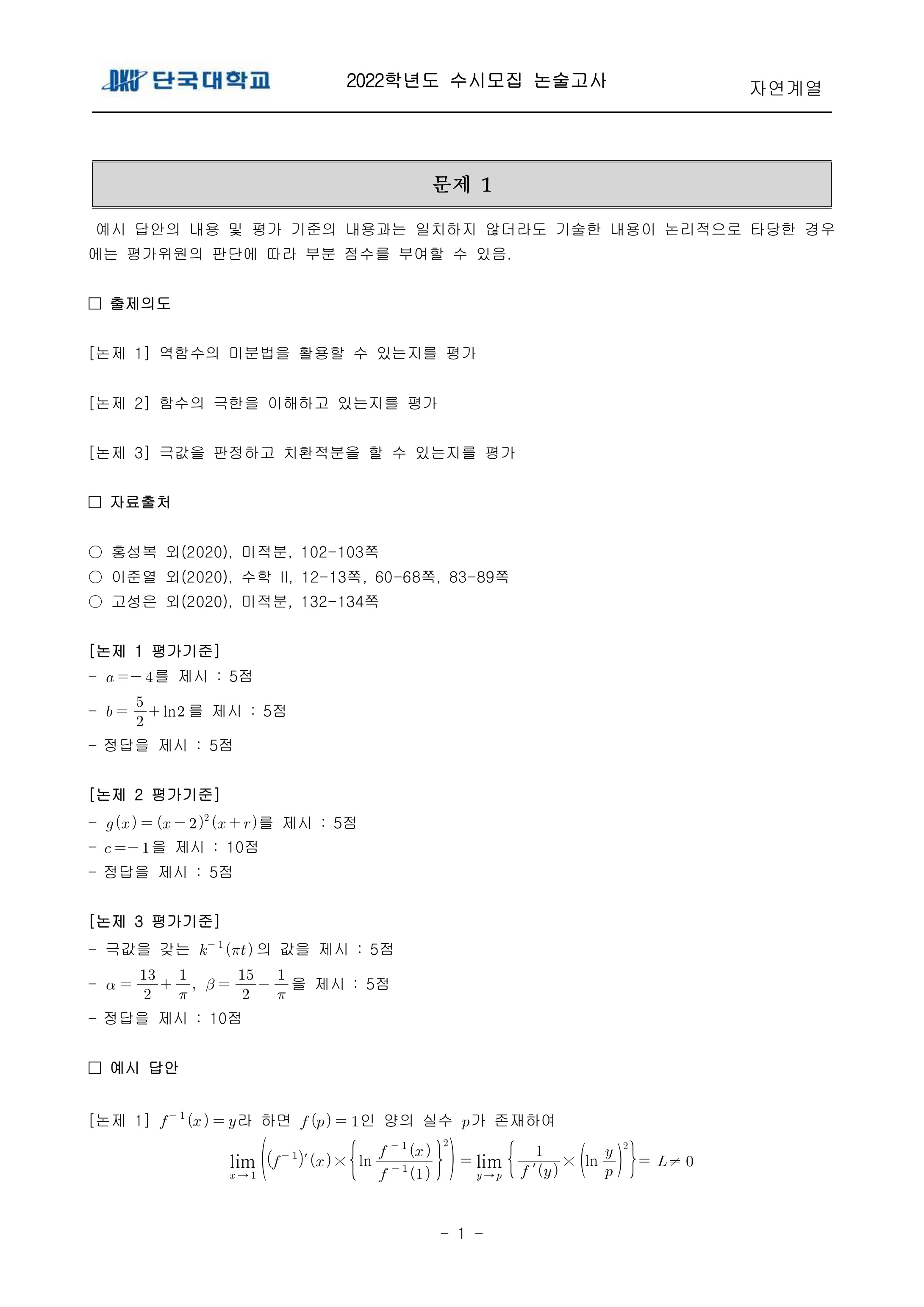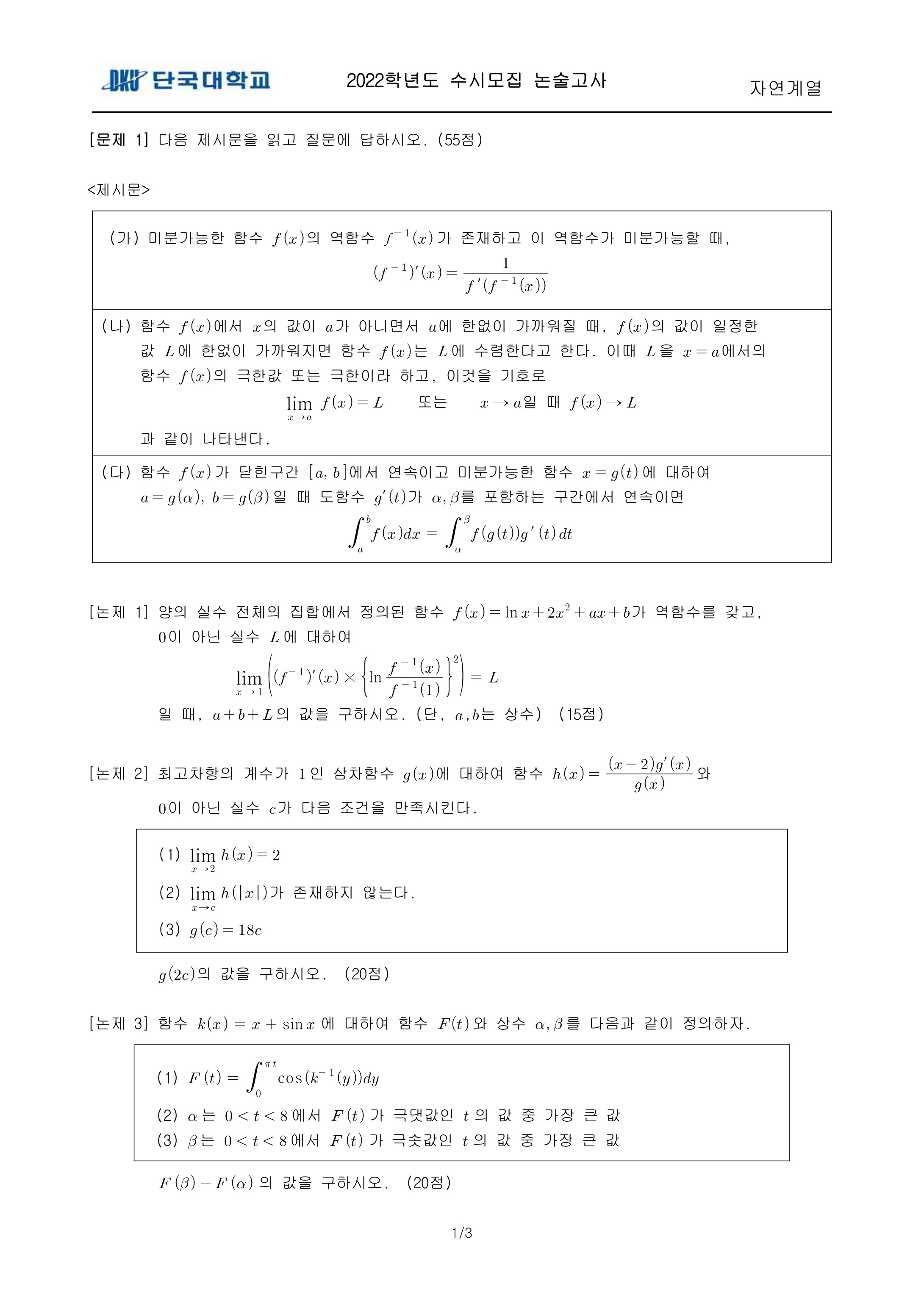 2022학년도 단국대학교 논술고사 자연계열 (오후) 기출문제 2022학년도 단국대학교 논술고사 자연계열 (오후) 해설