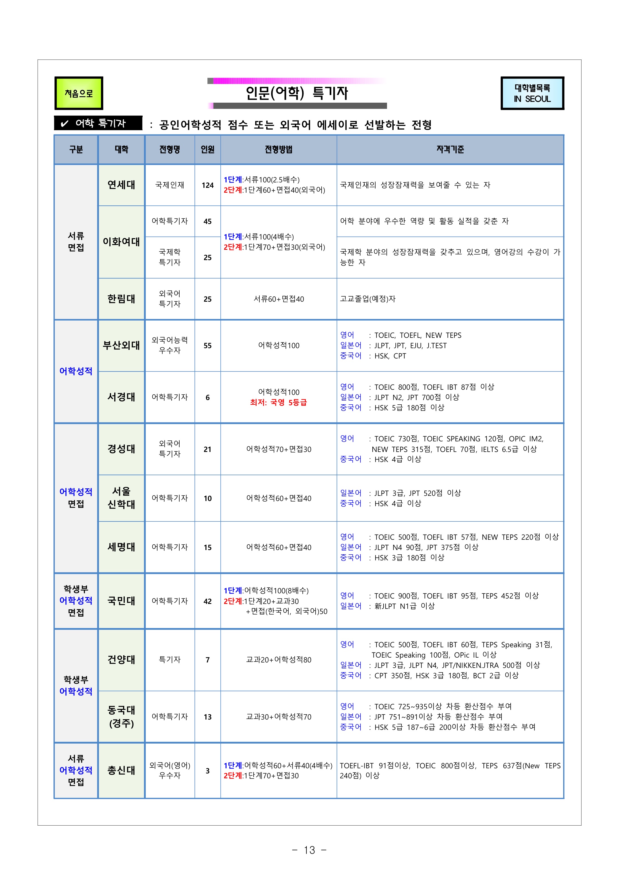 어학성적+면접: 경성대, 서울신학대, 세명대