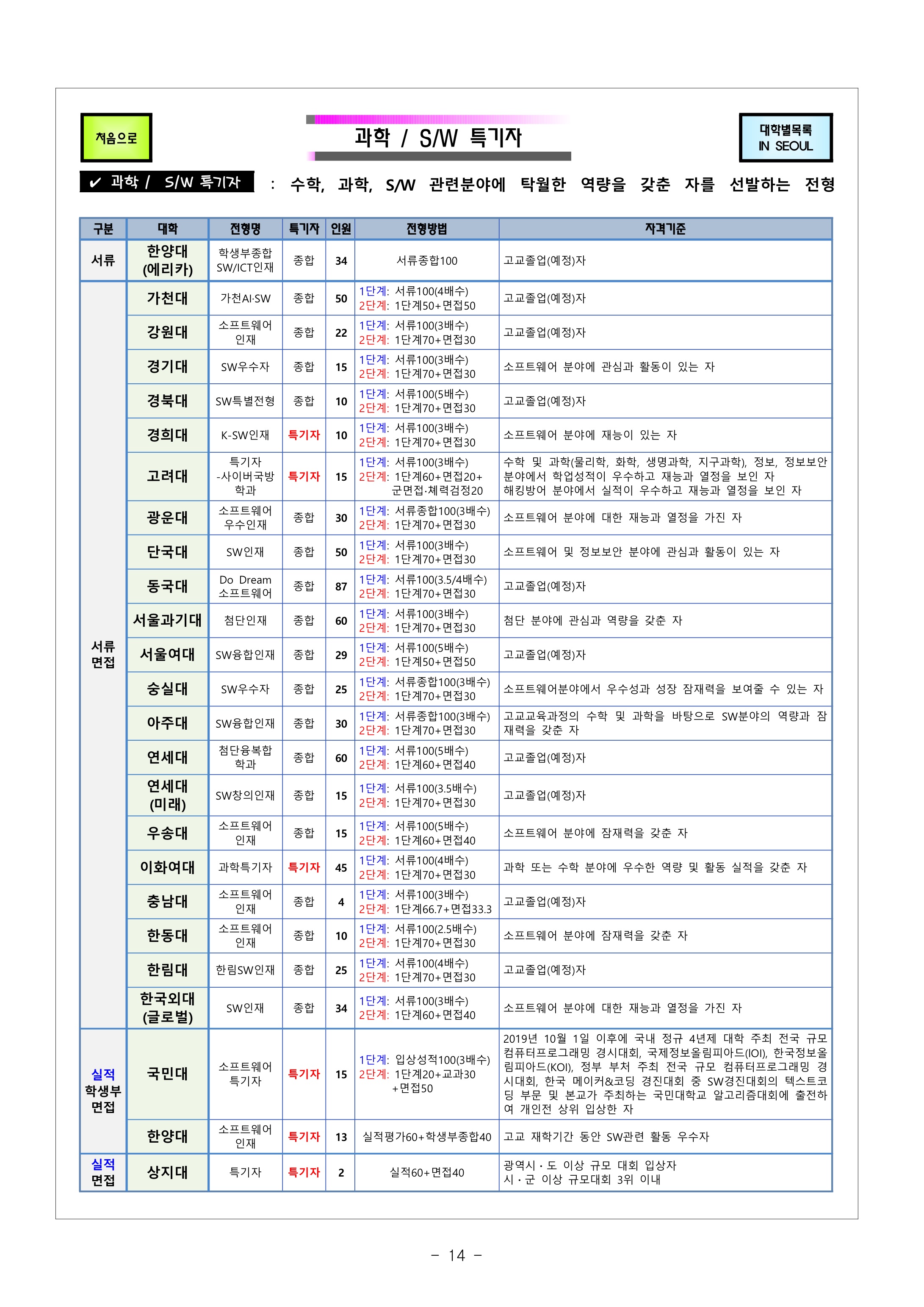 서류+면접: 가천대, 강원대, 경기대, 경북대, 경희대, 고려대, 광운대, 단국대, 동국대, 서울과기대, 서울여대, 숭실대, 아주대, 연세대, 연세대(미래), 우송대, 이화여대, 충남대, 한동대, 한림대, 한국외대(글로벌)