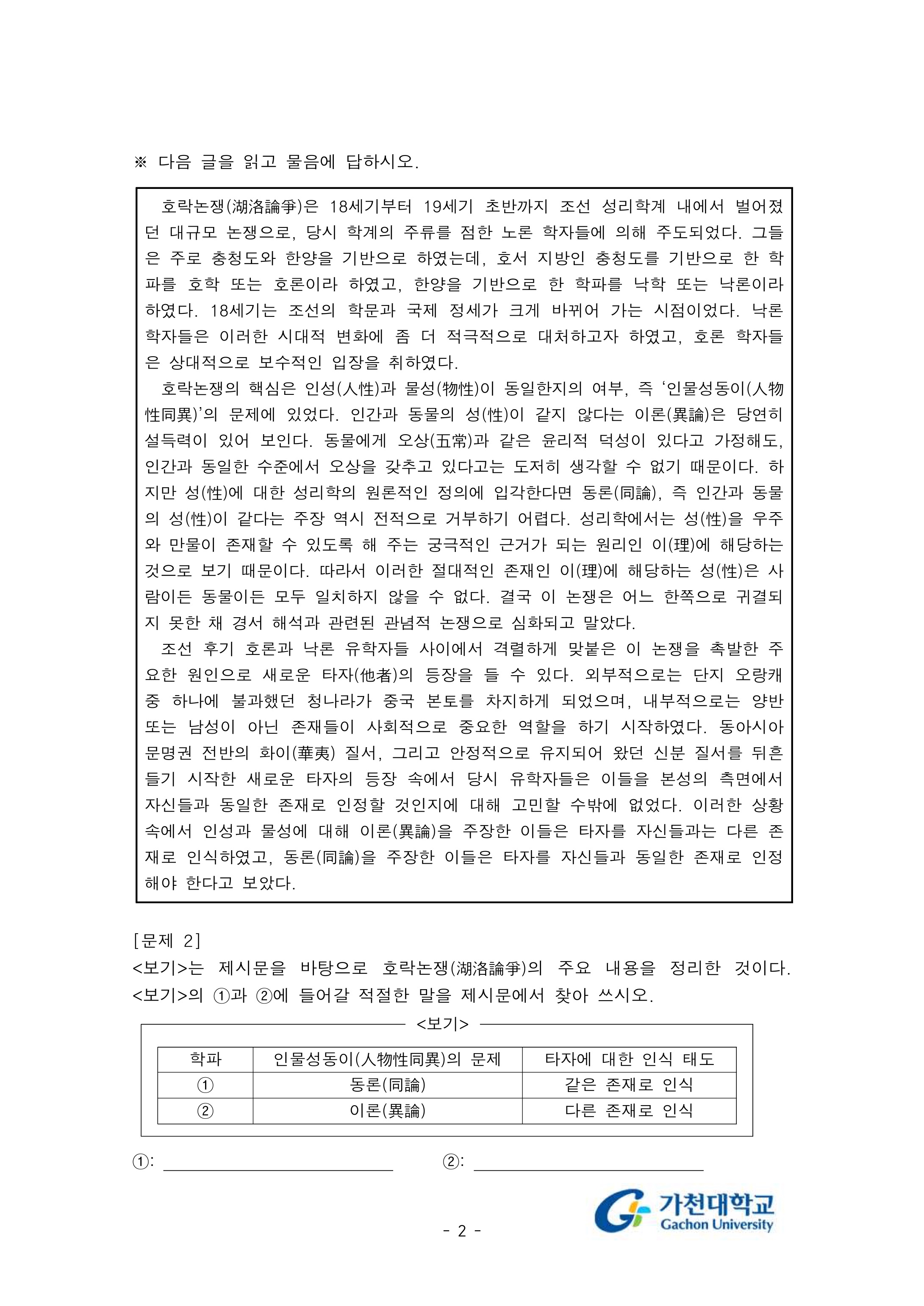 2023학년도 가천대학교 모의논술 문제 B형 2023학년도 가천대학교 모의논술 모범답안 B형