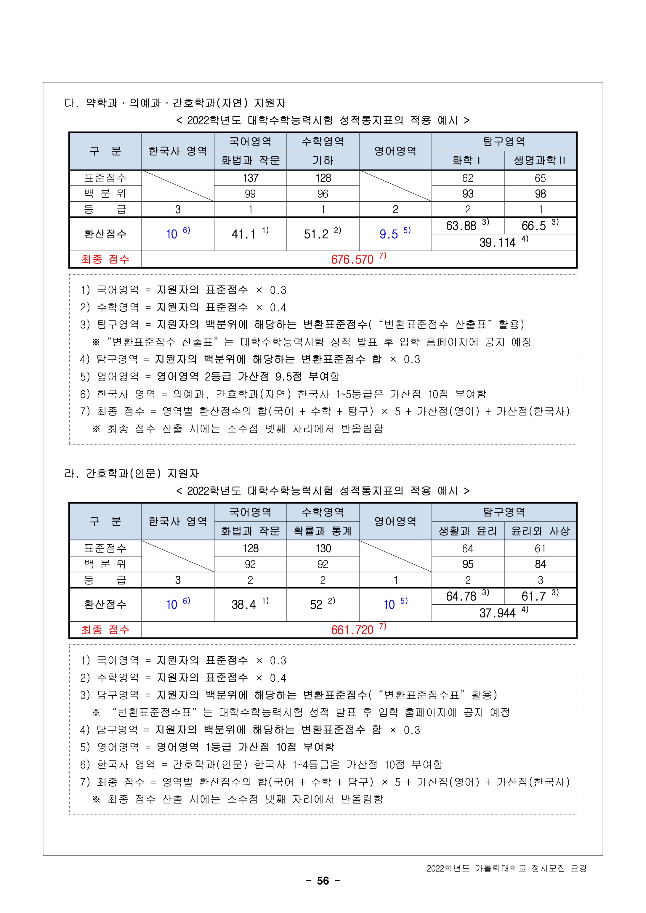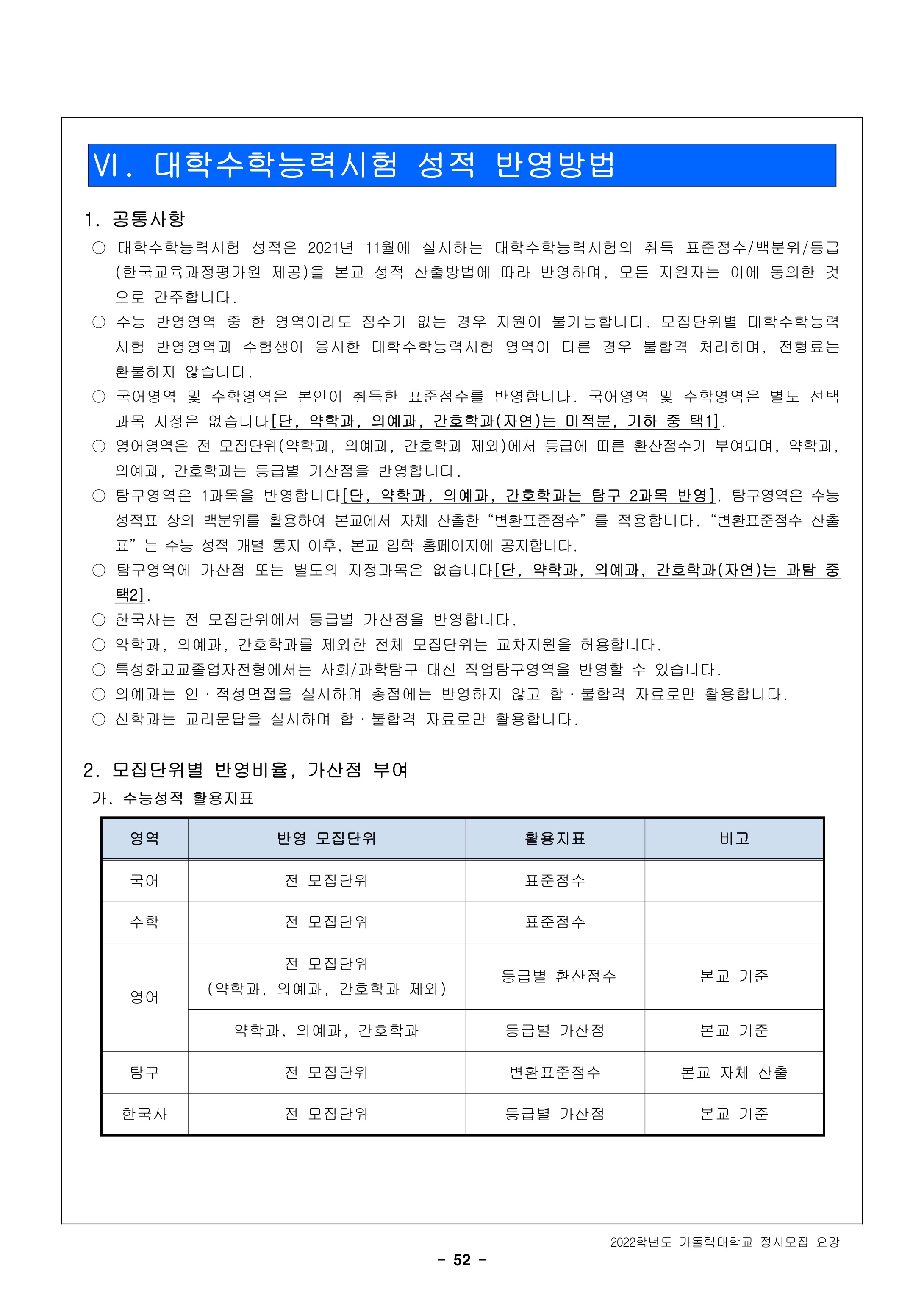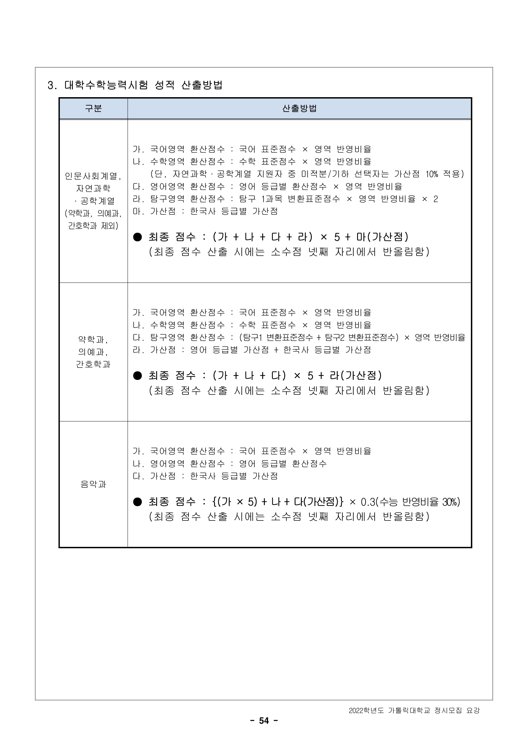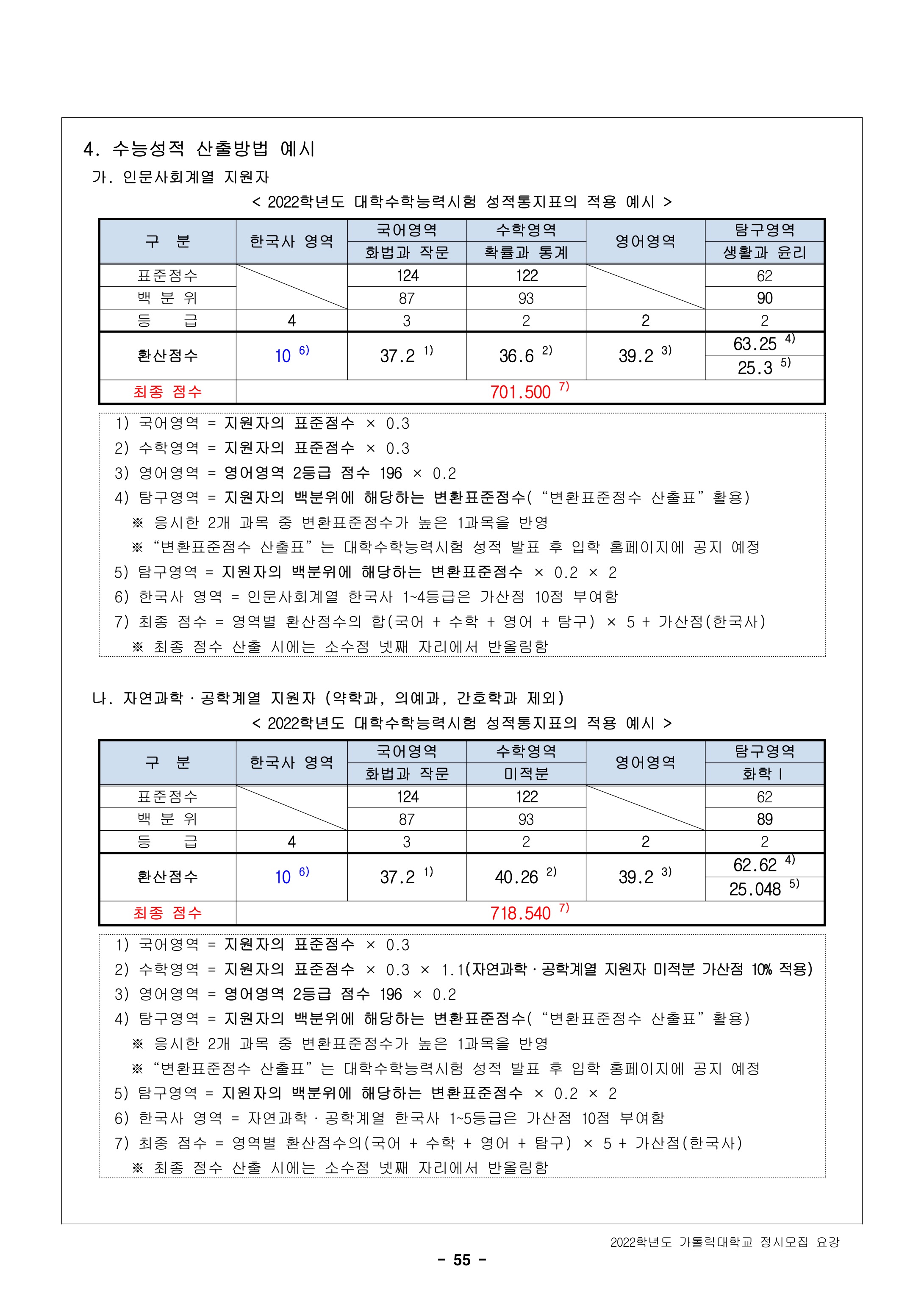 2022학년도 가톨릭대학교 대학수학능력시험 성적 반영방법