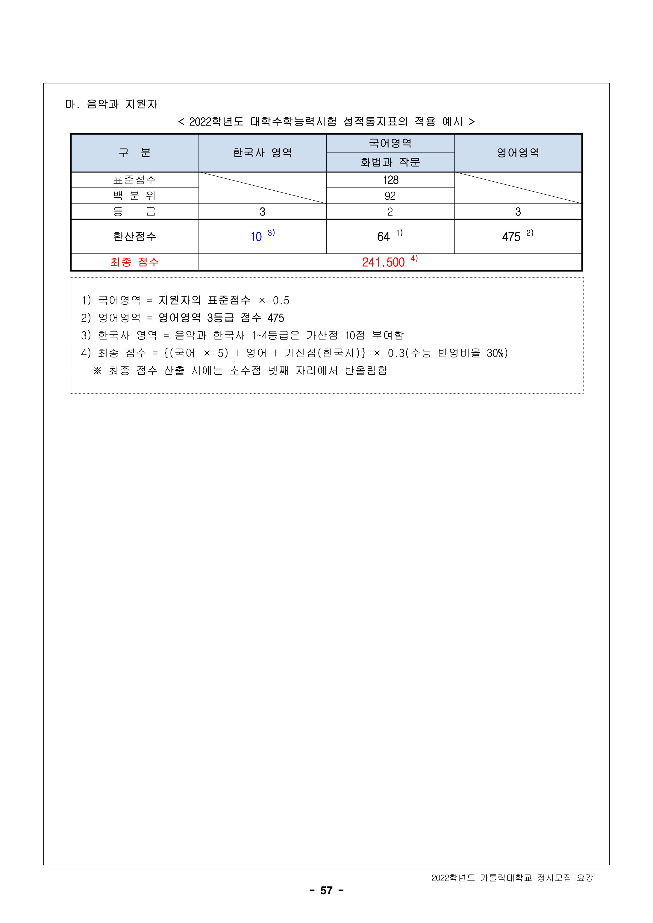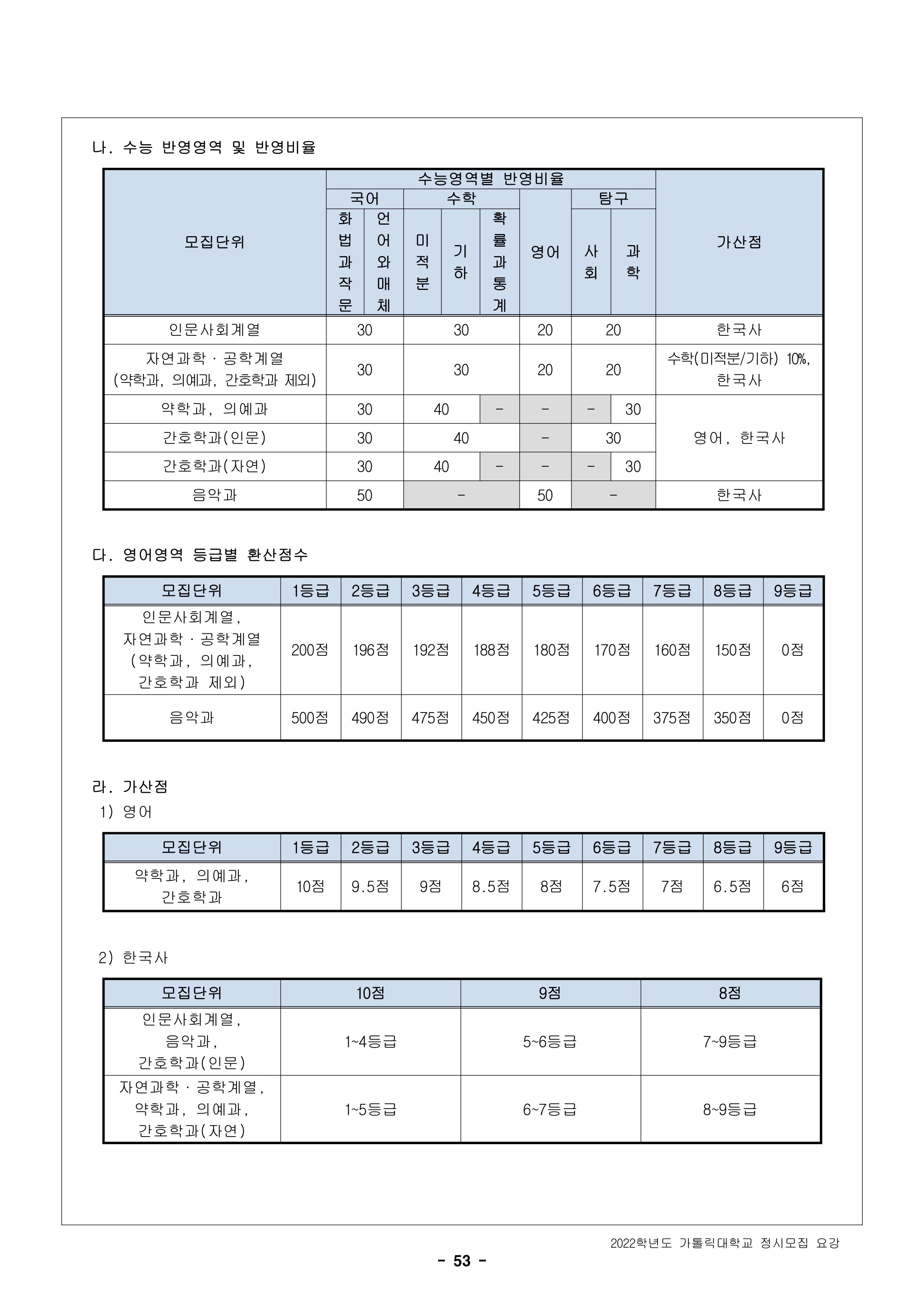 2022학년도 가톨릭대학교 대학수학능력시험 성적 반영방법 2022학년도 가톨릭대학교 정시등급
