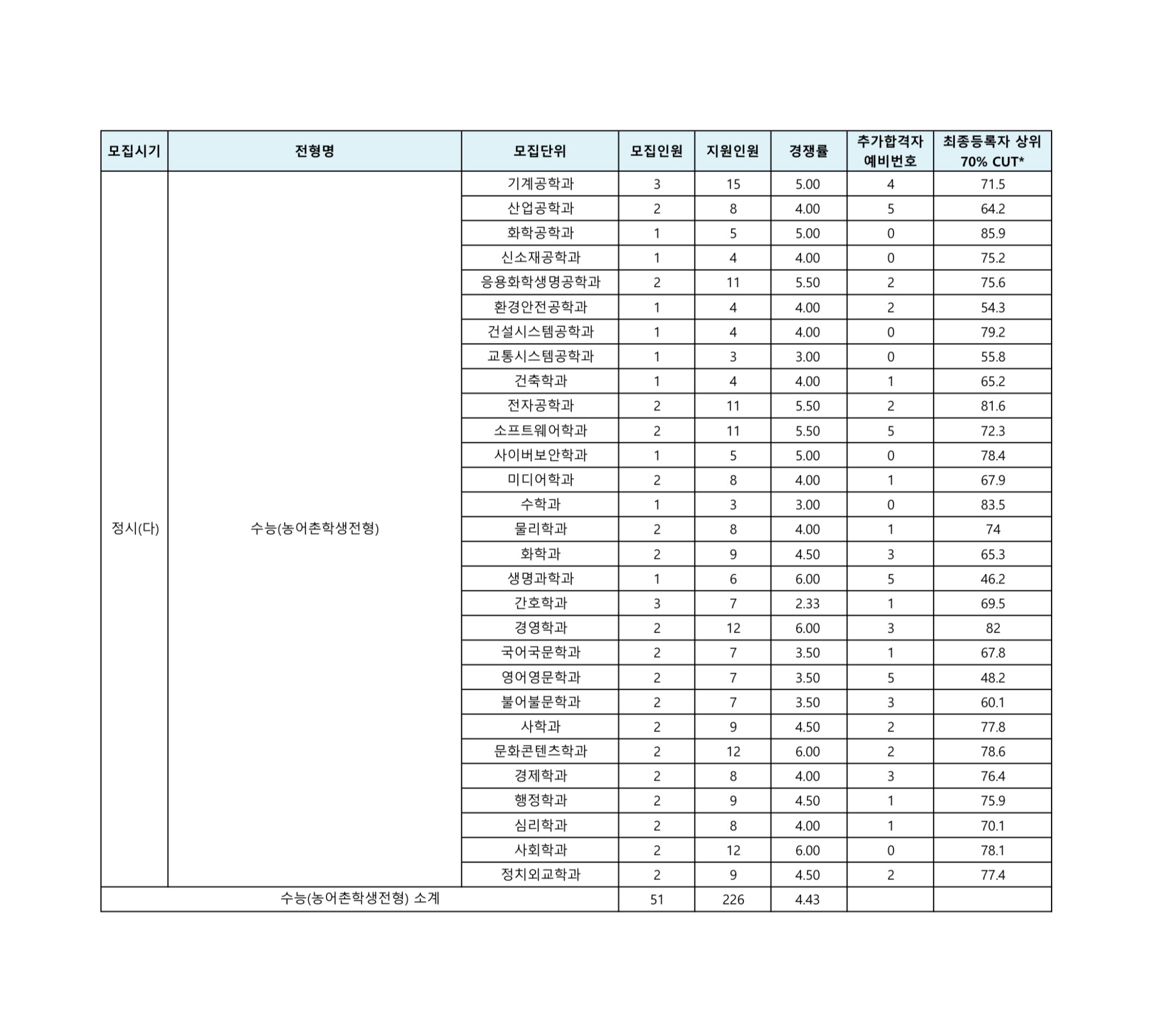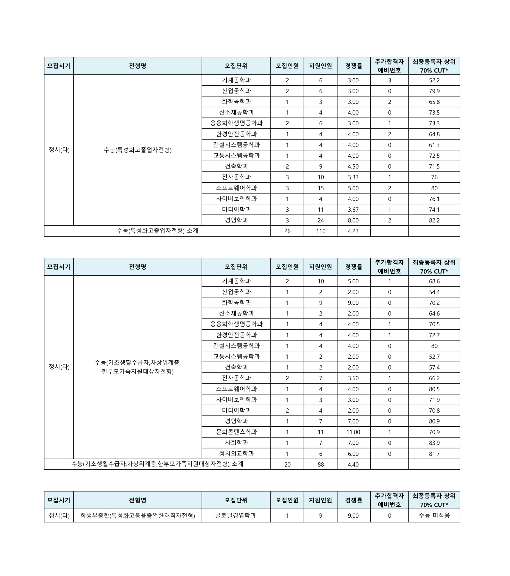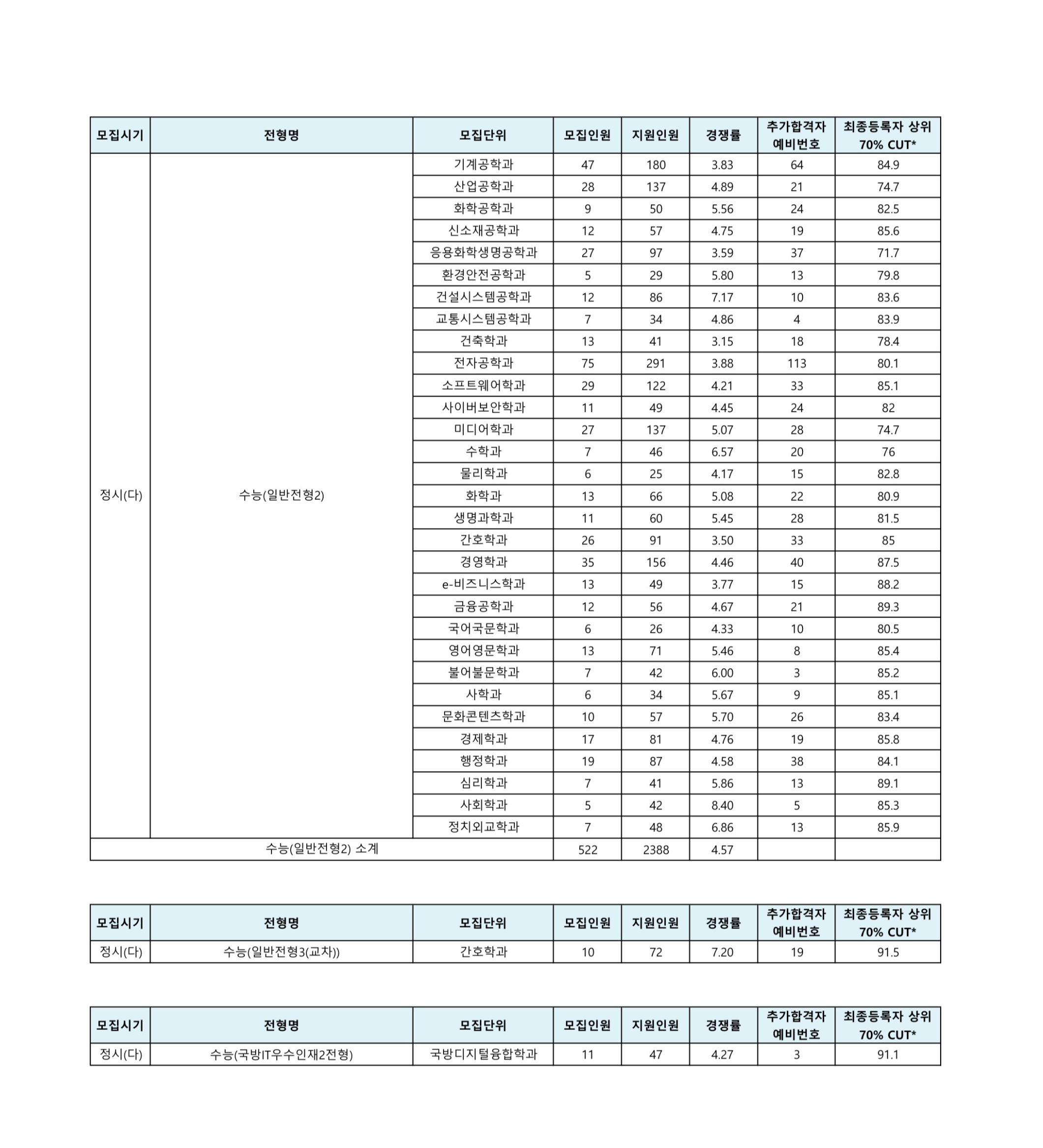 (수능)국어 수학 탐구 평균 다군 기계공학과 47 3.83 64 890.9X 1,000 80 79 82 82.33 산업공학과 28 4.89 21 879.2X 1,000 80 75 80 81.00 화학공학과 9 5.56 24 897.1X 1,000 80 88 86 84.67 신소재공학과 12 4.75 19 895.9X 1,000 83 82 84.5 84.83 응용화학생명공학과 27 3.59 37 865.1X 1,000 78 68 76.5 76.83 환경안전공학과 5 5.80 13 868.7X 1,000 83 72 65 78.67 건설시스템공학과 12 7.17 10 881.9X 1,000 86 75 83.5 81.67 교통시스템공학과 7 4.86 4 887.4X 1,000 83 78 87.5 84.33 건축학과 13 3.15 18 874.5X 1,000 78 71 87 80.17 전자공학과 75 3.88 113 890.6X 1,000 80 79 81.5 83.00 소프트웨어학과 29 4.21 33 899.0X 1,000 88 82 84 85.50 사이버보안학과 11 4.45 24 891.4X 1,000 88 82 81.5 84.33 미디어학과 27 5.07 28 856.4X 1,000 80 68 74 75.00 수학과 7 6.57 20 855.6X 1,000 83 65 75.5 75.00 물리학과 6 4.17 15 881.2X 1,000 76 78 73.5 80.50 화학과 13 5.08 22 889.6X 1,000 83 79 82 82.17 생명과학과 11 5.45 28 882.3X 1,000 89 65 83.5 80.83 간호학과 26 3.50 33 895.3X 1,000 85 79 81.5 83.67 경영학과 35 4.46 40 914.3X 1,000 78 92 74.5 83.33 e-비즈니스학과 13 3.77 15 914.2X 1,000 80 92 77 84.17 금융공학과 12 4.67 21 922.7X 1,000 82 96 78.5 85.17 국어국문학과 6 4.33 10 898.1X 1,000 83 77 77.5 82.33 영어영문학과 13 5.46 8 897.1X 1,000 82 80 80 82.33 불어불문학과 7 6.00 3 895.5X 1,000 80 80 84 82.50 사학과 6 5.67 9 894.3X 1,000 83 86 82 83.67 문화콘텐츠학과 10 5.70 26 902.7X 1,000 89 80 80 84.17 경제학과 17 4.76 19 902.3X 1,000 86 80 81.5 84.50 행정학과 19 4.58 38 894.6X 1,000 85 80 81.5 82.50 심리학과 7 5.86 13 913.1X 1,000 88 86 88 88.00 사회학과 5 8.40 5 891.3X 1,000 83 78 89.5 86.17 정치외교학과 7 6.86 13 897.4X 1,000 85 80 81.5 84.00 일반전형3 구분 모집단위 모집