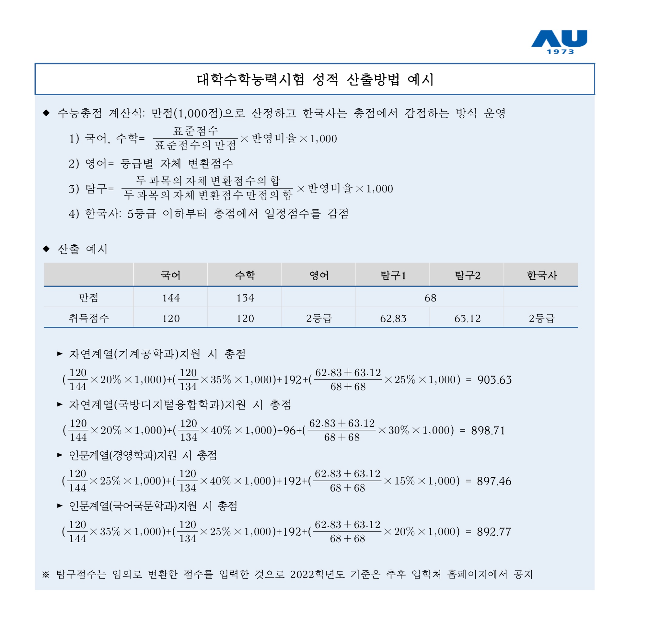 2022학년도 아주대학교 대학수학능력시험 반영방법 2022학년도 정시모집 입시결과 참고용 계산자료