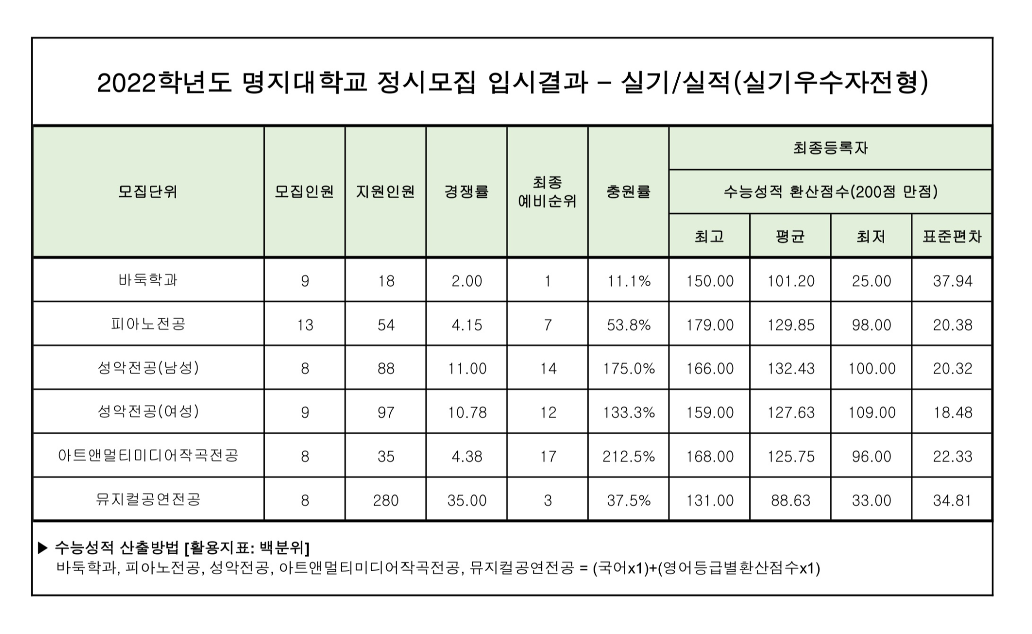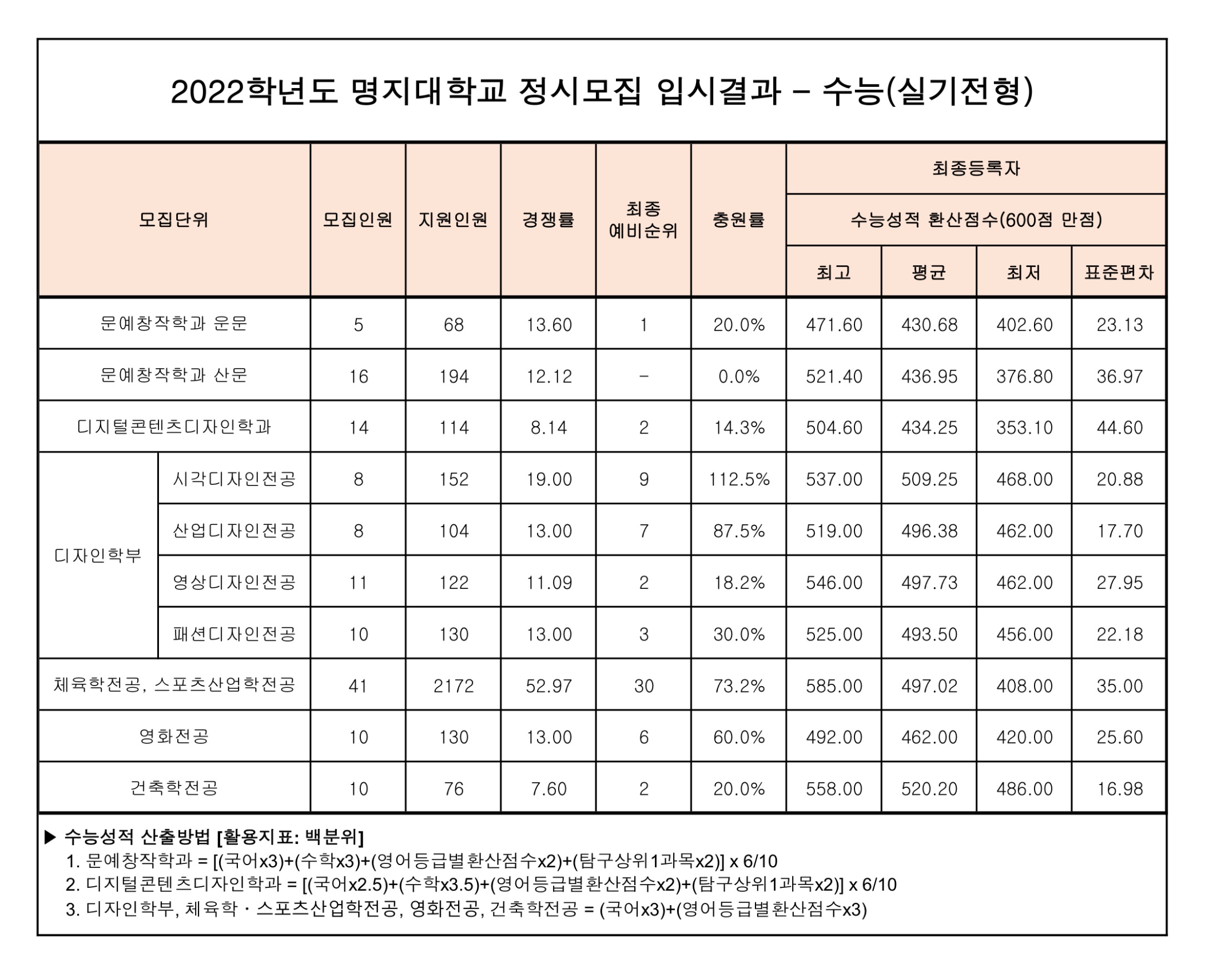 2022학년도 명지대학교 수능(실기전형) 정시등급 2022학년도 명지대학교 실기/실적(실기우수자전형) 정시등급