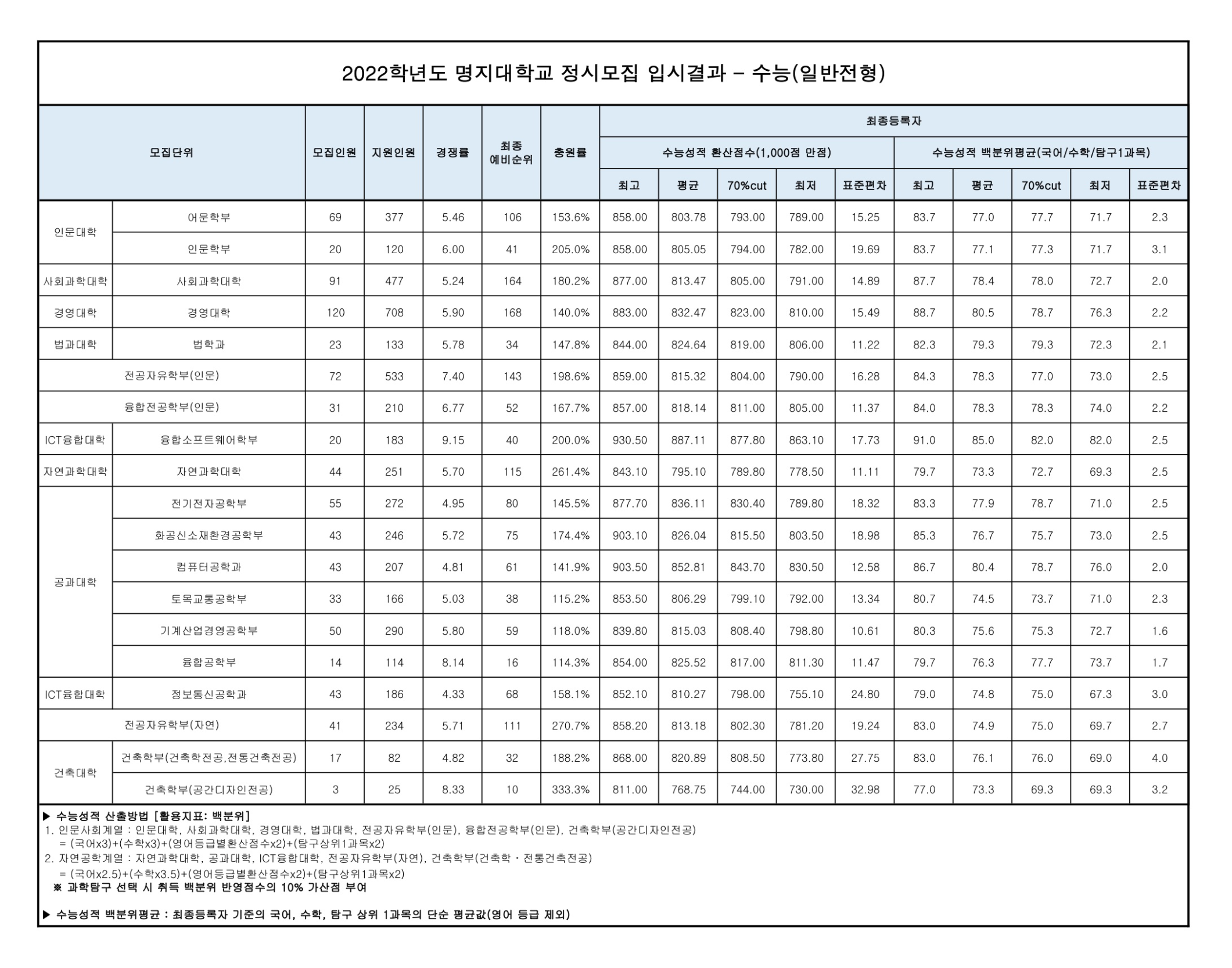 2022학년도 명지대학교 수능(일반전형) 정시등급 2022학년도 명지대학교 수능(실기전형) 정시등급