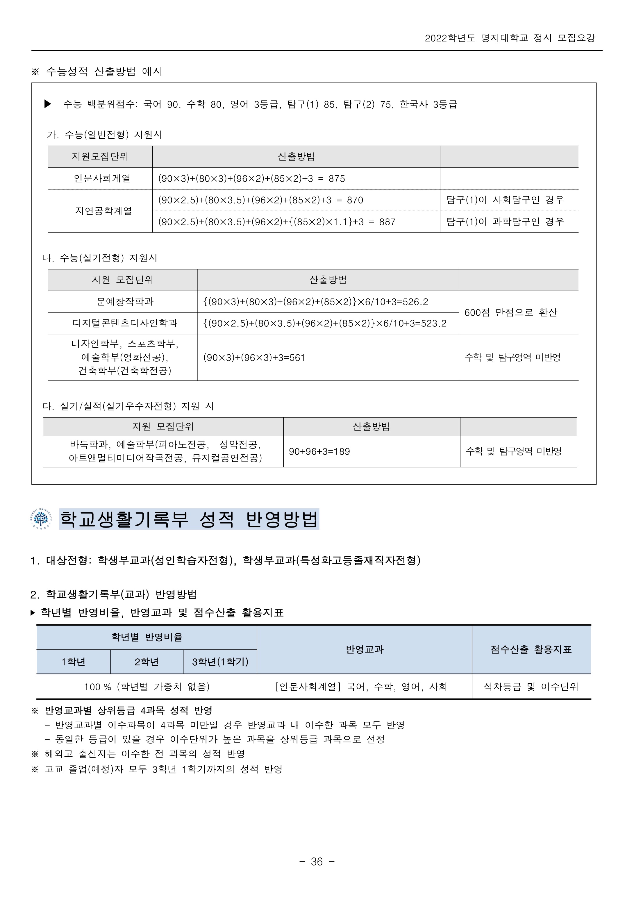 2022학년도 명지대학교 대학수학능력시험 반영방법 2022학년도 명지대학교 수능(일반전형) 정시등급